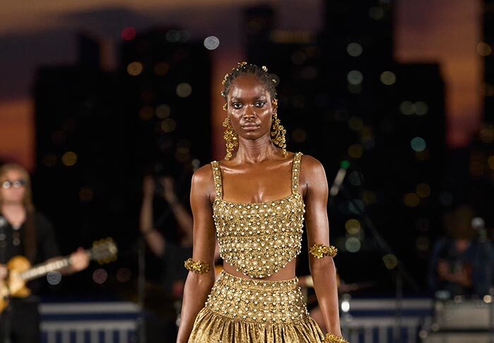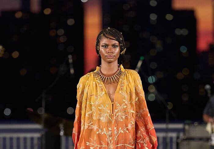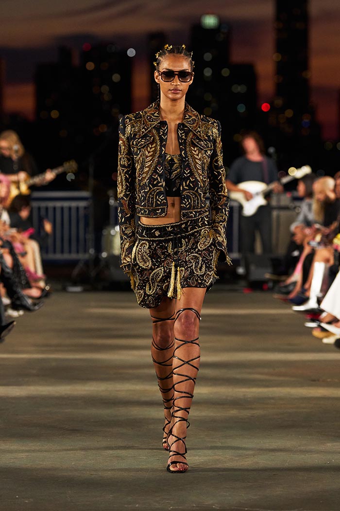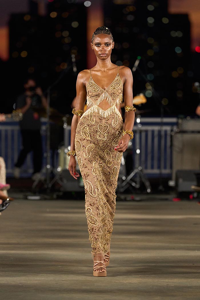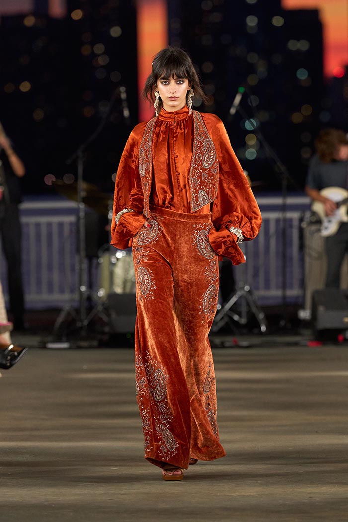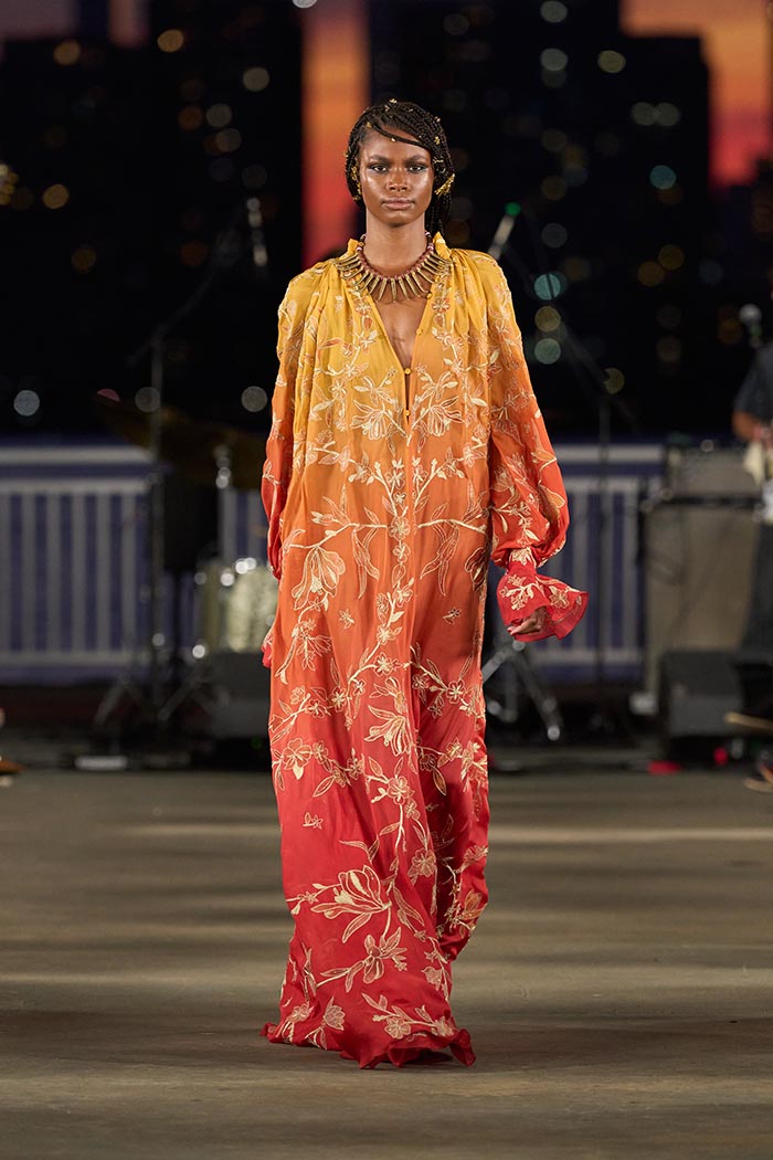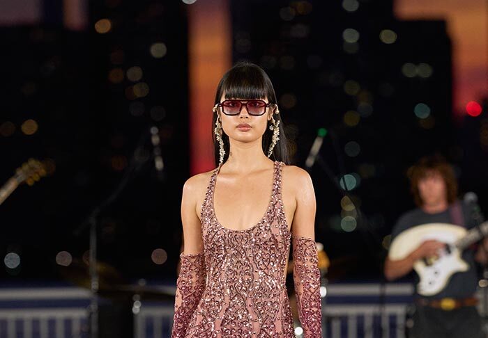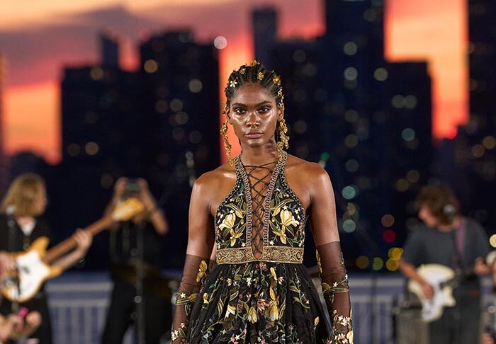 As the sun set over the Hudson at the Picnic House on Pier 40, the show unfolded with live music by New York based band, The Thing. Drawing from allegories and cultural touchpoints –Over the Hills and Far Away, Time and Fame by Veronese, Kashmir (1975), the portrait of Lady Meux, and Fools in the Rain –the collection explores themes of romance, longing, and an unrelenting pursuit of beauty, carrying forward Cucculelli Shaheen’s singular aesthetic.
