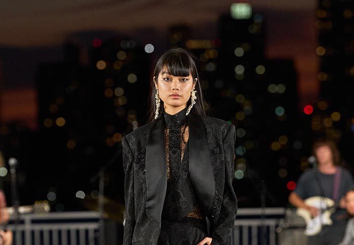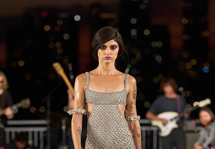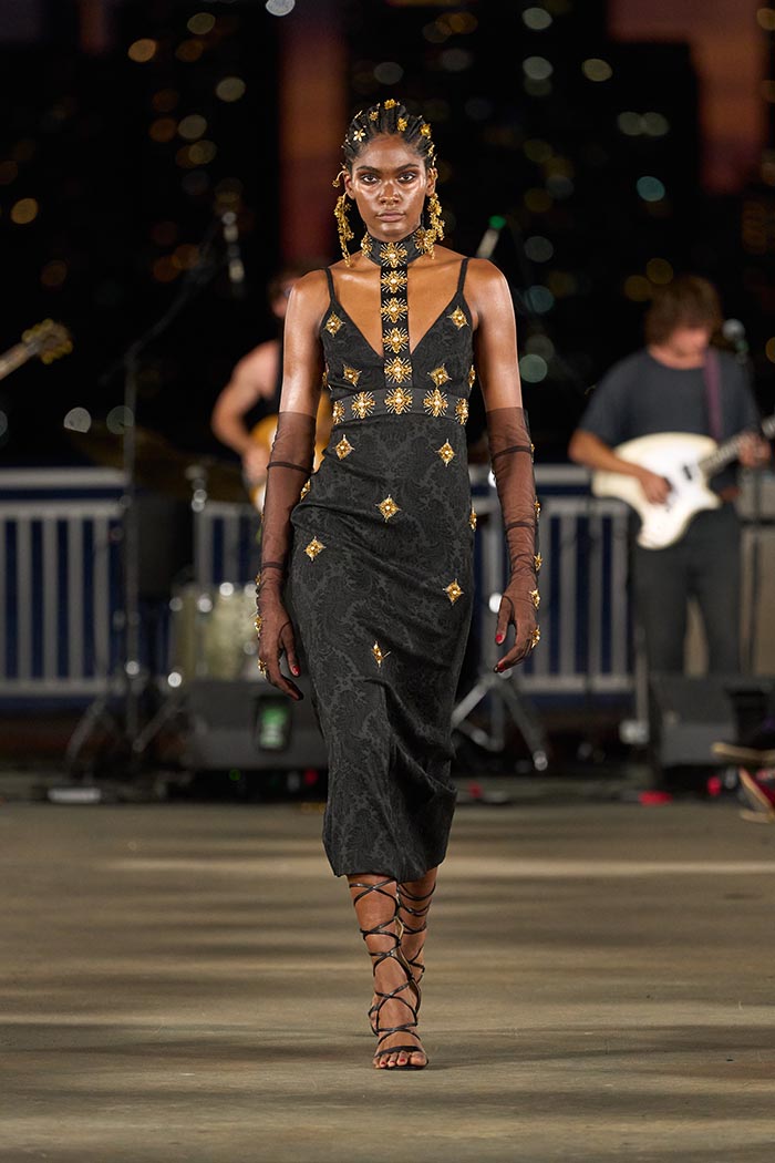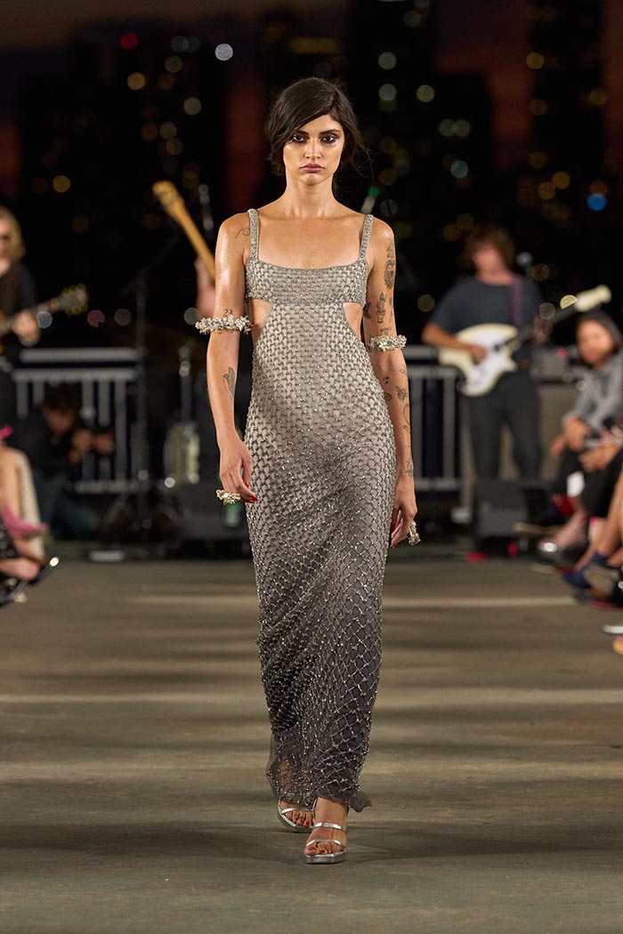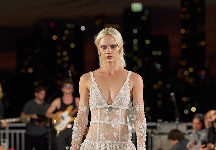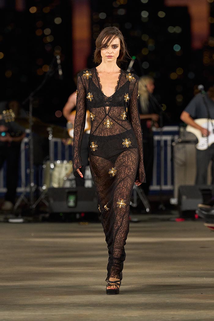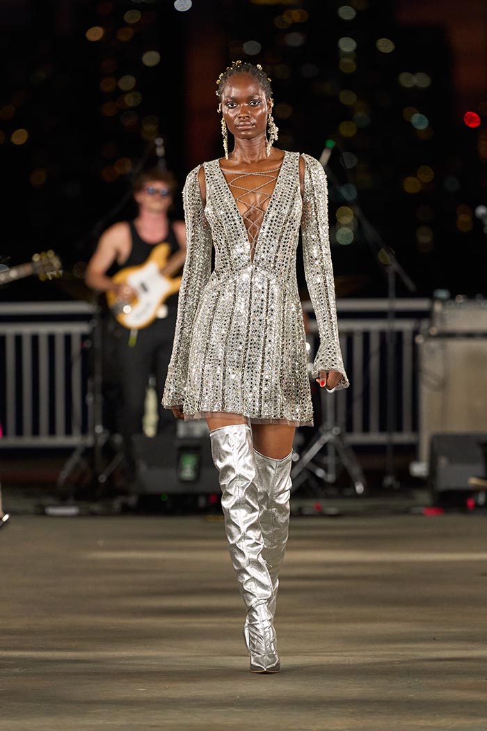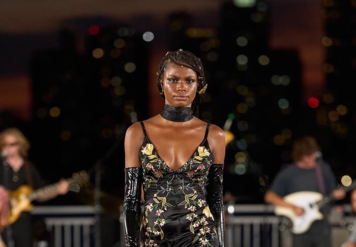The atmosphere amplified the vibrancy of the designs, underscoring the bold and dynamic vision of designers Anna Shaheen and Anthony Cucculelli. The Thing’s raw, rock-and-roll energy carried the momentum of the runway, weaving music and fashion together into a shared rhythm of romance and rebellion.