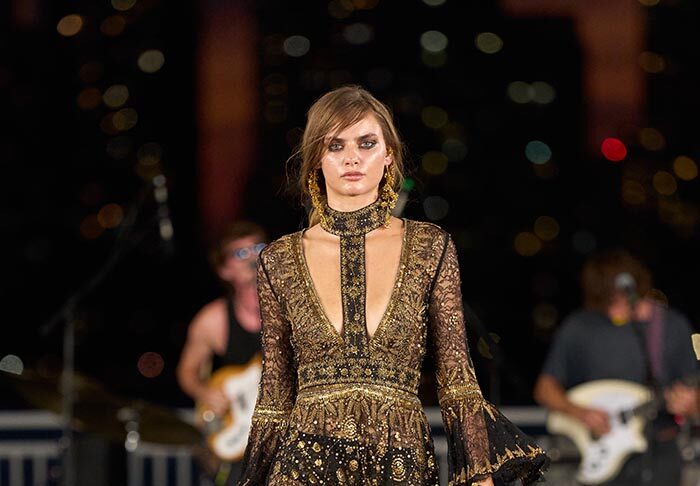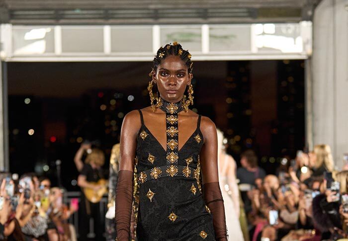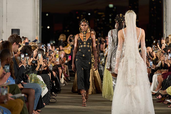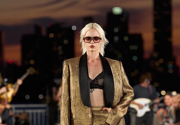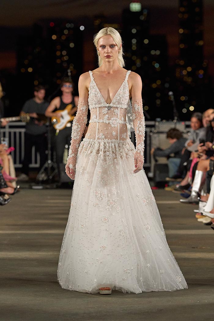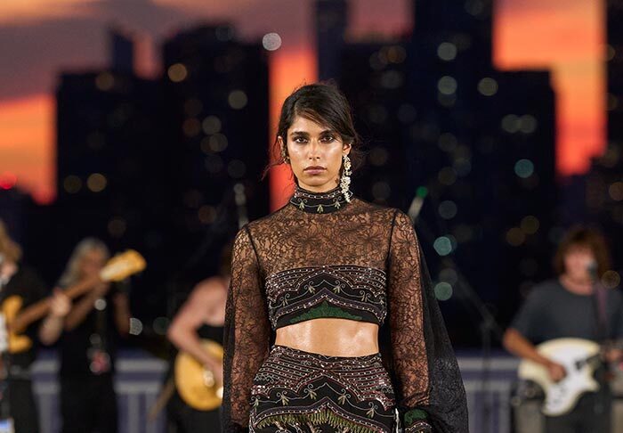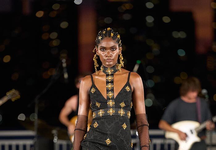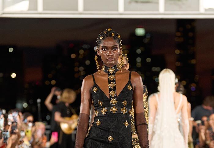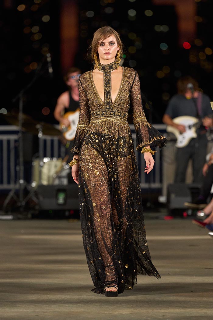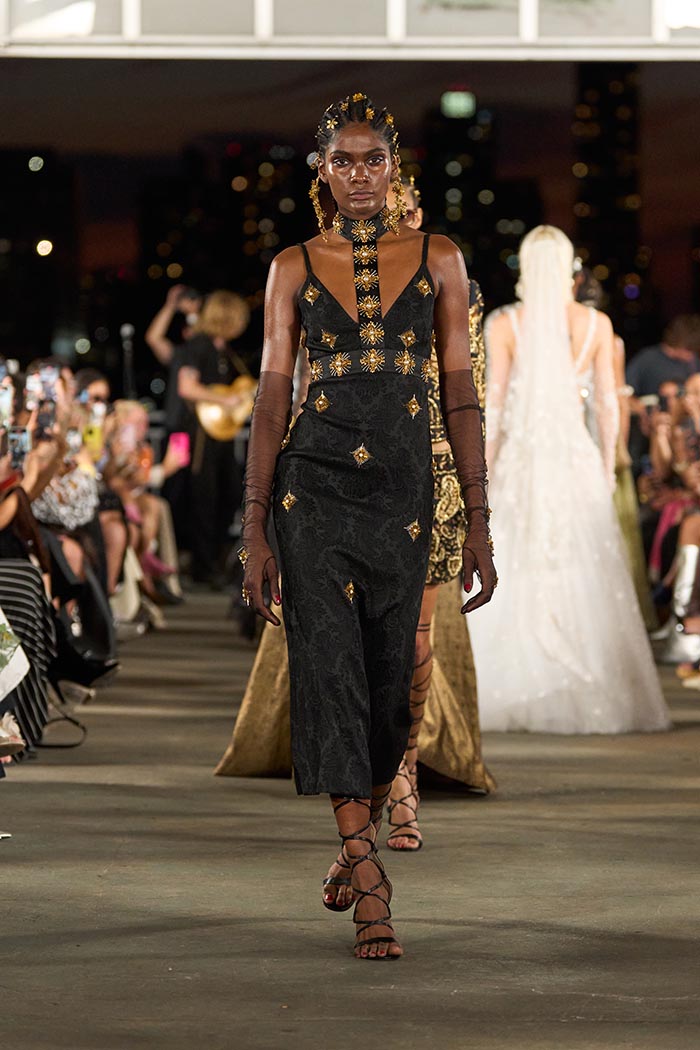 The atmosphere amplified the vibrancy of the designs, underscoring the bold and dynamic vision of designers Anna Shaheen and Anthony Cucculelli. The Thing’s raw, rock-and-roll energy carried the momentum of the runway, weaving music and fashion together into a shared rhythm of romance and rebellion.