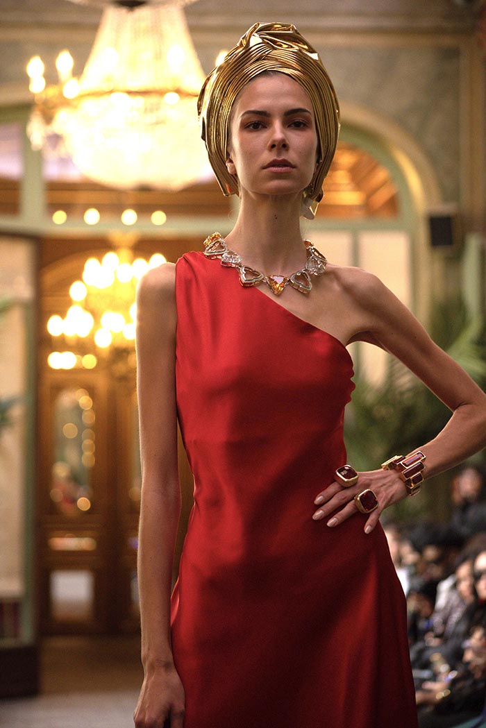 Hosted at the elegant La Galerie Bourbon, the runway came alive with a striking mix of accessories from contemporary scarves and architectural headpieces to intricate handbags, jewelry, and footwear. Accessories took on a defining role, transforming each ensemble into a cohesive narrative and reaffirming the essential role of craftsmanship in modern design.