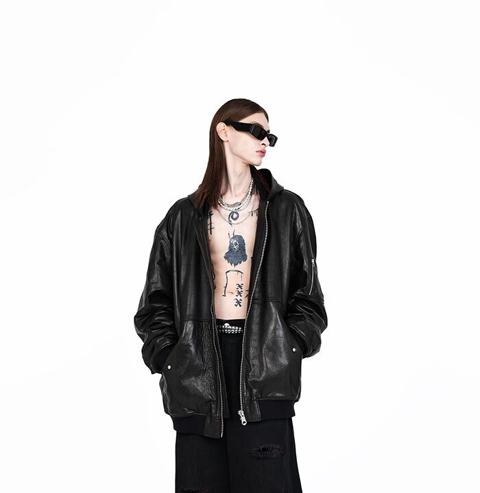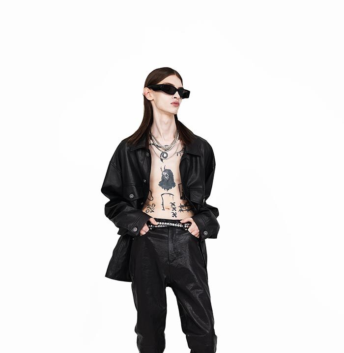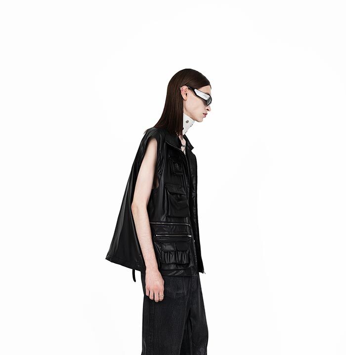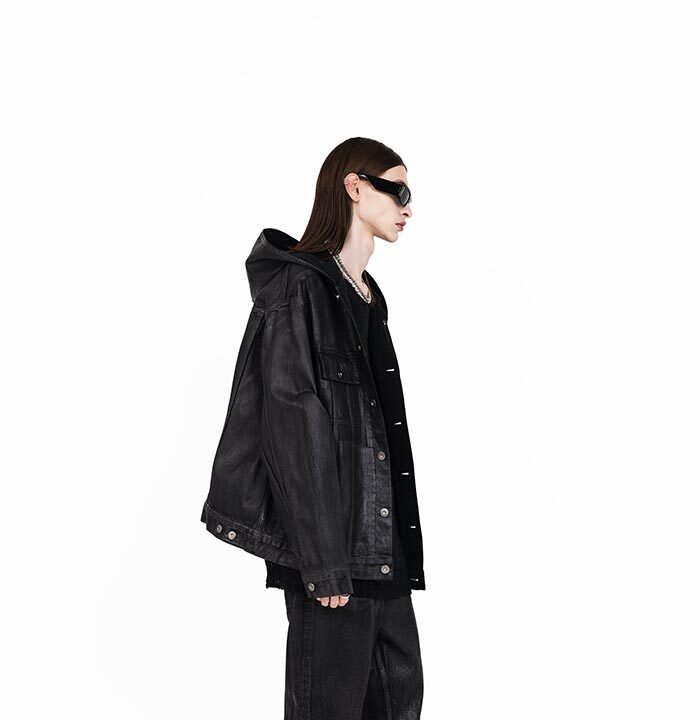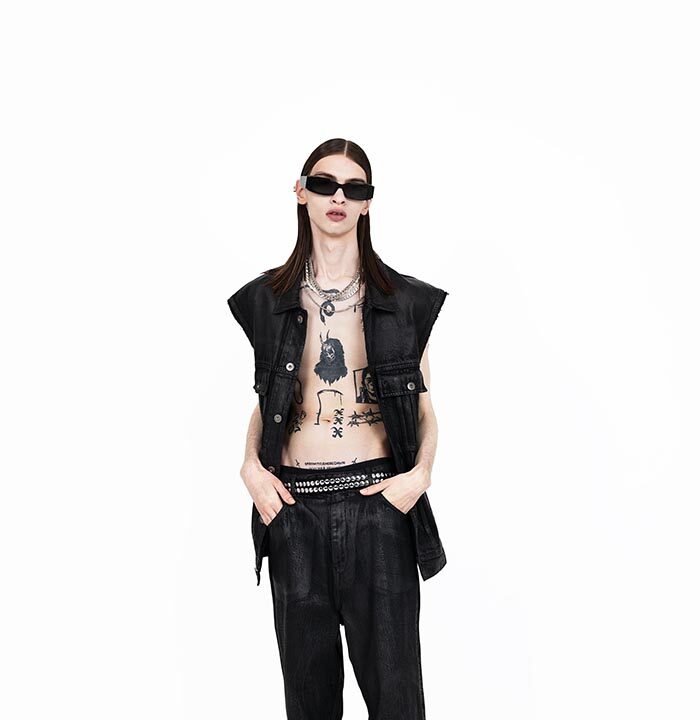 Functionality and durability is also significant in reflecting the need for functional fashion during the rave movement. The faux leather cargo vest, complete with a detachable sleeve and hood, offers versatility and adaptability. The oversized waxed denim hooded jacket seamlessly combines style with practicality, catering to the demands of the dance culture.