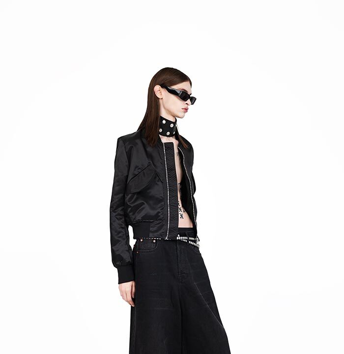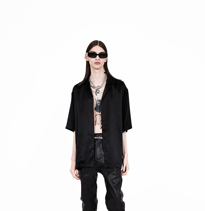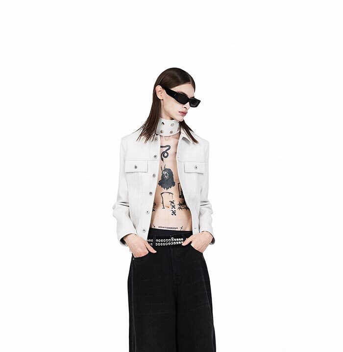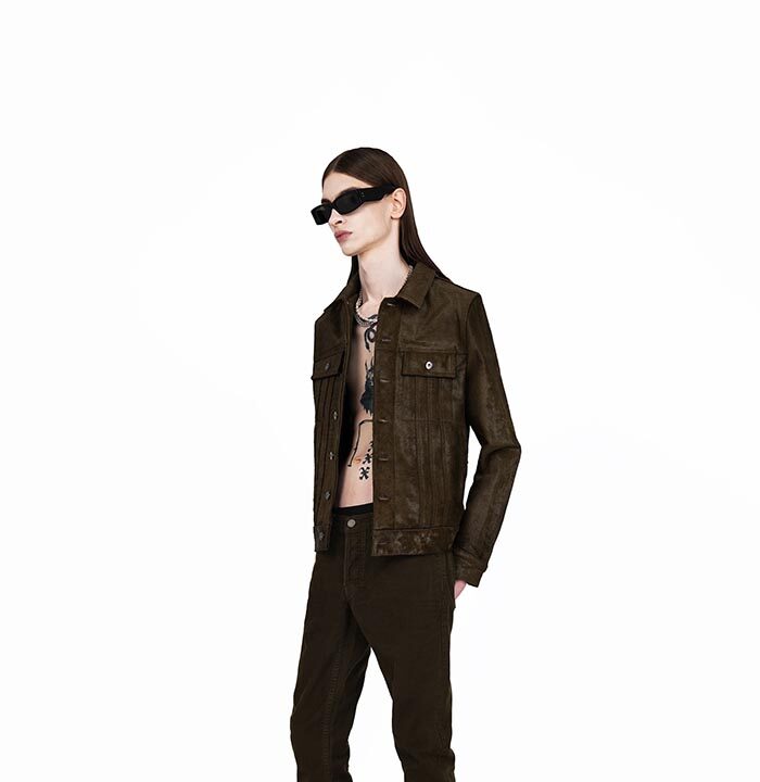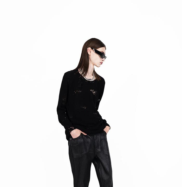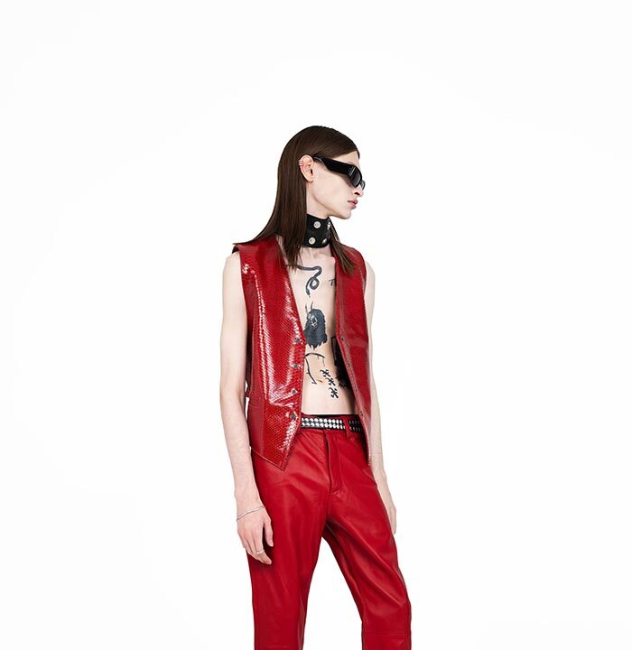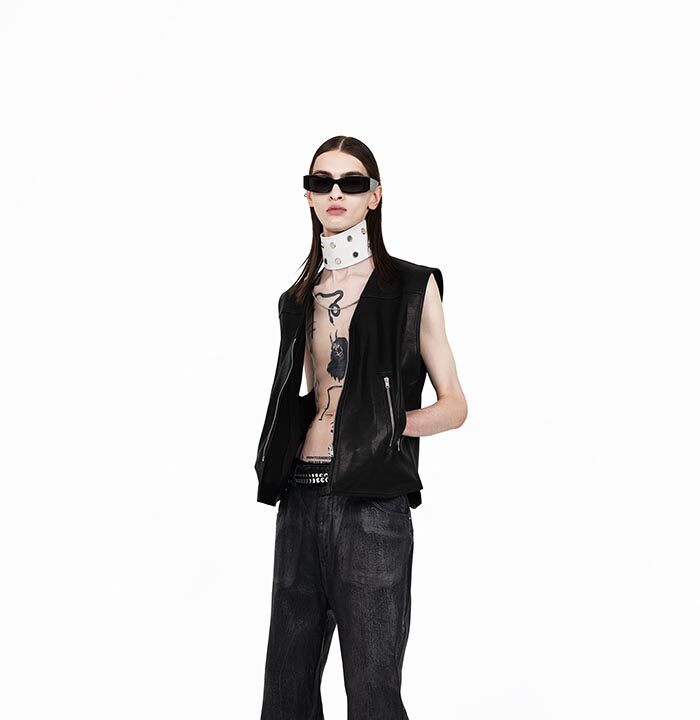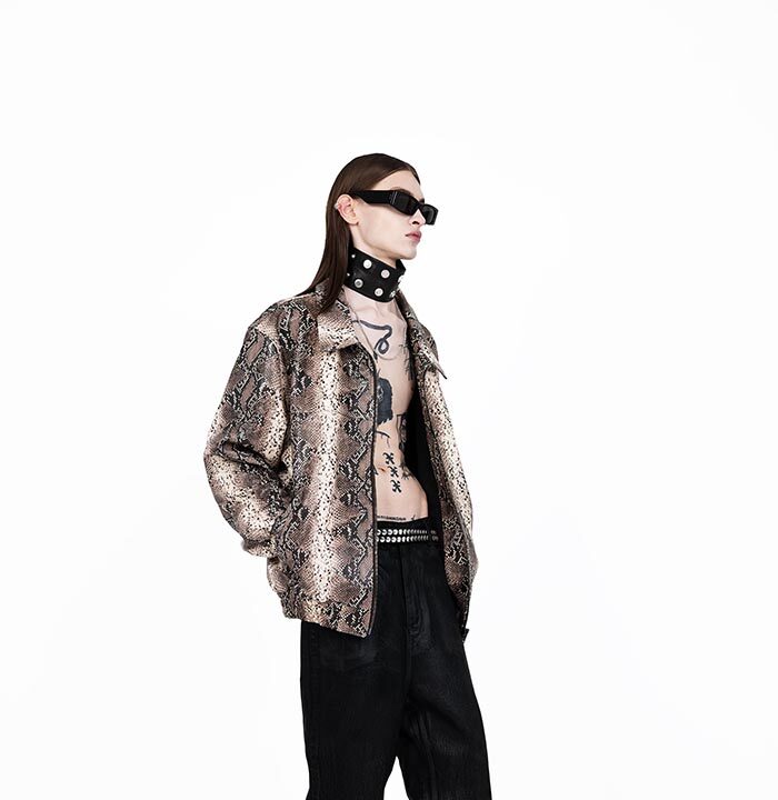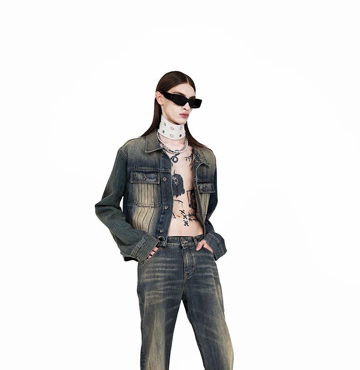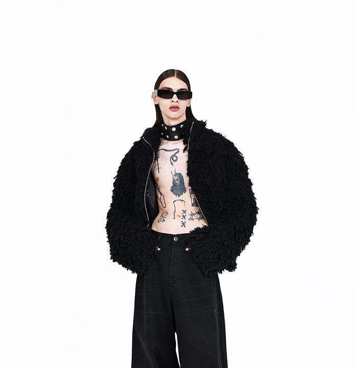 Masterfully blending refined couture with 90s streetwear fashion, the ‘Sleepless Night’ collection reflects the eclectic and rebellious style of the era. At its core are statement pieces such as hand-made denim fur jackets, calf hair denim-style jackets, python snakeskin embossed leather jackets, nubuck leather denim style jackets, and a daring red crocodile skin embossed leather vest. These pieces are artfully paired with wide-leg oversized jeans and waxed denim flared jeans, creating a fusion of sophistication and street edge. The ensemble is tastefully completed with 90s sports sunglasses inspired eyewear, adding a touch of nostalgia and edge. Notably, the collection also features a grunge and destroyed sweater, embracing the edgy and rebellious spirit of the 90s.