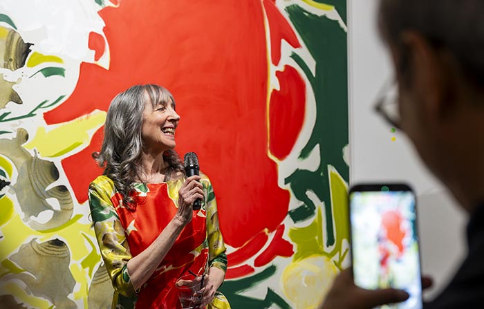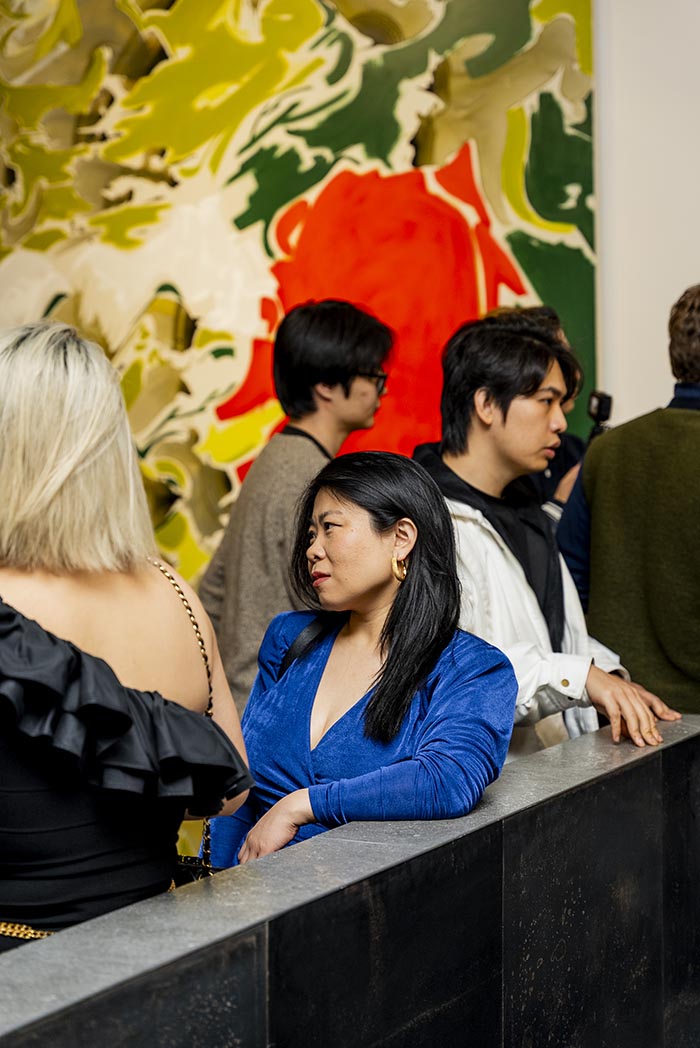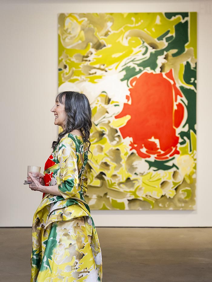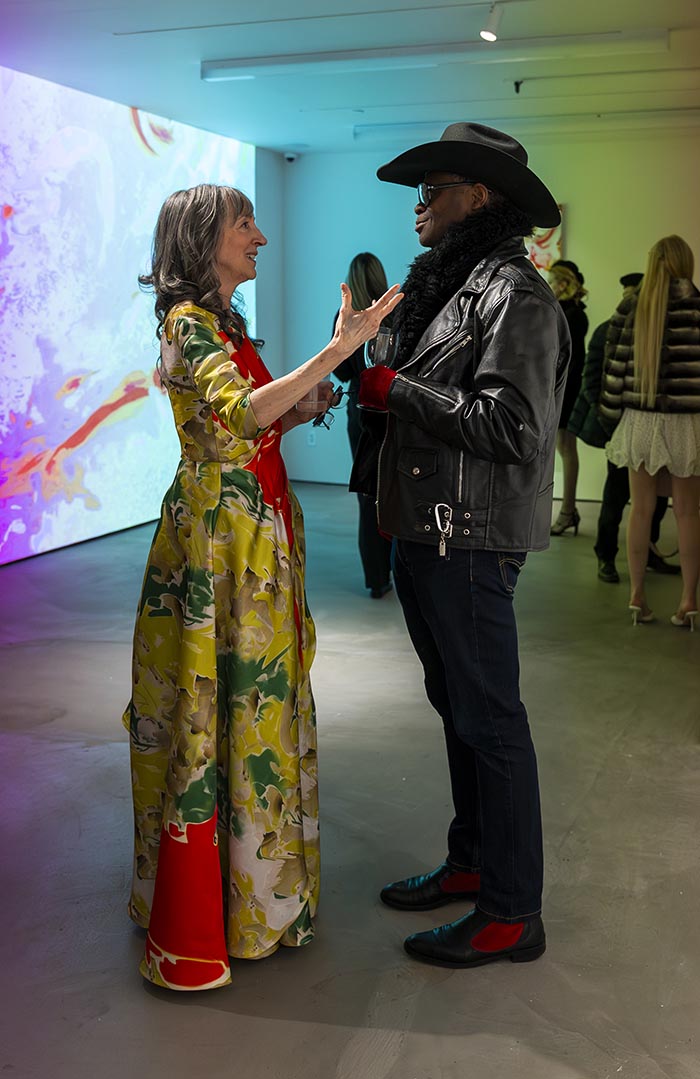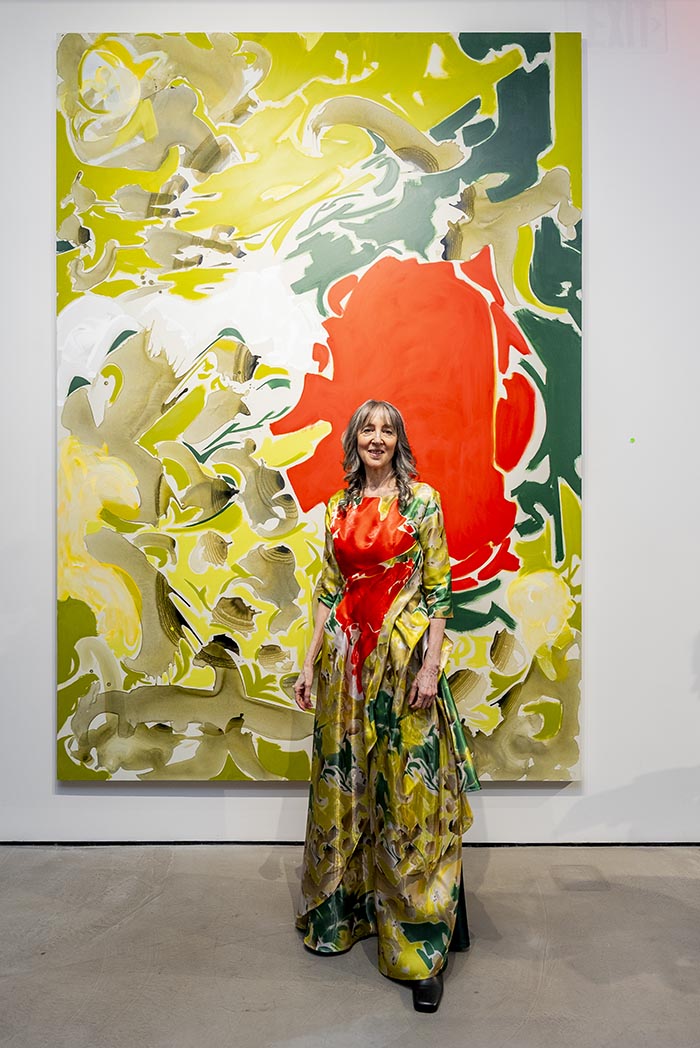 Yet perhaps the most editorially compelling moment of the evening bridged painting and fashion. In a striking gesture, Green transformed one of her paintings into a couture garment — a flowing dress that translated pigment and movement into fabric and silhouette. The piece was not merchandise, nor novelty. It was a continuation of the canvas — abstraction draped in motion. The chromatic intensity and gestural rhythm of her brushwork wrapped the body, turning the wearer into a living extension of the artwork itself.