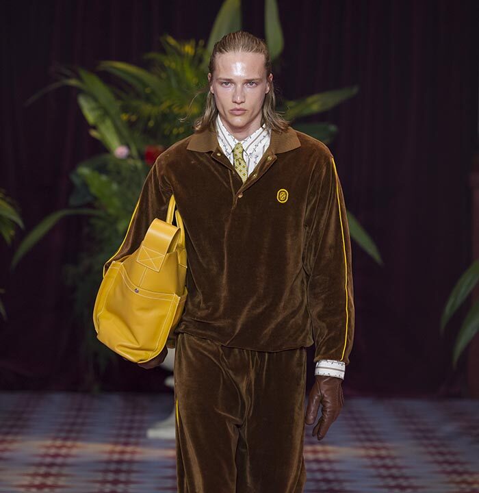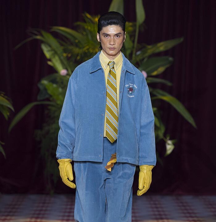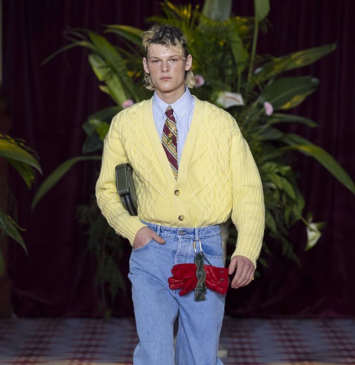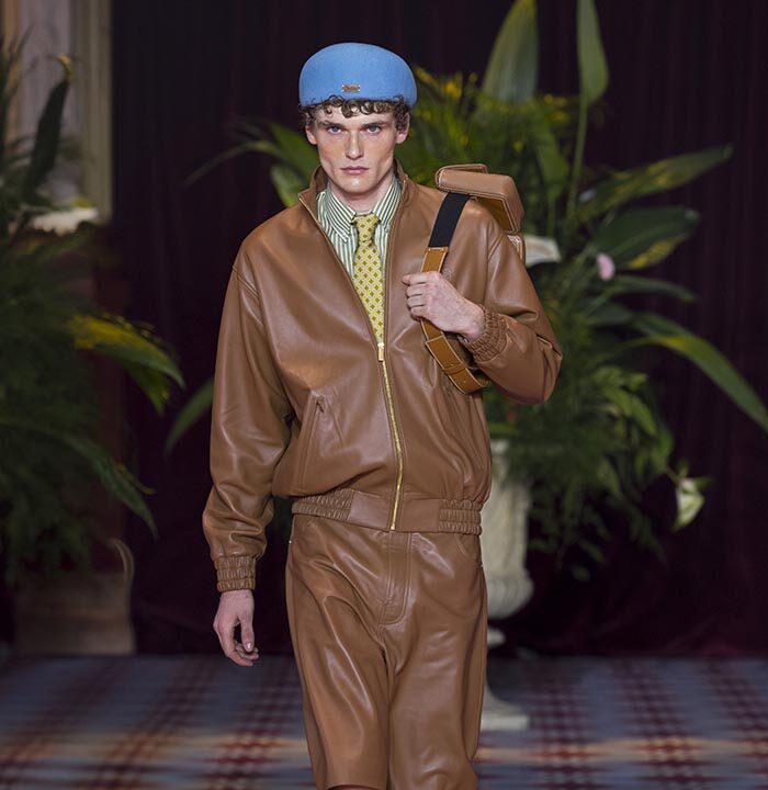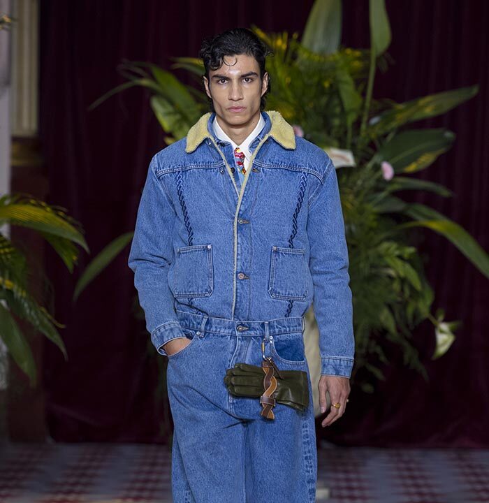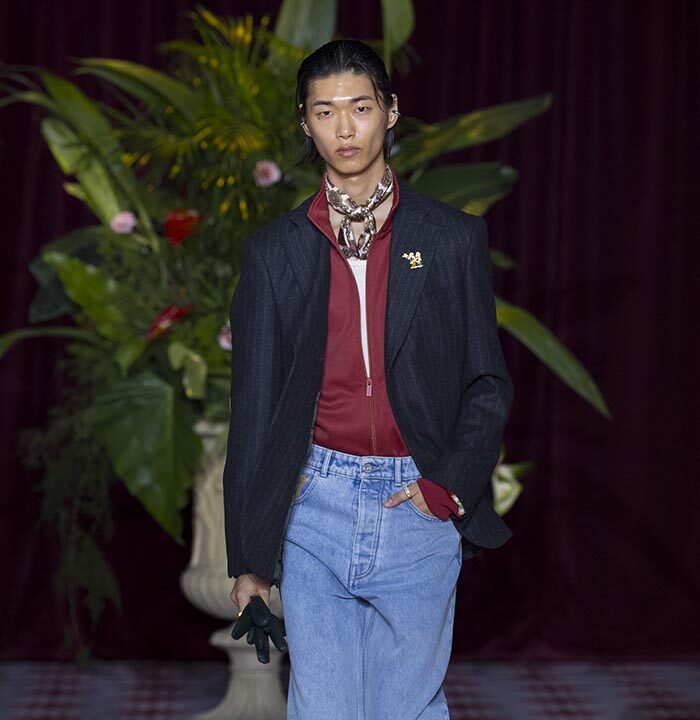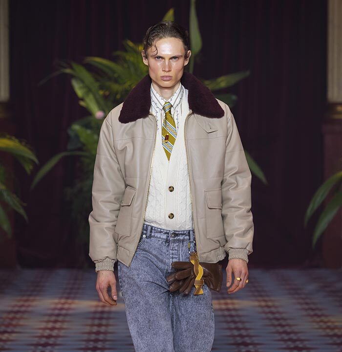 Openly versatile, the silhouettes are an ode to a blissful past: memories, real or imagined, create influences that are woven together, connecting and building on each other in an intentional mix of genres. A full denim look, macadam cowboy-style, contrasts with a head-to-toe Studio 54-inspired attire. Ties and gloves are a common thread, adding final touches that oscillate between the old-fashioned and the post-gangster. The allure is falsely preppy, worn with an over-the-top swagger. Mongiardino’s signature opulence makes a couple of appearances, a reminder that there can be beauty in exaggeration.