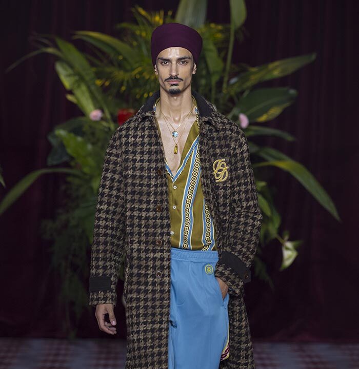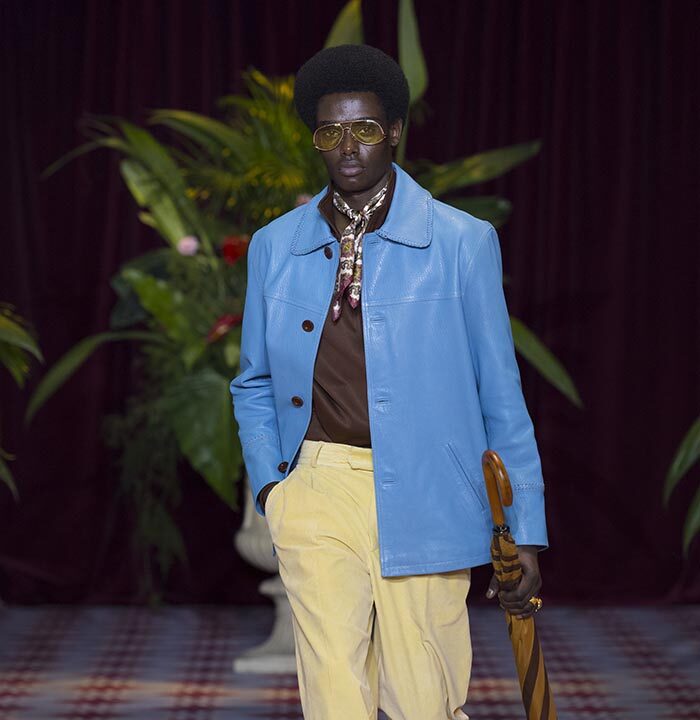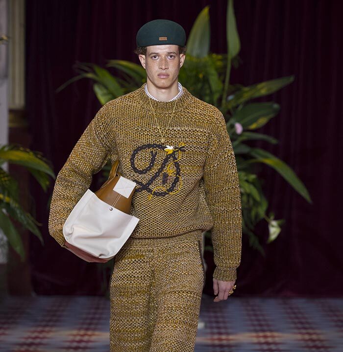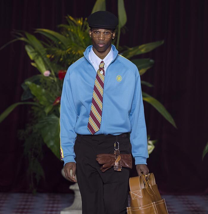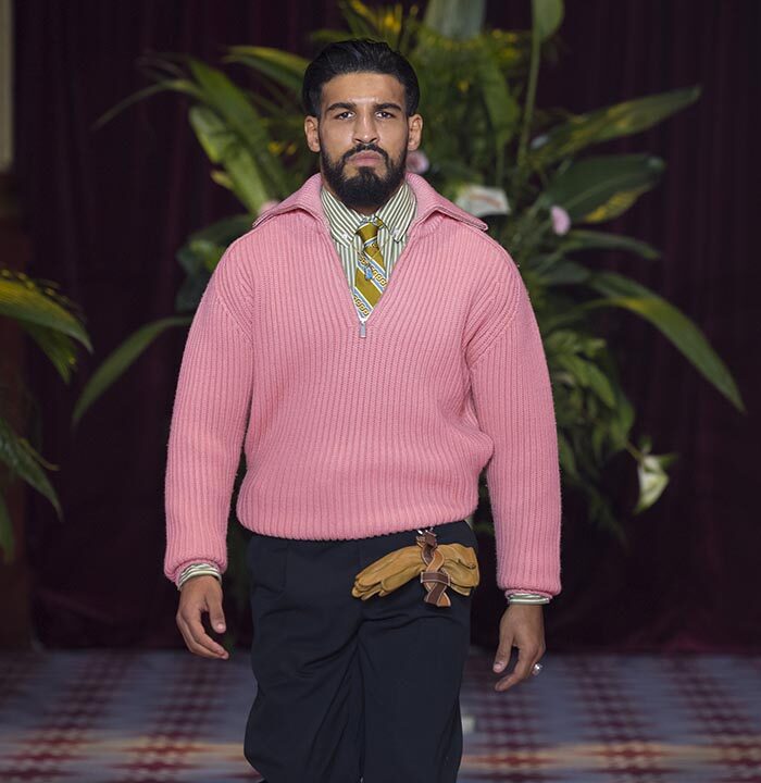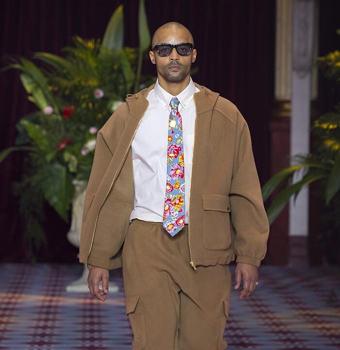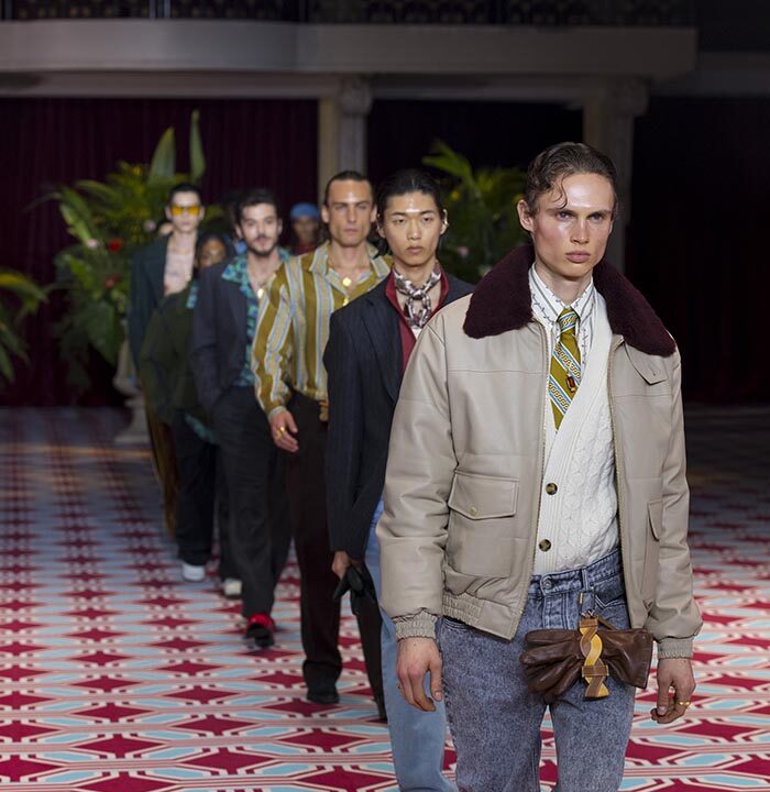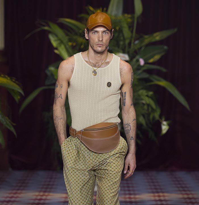 Openly versatile, the silhouettes are an ode to a blissful past: memories, real or imagined, create influences that are woven together, connecting and building on each other in an intentional mix of genres. A full denim look, macadam cowboy-style, contrasts with a head-to-toe Studio 54-inspired attire. Ties and gloves are a common thread, adding final touches that oscillate between the old-fashioned and the post-gangster. The allure is falsely preppy, worn with an over-the-top swagger. Mongiardino’s signature opulence makes a couple of appearances, a reminder that there can be beauty in exaggeration.