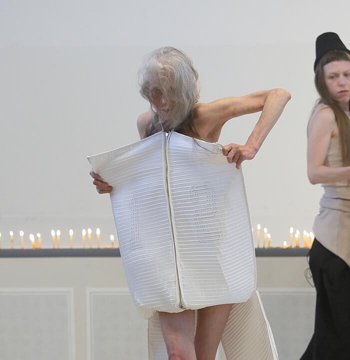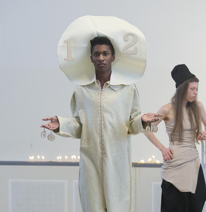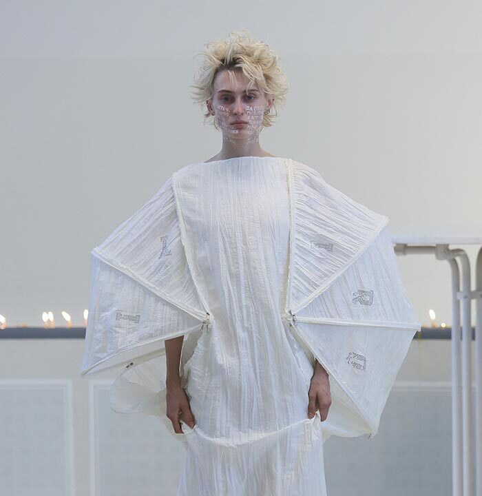 The ascetic setting of the performance invites us to witness the Last Supper mystery, in a metamodernist interpretation. Allegoric conventionalism of movements and the semi-interactive format create the sensation of a spiritual initiation, as designer Irina Dzhus translates the thought-provoking narratives of the “ANTICON” collection, presenting a range of innovative multipurpose outfits. The location choice could not be more symbolic: the DZHUS show is taking place at the Kabbalah Centre Berlin. The allegoric decorations DZHUS imposes in the pure, futuristic space, are missioned to raise questions and accumulate the anticipation of the act. DZHUS plays a tricky intellectual game with its audience: having shown, in fact, nothing else but abstract minimalism and opted out of dramatic storytelling, the conceptual brand succeeds in stimulating a range of associations on the verge of conventionally acceptable.