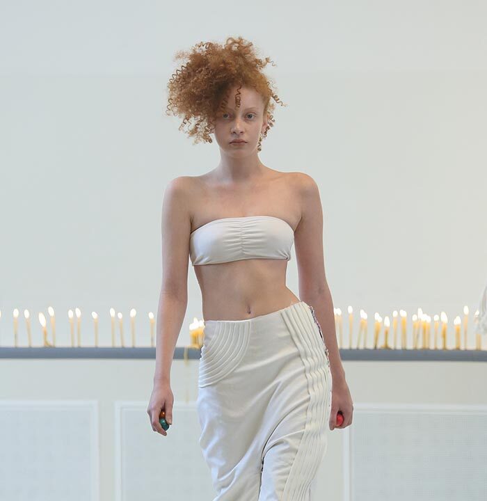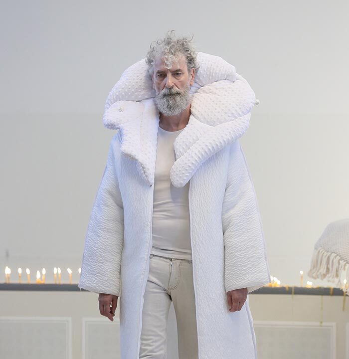 Irina Dzhus encodes the rainbow in blank, quilted surfaces. Leaving the garments’ outer layer pure, she embellishes pockets and lining with rhinestones and jewellery, commemorating her own experience of escaping the war in Ukraine through a tribute to the heartbreaking Holocaust stories. The labyrinth leitmotif is dedicated to the Sinai wanderers driven by a spirit of homecoming. Unexpectedly, colours pop from underneath the clothing, as DZHUS paints the ‘wrong’ side in the rainbow gradient. This ‘secret’ splash of pigments amidst the total white collection carries a life-asserting message, suggesting an insight as a route to home, joy, and therefore, fulfilment.