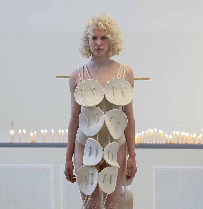 As she refers to Gnosticism, Kabbalah, Judaism, official and alternative Christian teachings, Irina Dzhus admits the burden of personal values and duties. Stoicism and self-sufficiency are translated through the ‘object = subject’ statement, embodied in multifunctional clothing items.