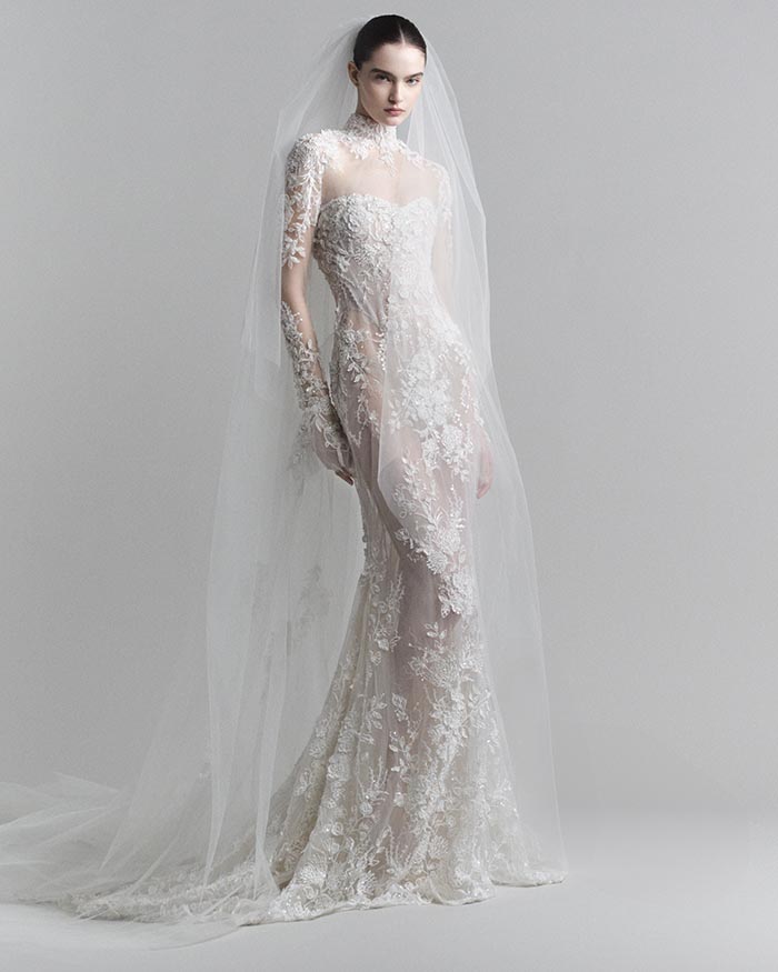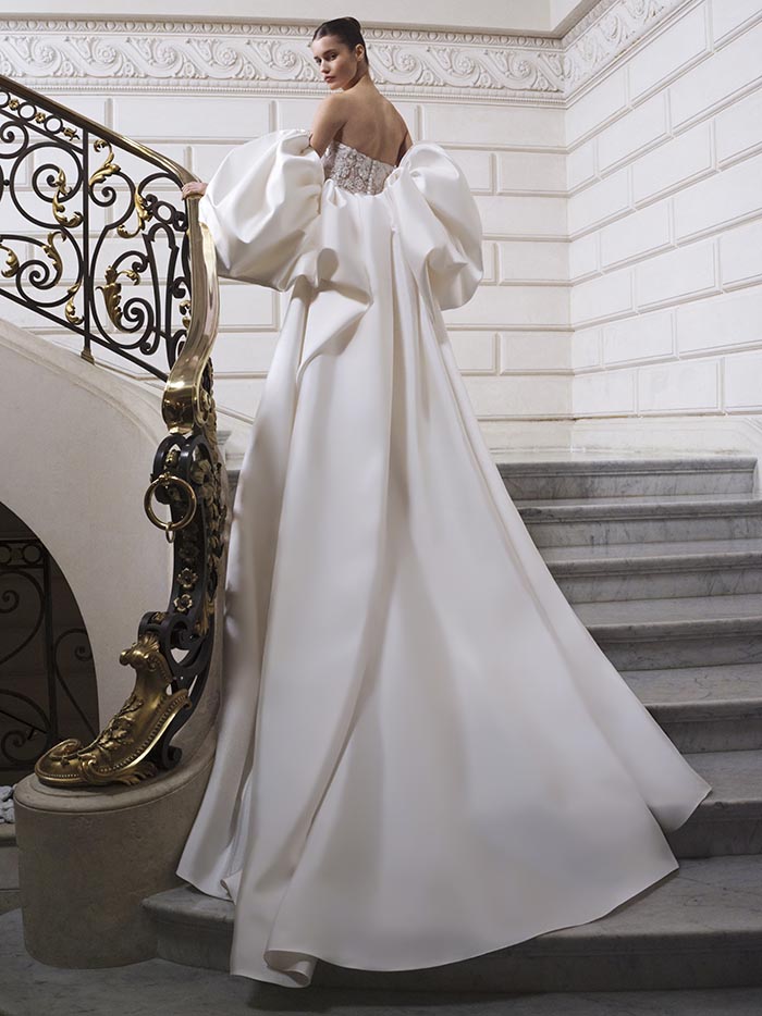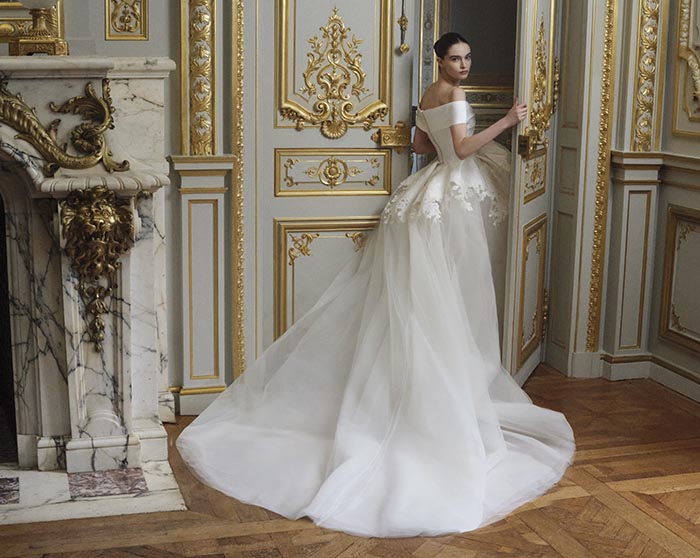 Posed in the opulence of a Parisian palace, each bride creates her own atmosphere, shaping a timeless story of beauty and strength. Delicate guipure lace lends fresh radiance to a classic ballgown. An ornate bodice with curved basque waist adds ultra-feminine allure to a pristine skirt. A sculptural mikado gown sheds its fishtail to reveal a showstopping, statuesque mini. And a transparent, embellished mermaid dress combines contemporary ease with pure romance.