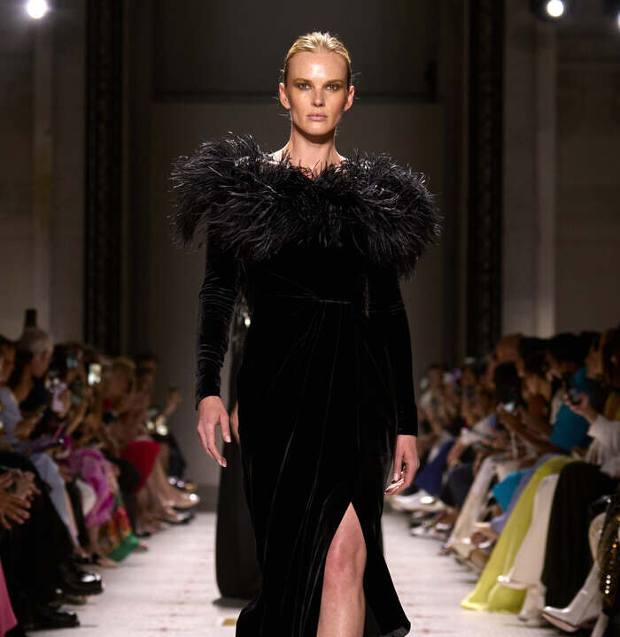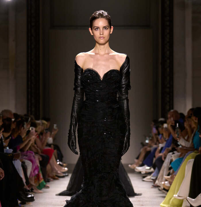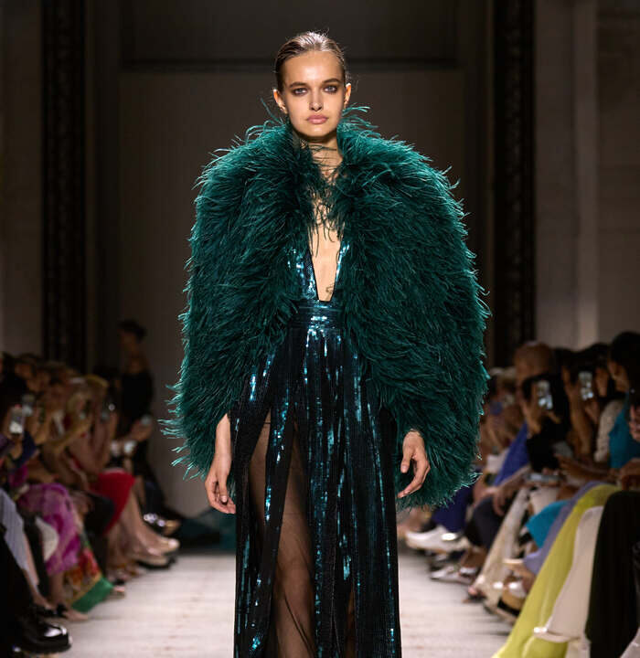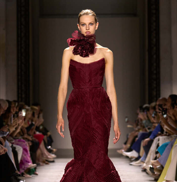 The entrancing tune weaves into a captivating spectacle of strikingly sleek silhouettes that dance with abstract motifs and the bold earthly tones of khokhloma. In long leather gloves, the enigmatic goddess conducts the music into atmospheres of soft velvet and glistening ocean blue. Shimmering beads and gold lurex embroidery intricately intertwine across strapless bustiers, like elaborated wood arches of ancient pagan temples. Resonant ruby organza ripple and wave into voluminous mermaid tales, while black satin cascades into sumptuous blossoming lapels that unfold like layers of matryoshka dolls. With a strong gesture of her hand, she commands the melodious tune to flutter from blackberry to orchid ostrich plumes.