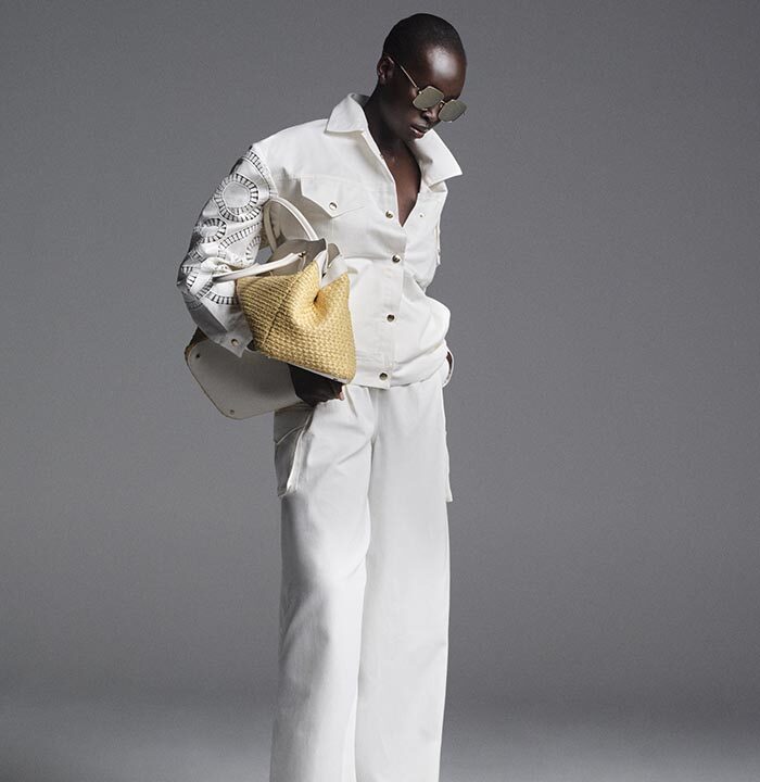 The refined atmosphere is underpinned by a selection of artful accessories. A voluminous tote conceals daily essentials; an envelope handbag looks impeccably put-together; a bamboo- inspired edition of the iconic Wave clutch provides striking grace. Belts add structure and polish, whether in the form of a sleek napa band or a delicate tasselled rope, while from morning to midnight, a long pendant necklace offers a subtle gleam of gold.