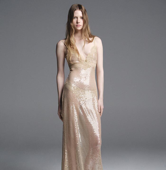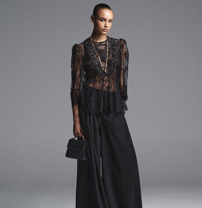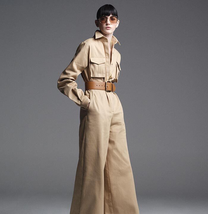 At the heart of this collection lies the art of insouciant layering. A safari midi-skirt acquires feminine edge when teamed with an oversized leather jacket, a fine nude knit and the barest flash of lace. A classic tonal duo — camel blazer, matching vest — becomes youthful worn with low-rise denim and flat sandals. Meanwhile, statement trousers provide a strong foundation for a shapeshifting schedule. Extreme wide-legs pair with a slouchy sweater for expeditions and a camisole for cocktails, while capris channel timeless chic with an off-shoulder top and peep-toe mules.