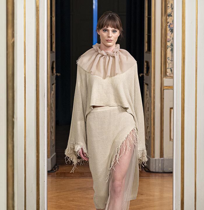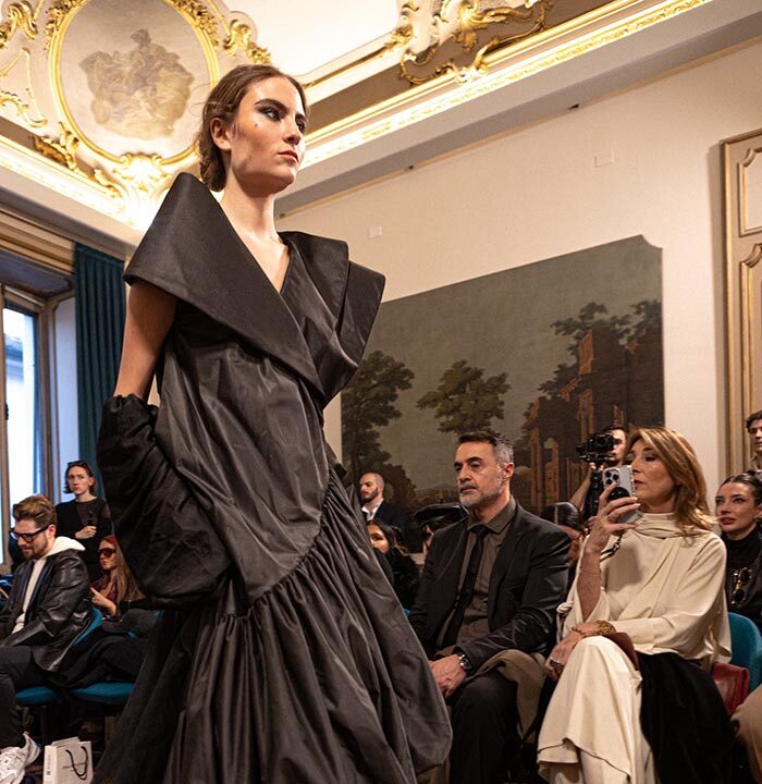 The talented couturier Anton Giulio Grande will unveil the Fall/Winter 25-26 collection titled AGG on the Road. The designer has created looks inspired by a rock-spirited woman who travels by motorcycle and lives her life in a nonconformist way—even riding to the altar on two wheels. Her wardrobe is entirely designed for every occasion, always meant to be showcased on a bike.