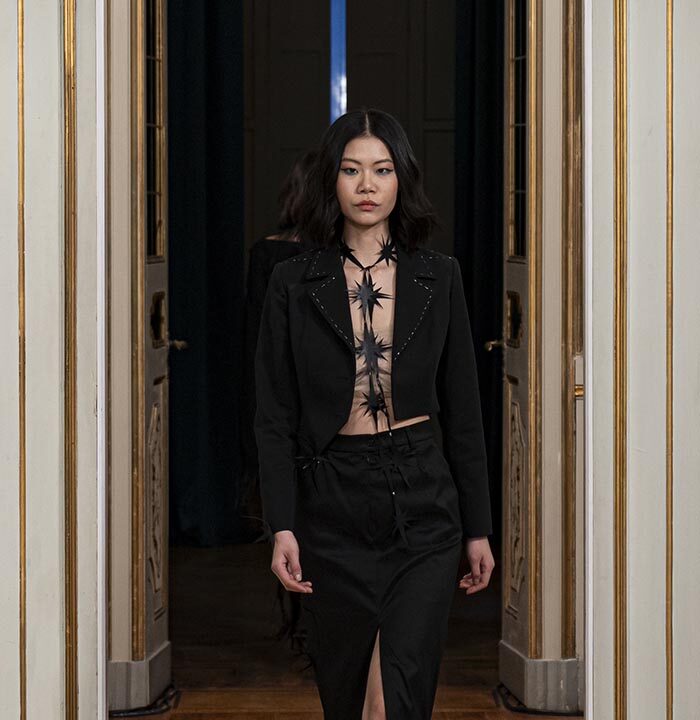 The color palette transitions from soft beige tones, reminiscent of the calm of dawn,and the light, to deep blacks that symbolize the night, where stars shine their brightest. Each embroidery is handcrafted, with shimmering threads representing the glimmers of light. The pointed finishes reflect the shapes of the stars, while structured silhouettes in blazers, skirts, pants, and oversized jackets represent the strength of familial love. Soft knits and sheer fabrics add warmth, revealing the guiding light from within.