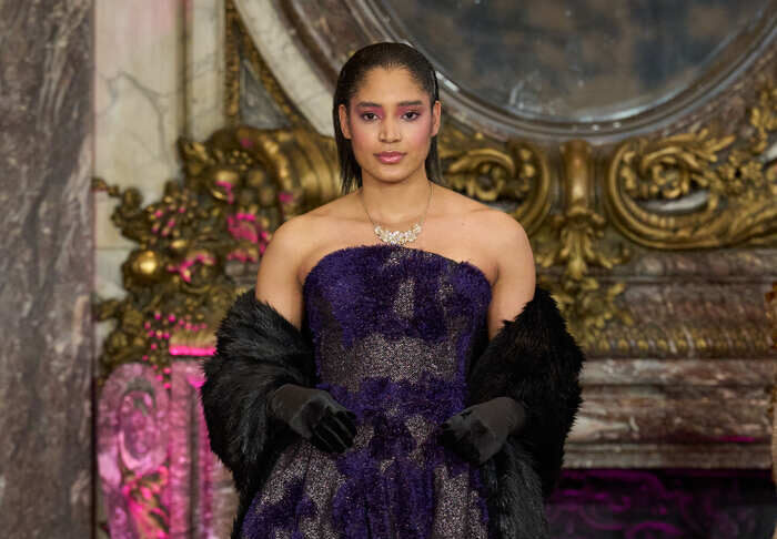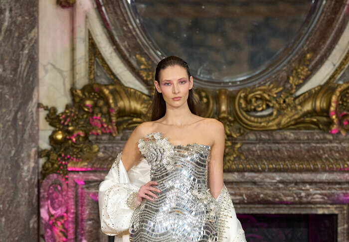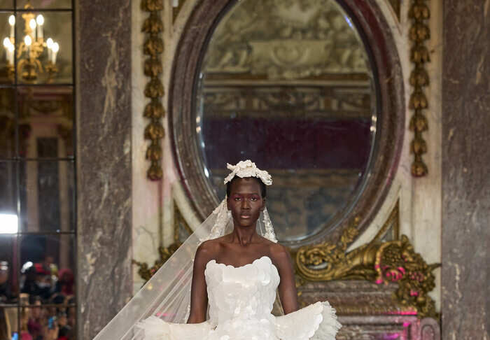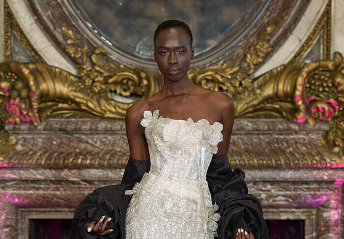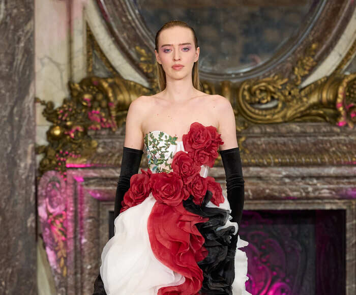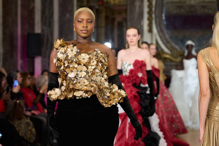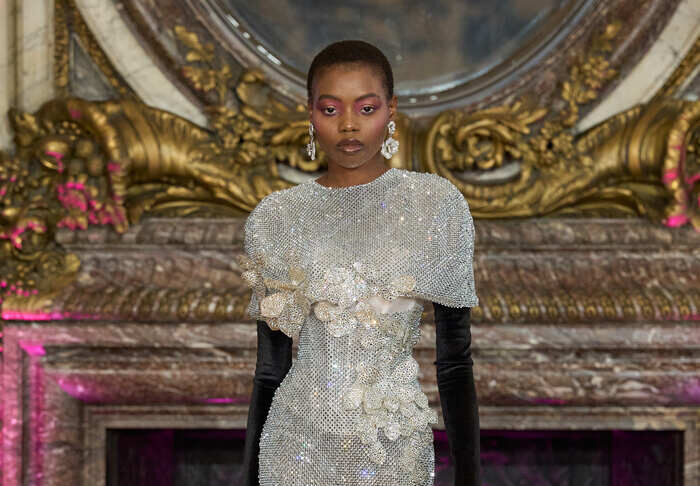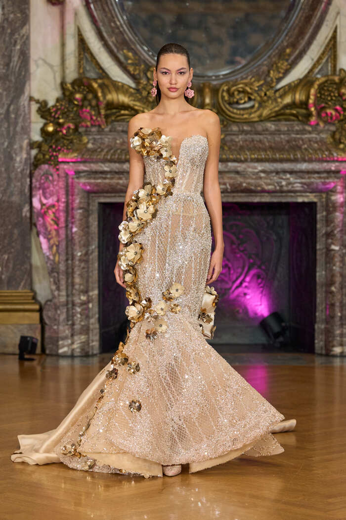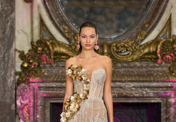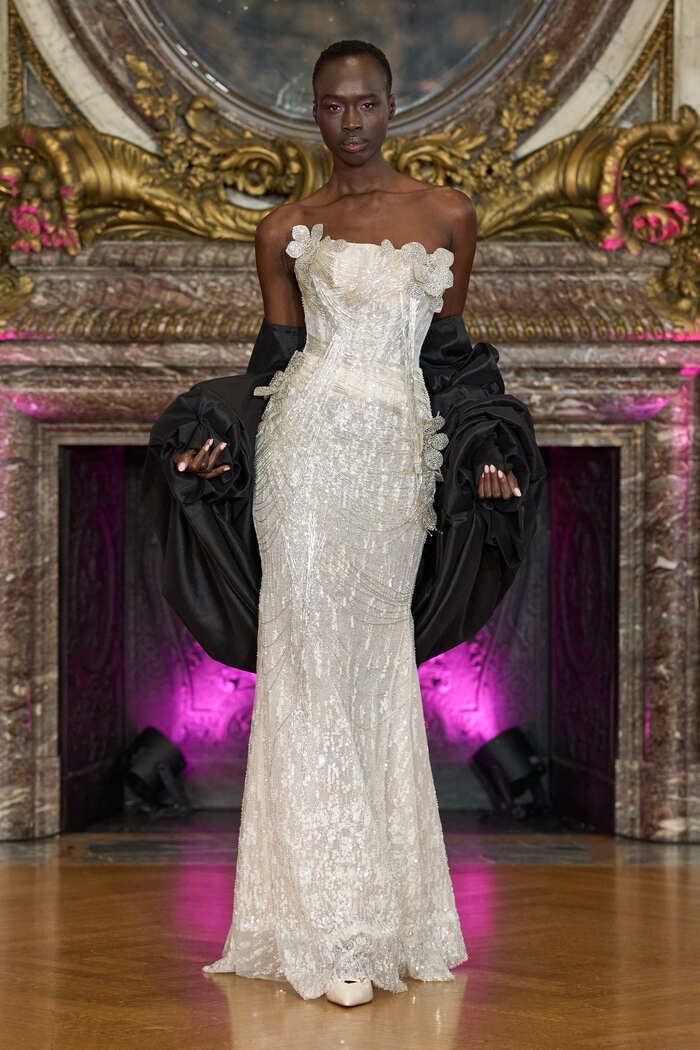 Sculptural silhouettes bloom with 3D floral textures, each petal meticulously crafted to feel alive, dimensional and intentional. Hand beading serves as both adornment and armor, honoring couture craftsmanship while pushing it into a bold, contemporary future.