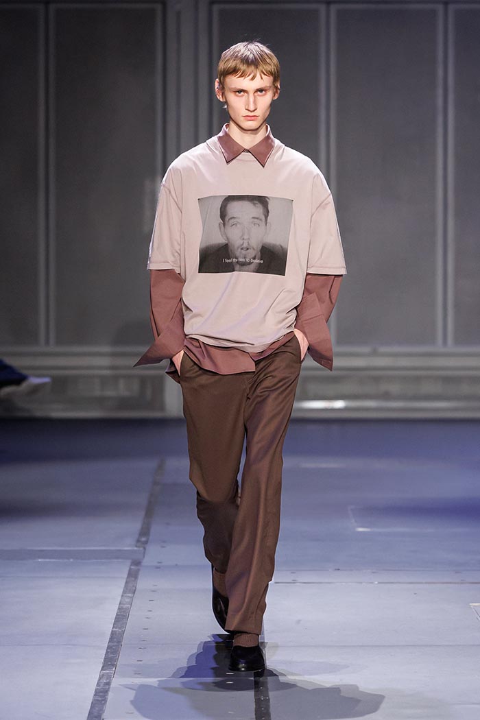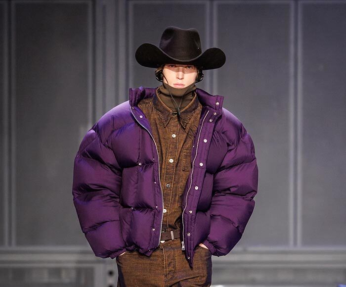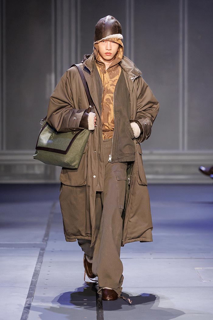 Precise yet functional workwear details fuel the collection with plays on volume and layering: pieces equipped with front and back zippers, a protective and removable hood contrasting with the coat that carries it. Textural reliefs ripple across garments through laced inserts on jackets, corduroy, ribbed second-skin pieces or jersey with visible inverted seams. A puffer jacket with a double button placket, generous and dense knitwear in camouflage patterns, as well as a set of homewear revisiting the utilitarian uniform have been designed to transpose domestic comfort into the outside world.