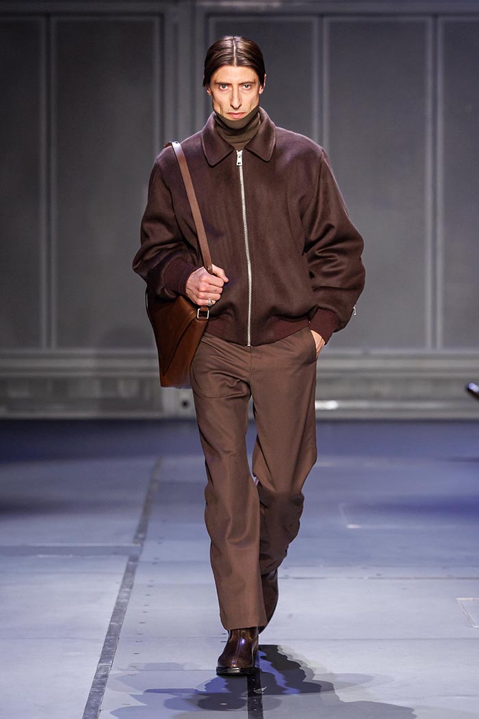 This approach echoes the very DNA of Études Studio, whose name evokes the musical compositions thought of as fields of exploration, variation and repetition. Here, garments become a space for conceptual and formal investigation. The wardrobe is reinterpreted through this logic of reverberation: emblematic pieces infused with singular accents, tailoring structured by meticulous material choices and precise cuts. A versatile collared bomber in a cashmere and wool blend sits alongside a blazer and wide-leg trousers.
