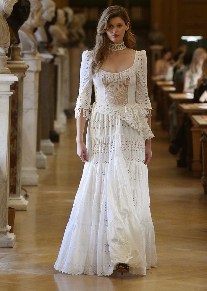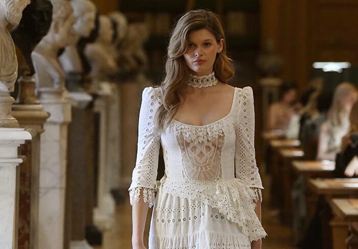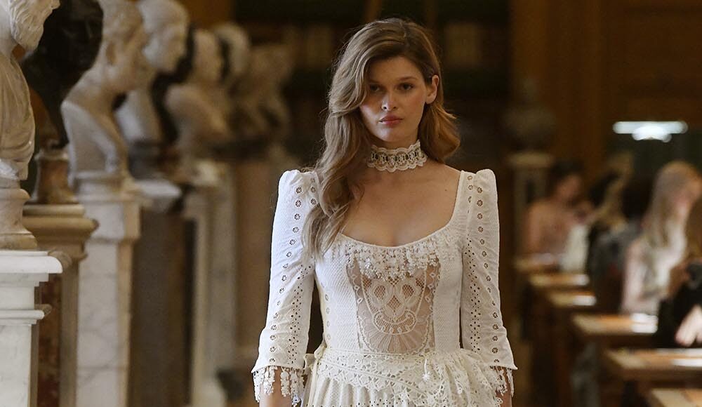 The final chapter is an ode to sonnets and poetry. Here, Edwardian elements are reimagined in ethereal cottons and airy lace, evoking the tenderness of sonnets and their ephemeral beauty. Guipure appliqués and broderie anglaise adorn gowns in white and cream, while Edwardian collars part from their canonical styling and are placed on hips and around waistlines. Sheer paneling plays against embroidered cotton, while bloomers, chemisettes and delicate cotton pieces capture the intimate essence of sonnets. The collection closes with a floor-length tiered gown in white cotton, its open back and windowpane bodice embodying Wild Rose & Sparrow’s romantic soul and devotion to craft.
