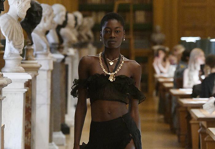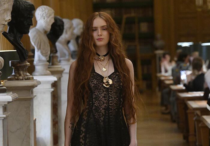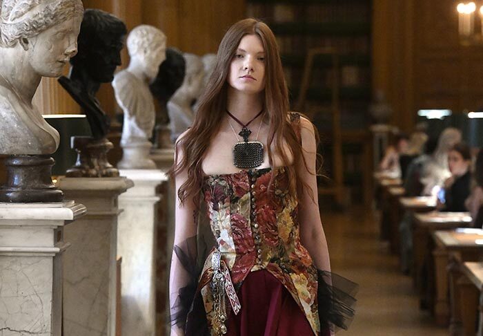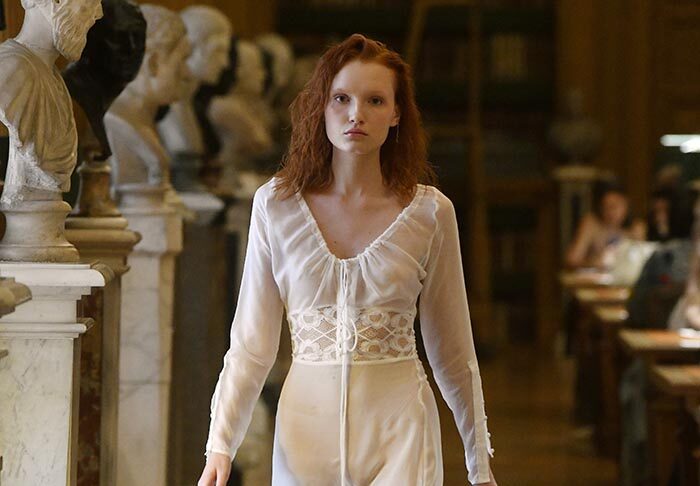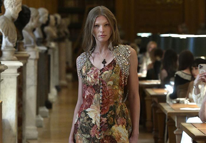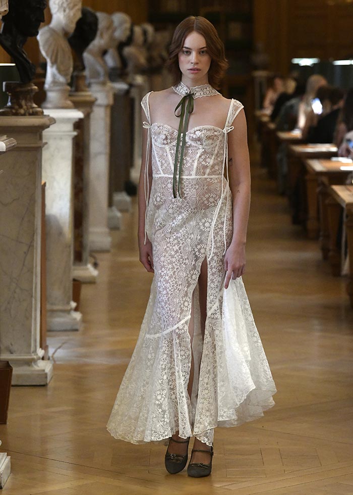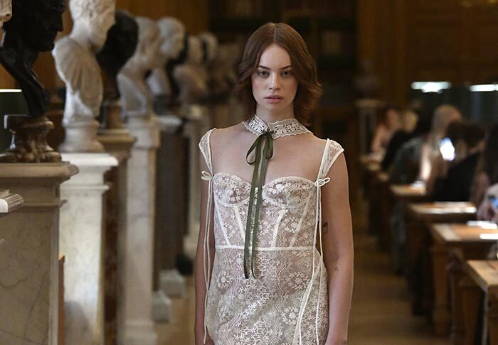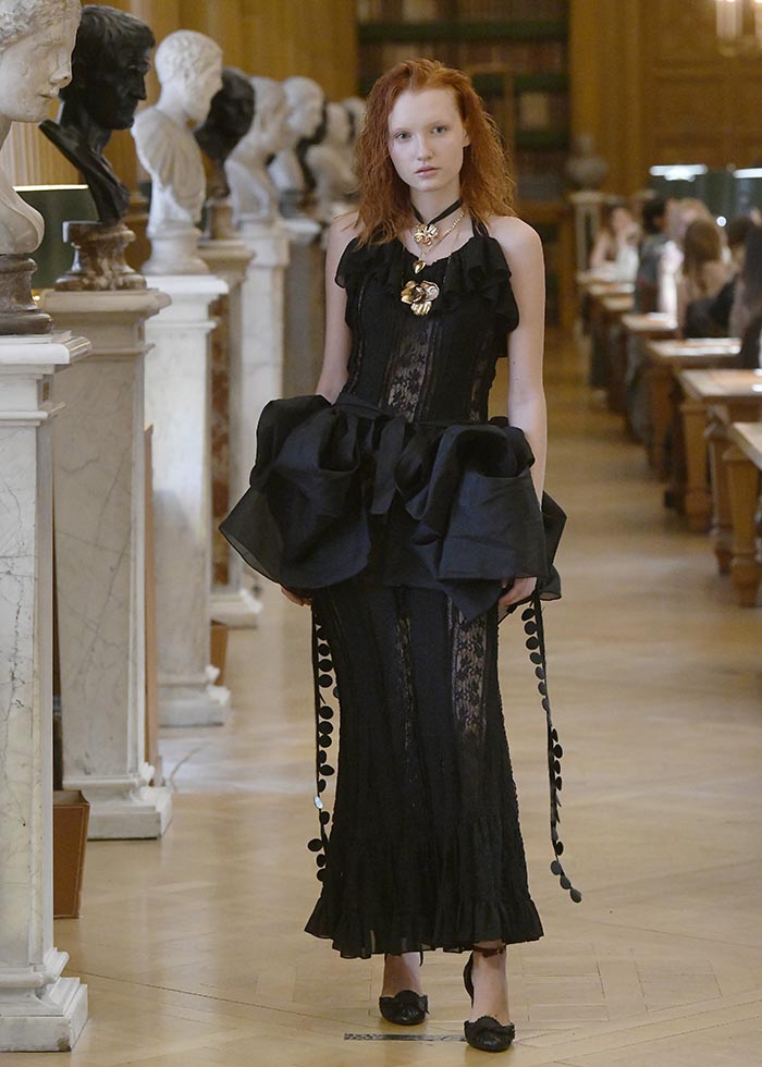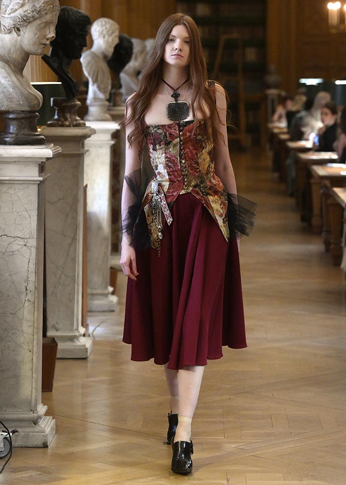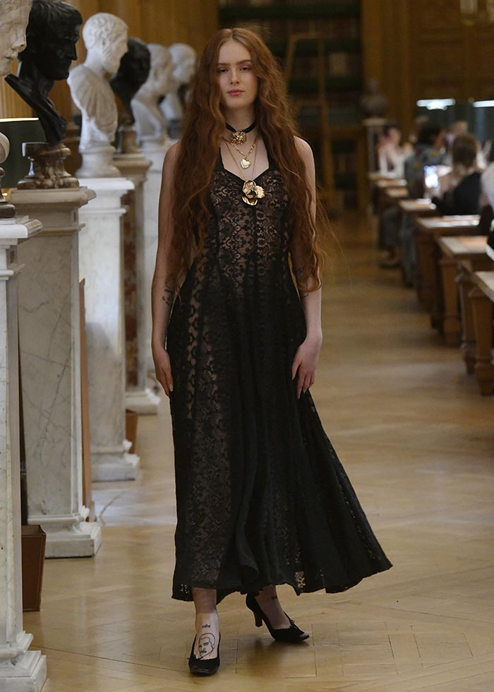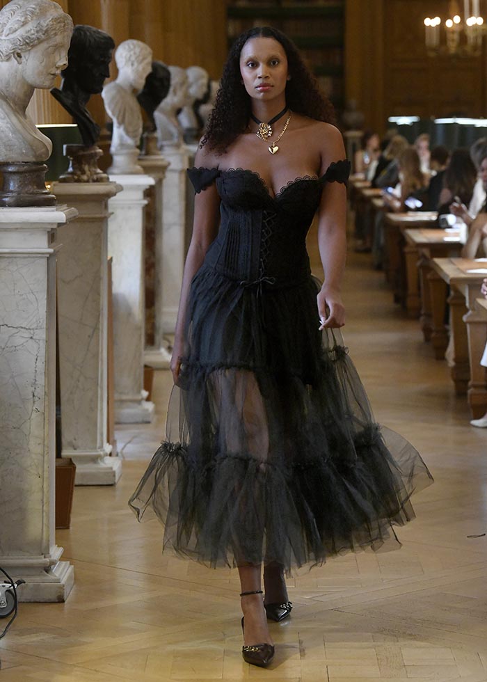 The second chapter is inspired by medieval heroines and heraldic imagery. Scarlet silhouettes part from the preceding darkness: structured jackets in stiffened cotton, heavily embroidered textiles evoking medieval tapestries, and beaded motifs glinting beneath knife-pleated skirts like chainmail. Antique chatelaines, keys and chainmail purses are styled as bijoux, while fleur-de-lys ribbons that reference the designers’ Montréal home embellish the waistlines of corseted and structured silhouettes. Shades of vermillion and kermes red echo medieval illuminures. The closing look is inspired by J.W. Waterhouse’s The Lady of Shalott: a seraphic gown in gossamer silk chiffon, its bodice and sleeves swathed in hand-sculpted gold thread.