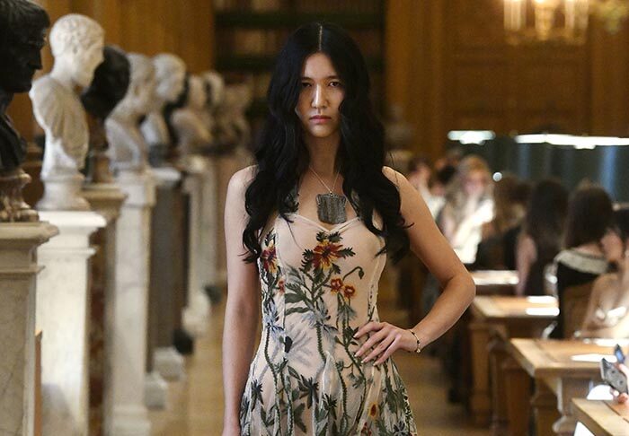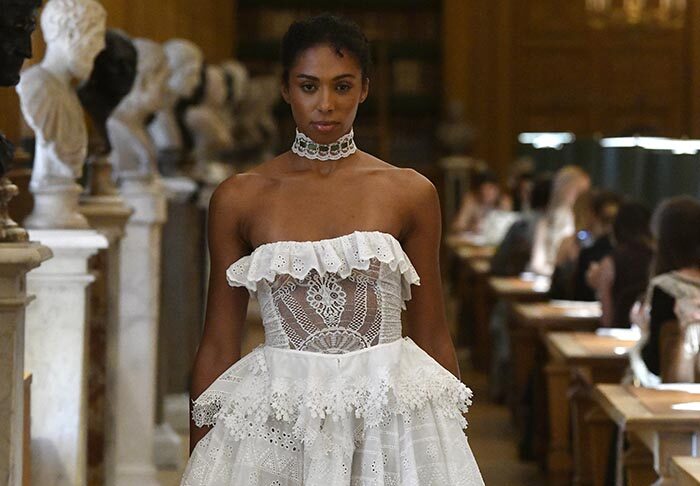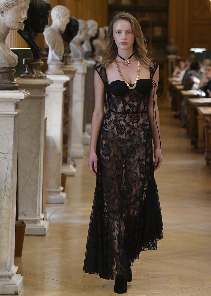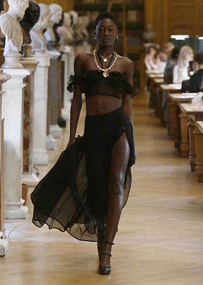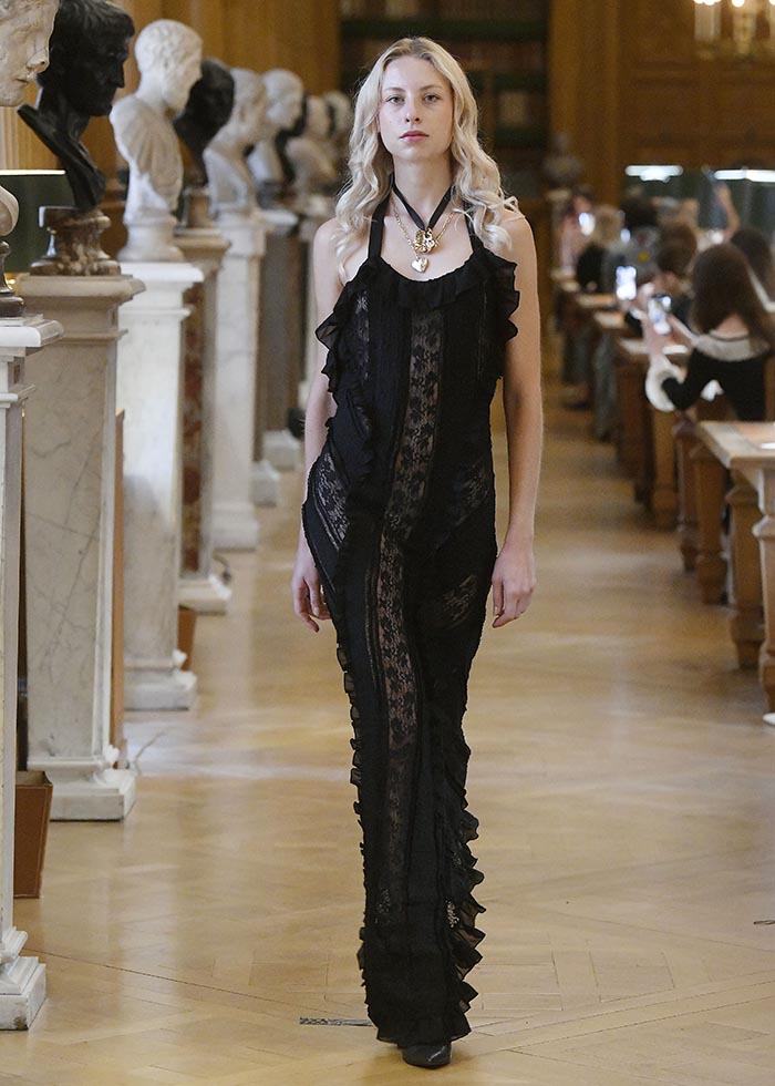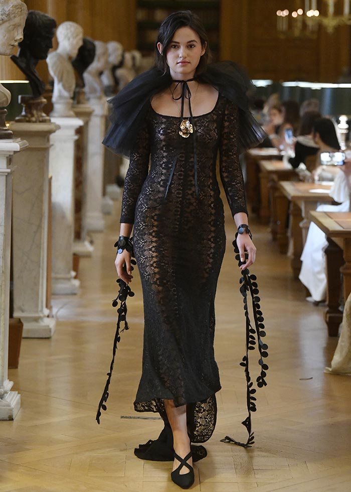 The opening chapter pays homage to gothic literature. Dark silhouettes evoke reinterpreted Victorian detailing through black novelty lace, sheer tulle and diaphanous silks. Sirenesque gowns skim the body with lace paneling, miniskirts gain volume from Victorian inspired bustles, and diaphanoussilk chiffon mimics the translucent quality of peering at a figure underwater. A floor-length lace gown draped with a tulle caplet nods to Gustav Klimt’s Mermaids. Taken together, this chapter conjures the portrait of a coven, radiant with equal parts sisterhood and fortitude.