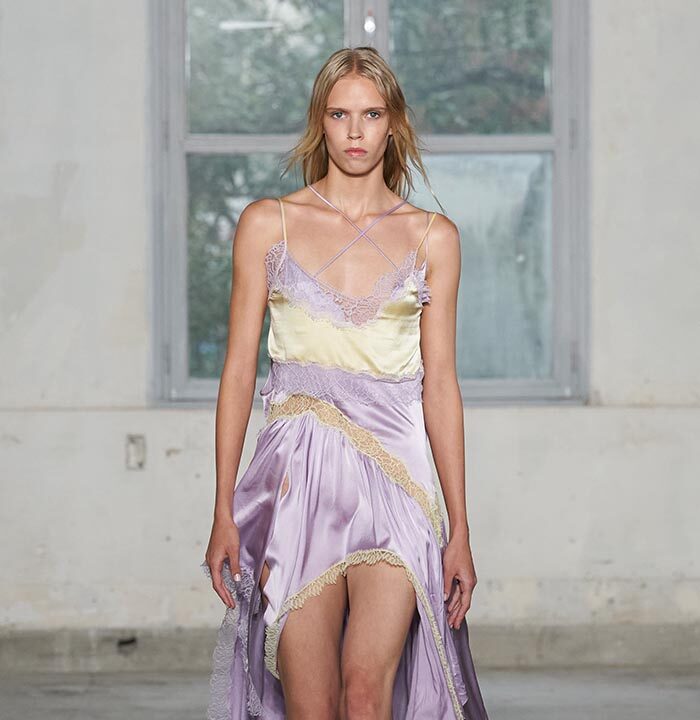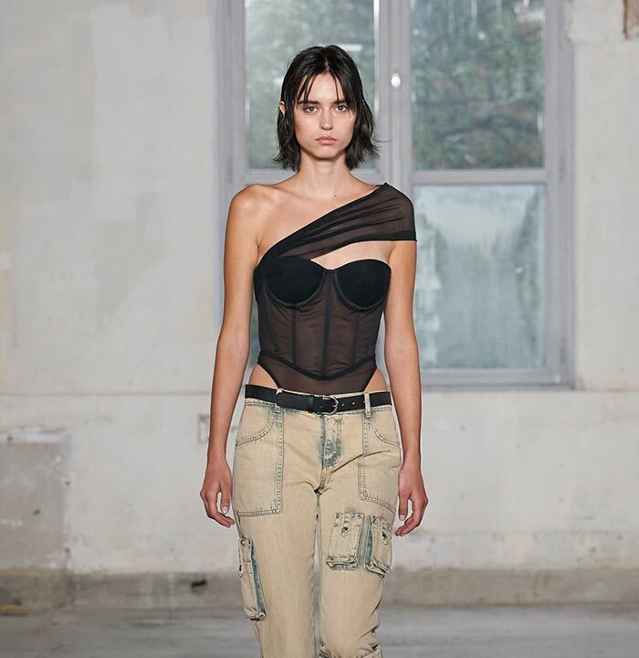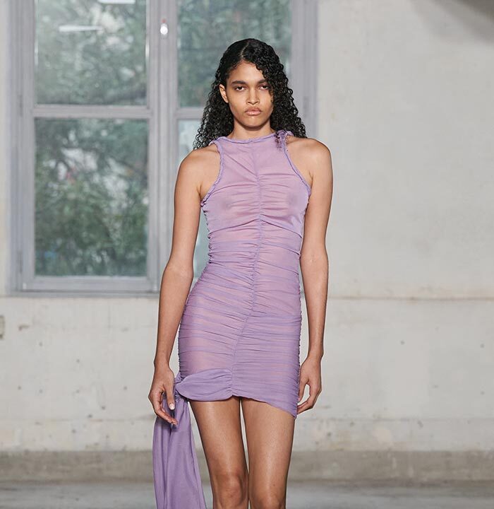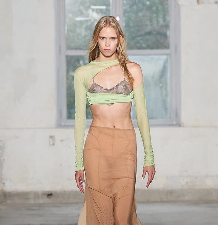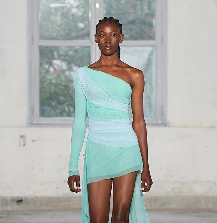 In this collection, Faith Connexion unveils a captivating array of see-through fabrics and transparency. A group of body-hugging dresses comes in various shades of pastel colors, exuding confidence and independence.