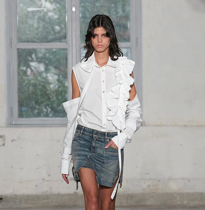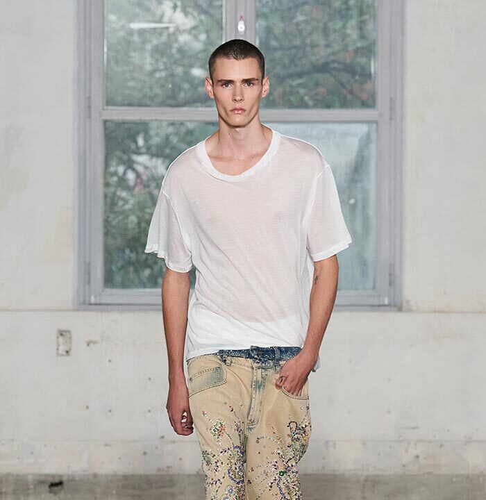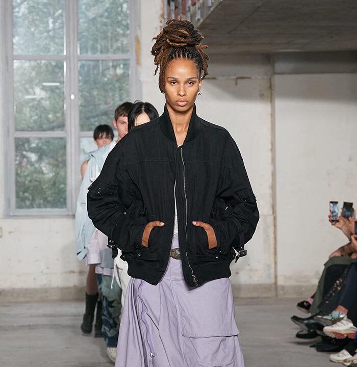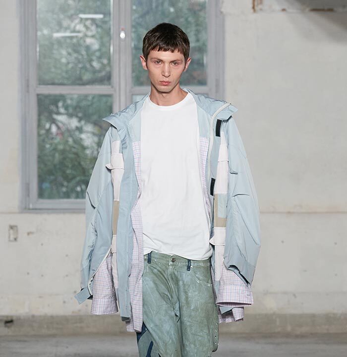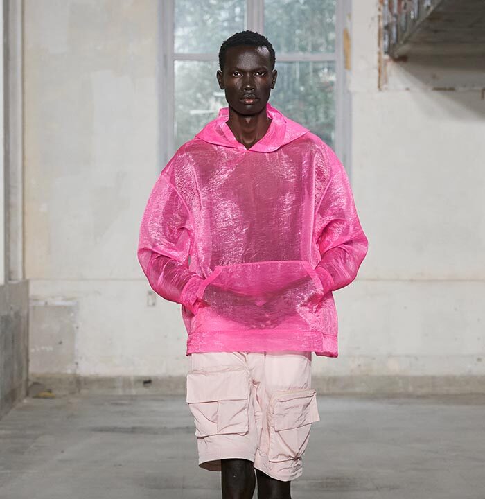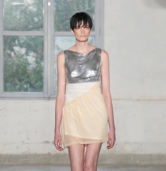 Embroidered belts make a bold statement throughout the collection, with double belts adorning pants, while metal mesh dresses combined with unexpected fabrics like lace and tulle create a striking contrast. Technical fabrics, including shiny nylon, lend a sporty edge to the genderless designs.