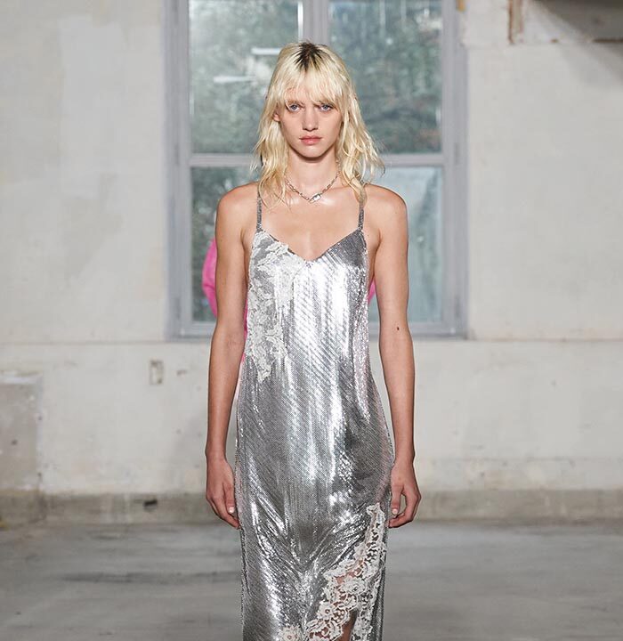 The collaboration with Fannie Schiavoni transforms iconic pieces true to her own DNA into a mix-and-match extravaganza, blending mesh metal with lace and tulle.