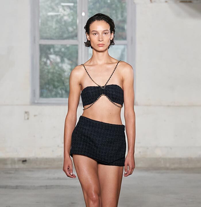 As tweed gets a feminine makeover, gracing very short shorts, small bralettes, and short skirts, the collection includes wardrobe staples like simple tee-shirts and tank tops in « voile de coton », the ones everybody wants in its wardrobe. Among the collection’s highlights are a long jean skirt and a denim bermuda, both exquisitely embroidered in India.