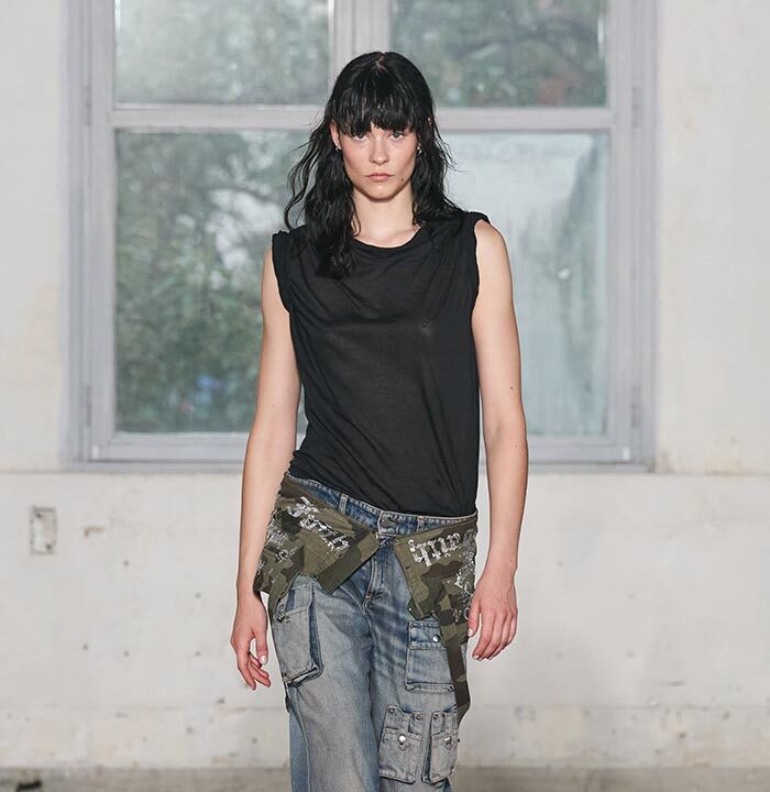 The juxtaposition of a lace top, casually paired with a military-style embroidered belt layered over a pair of jeans, seemingly thrown together with ease, encapsulates the very essence of this collection, as if the model effortlessly grabbed whatever was at hand before leaving the house.