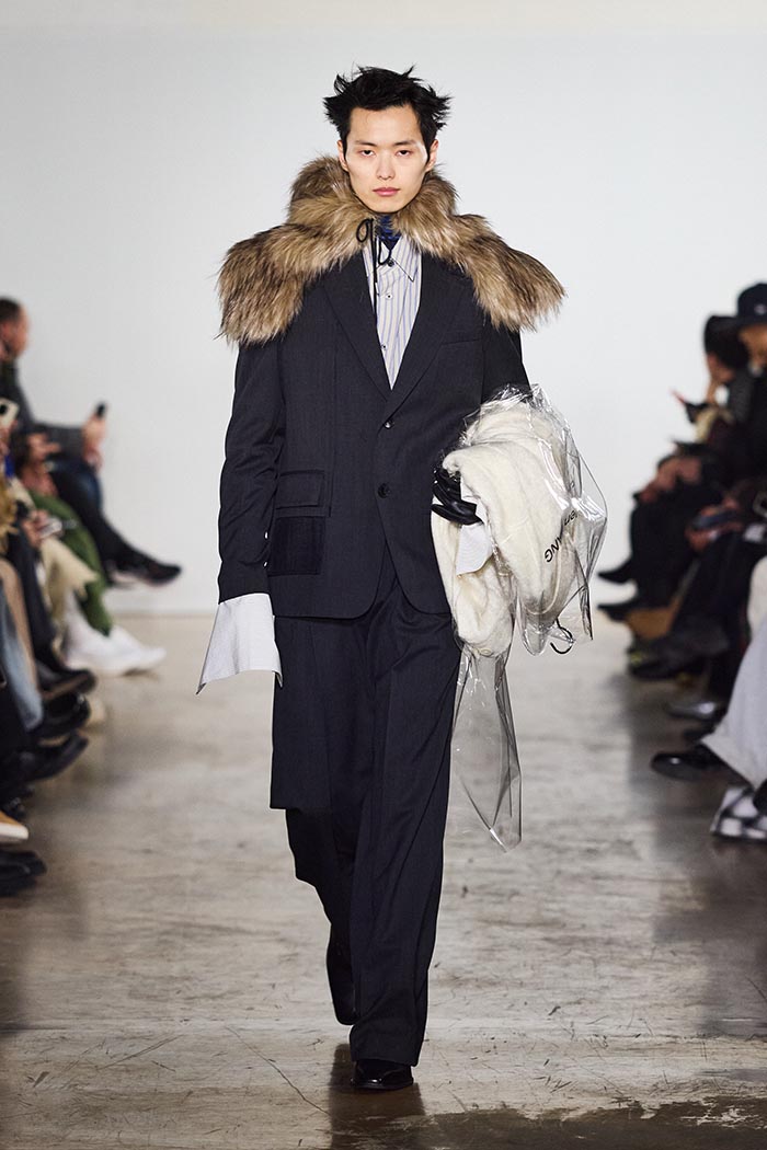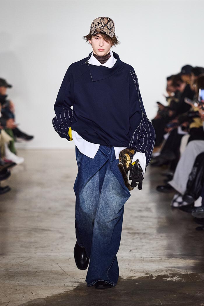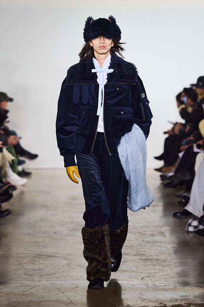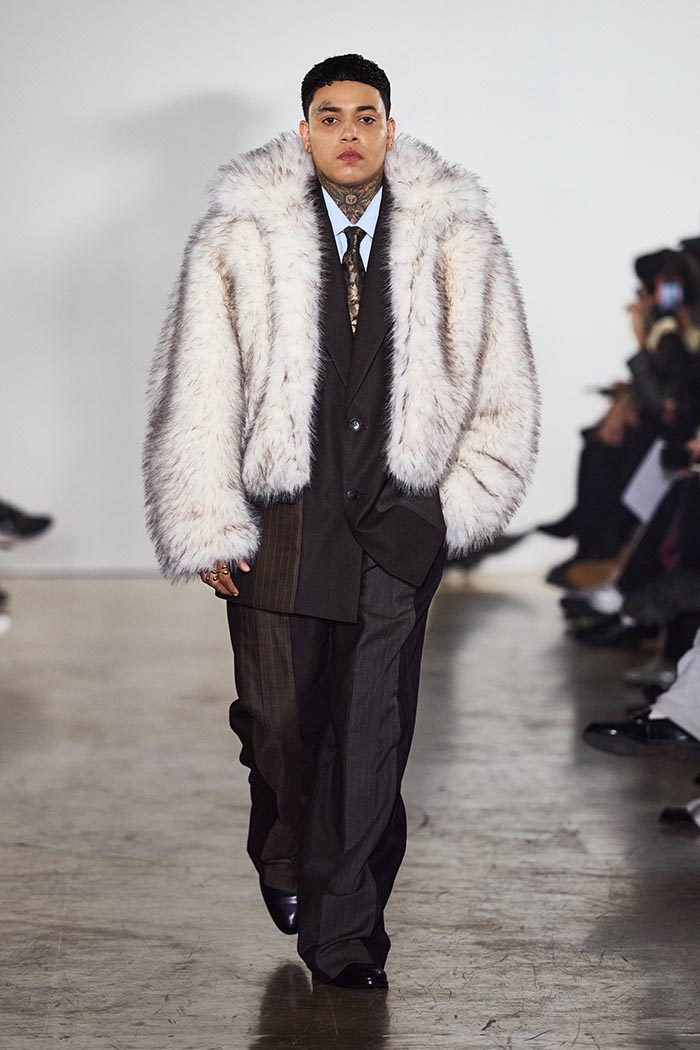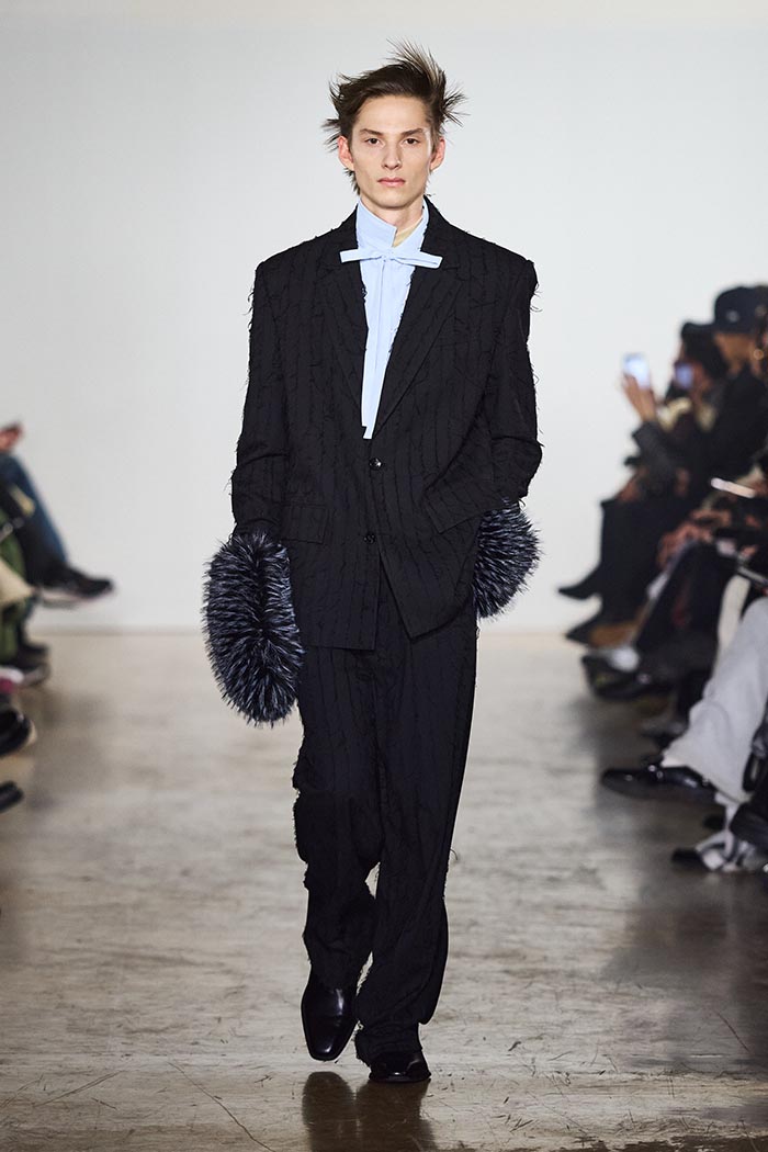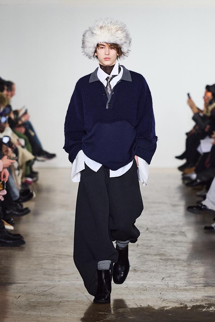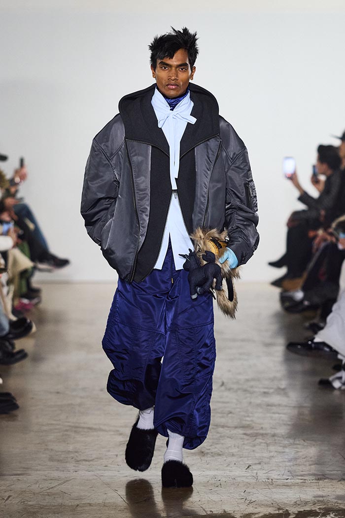 Controlled, architectural tailoring appears alongside deconstructed panels. Structured coats and suiting establish clear boundaries, while relaxed nylon fabrics, enlarged proportions, and gathered silhouettes release the body into freer movement. Restraint and ease are held within a single look.