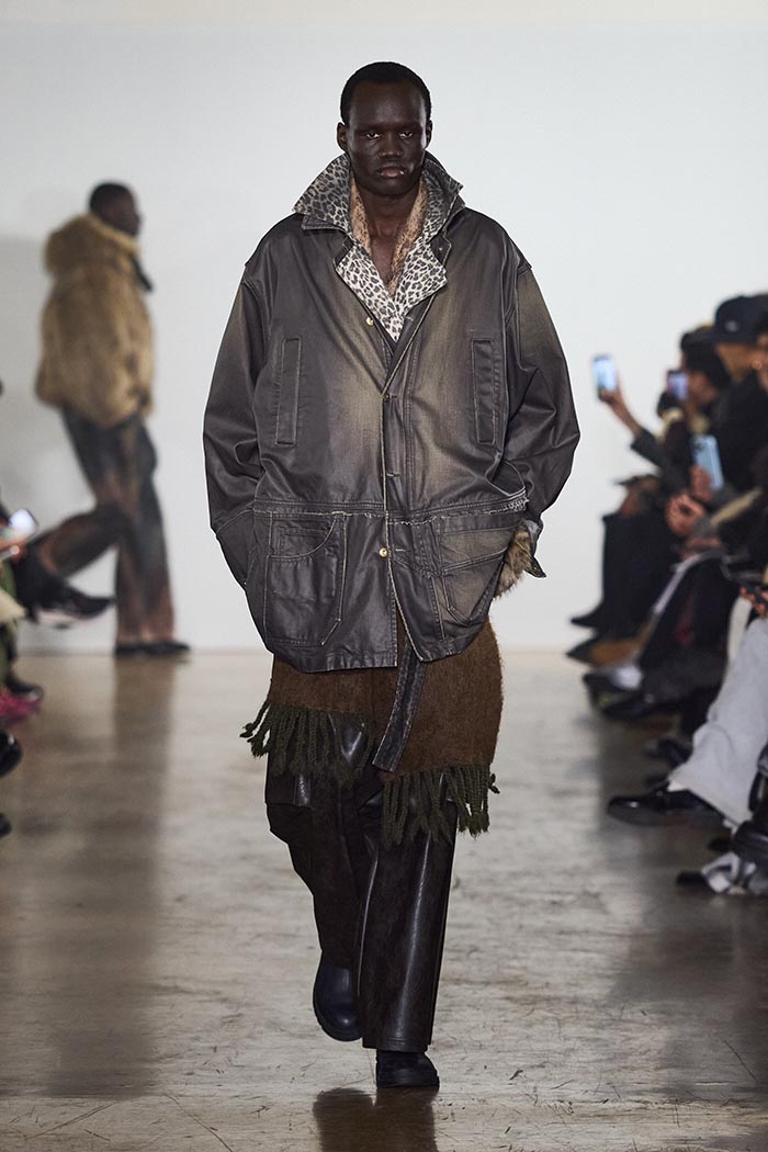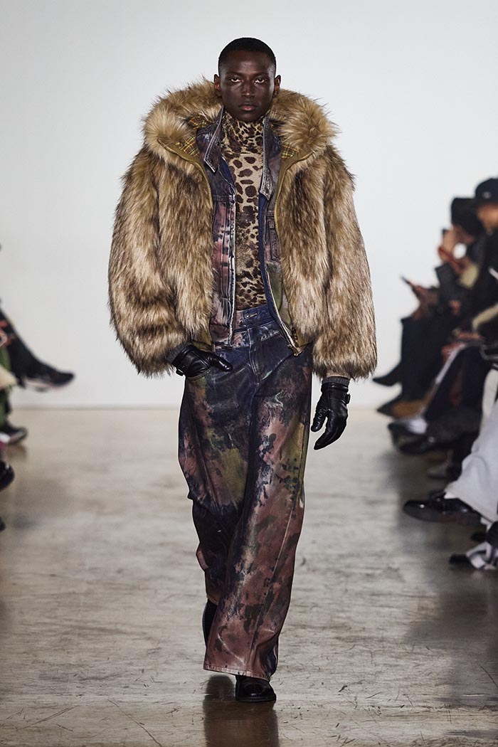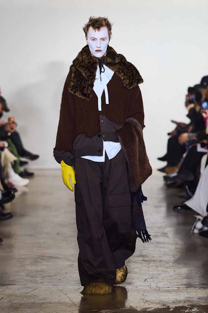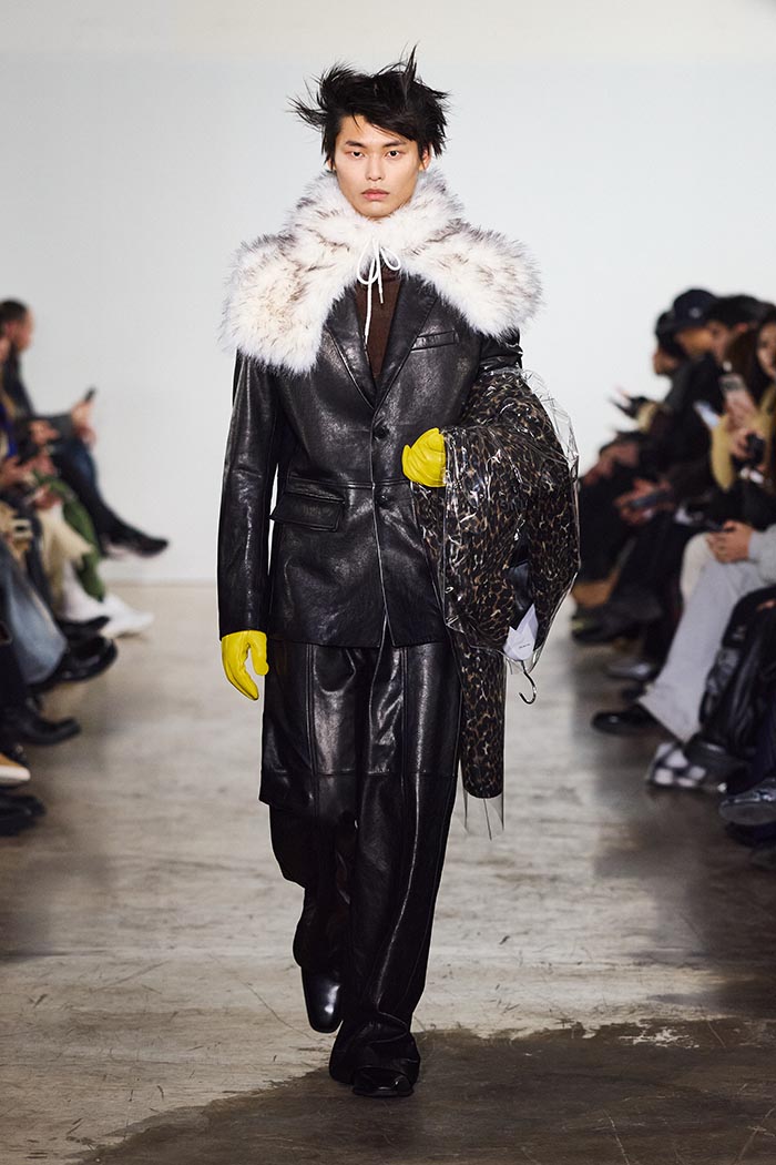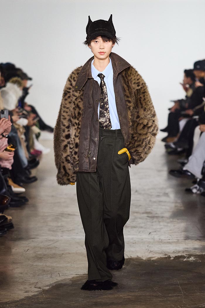 Material contrast plays a central role. Wool, down, and leather form a dense, grounded base, lightweight textiles, and animal-like surfaces. Ink-splashed and scratch-marked textures are not decorative, but traces left when order is interrupted: subtle, yet deliberate.