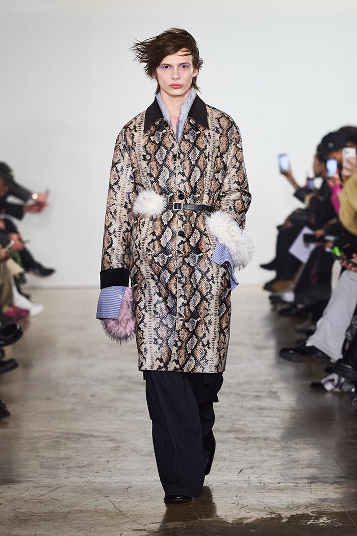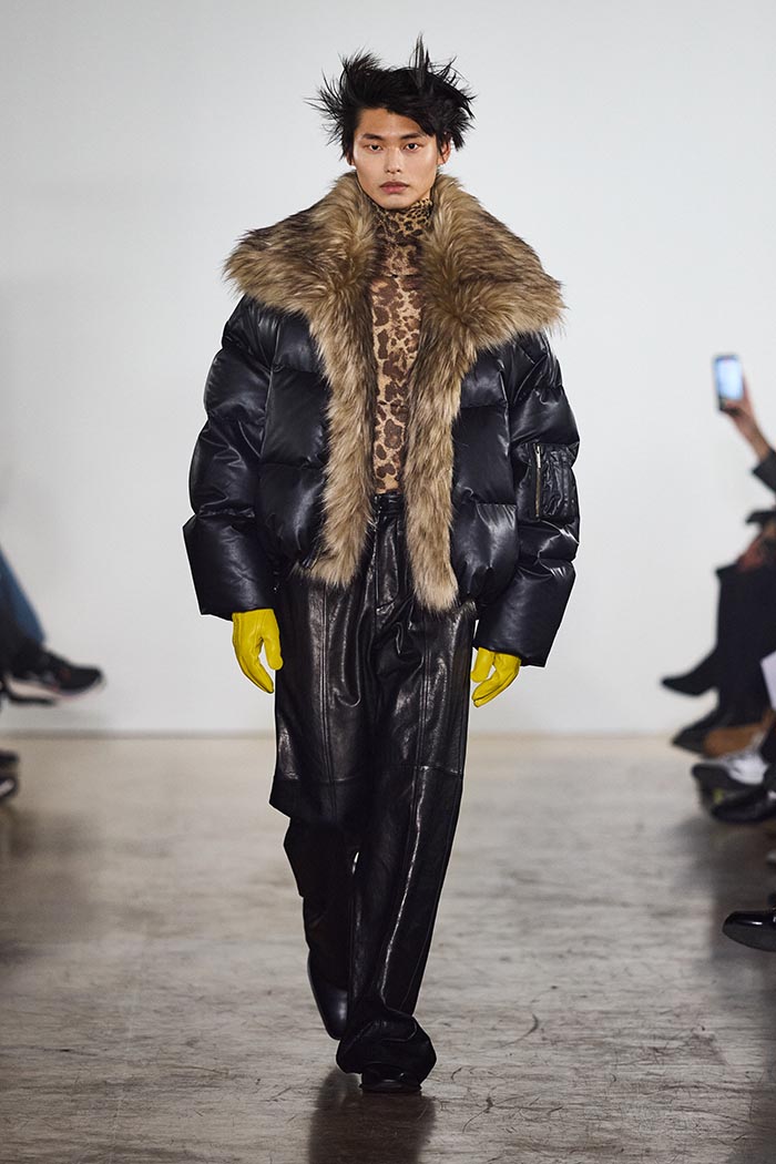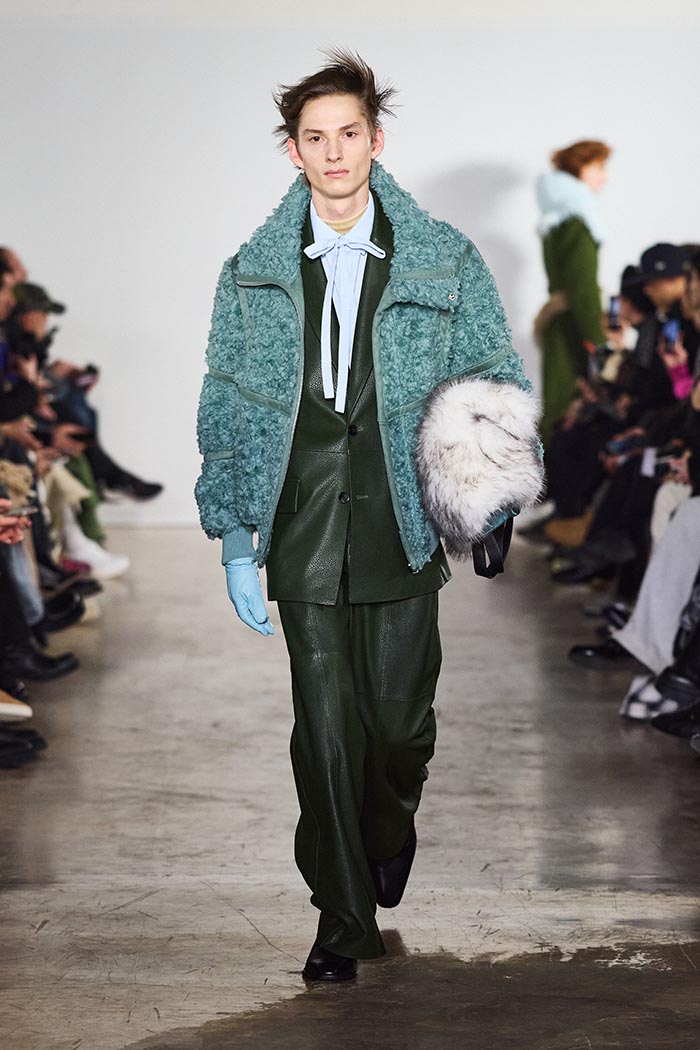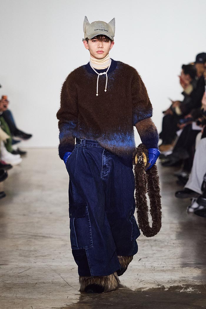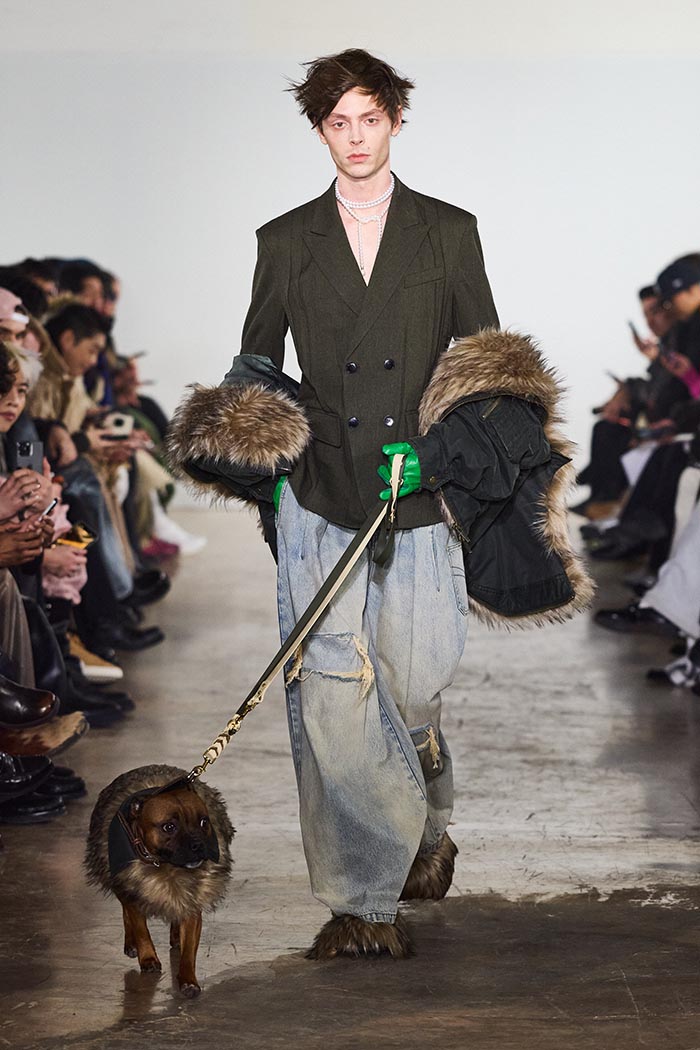 Material contrast plays a central role. Wool, down, and leather form a dense, grounded base, lightweight textiles, and animal-like surfaces. Ink-splashed and scratch-marked textures are not decorative, but traces left when order is interrupted: subtle, yet deliberate.
