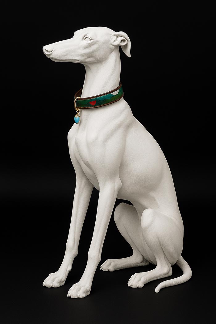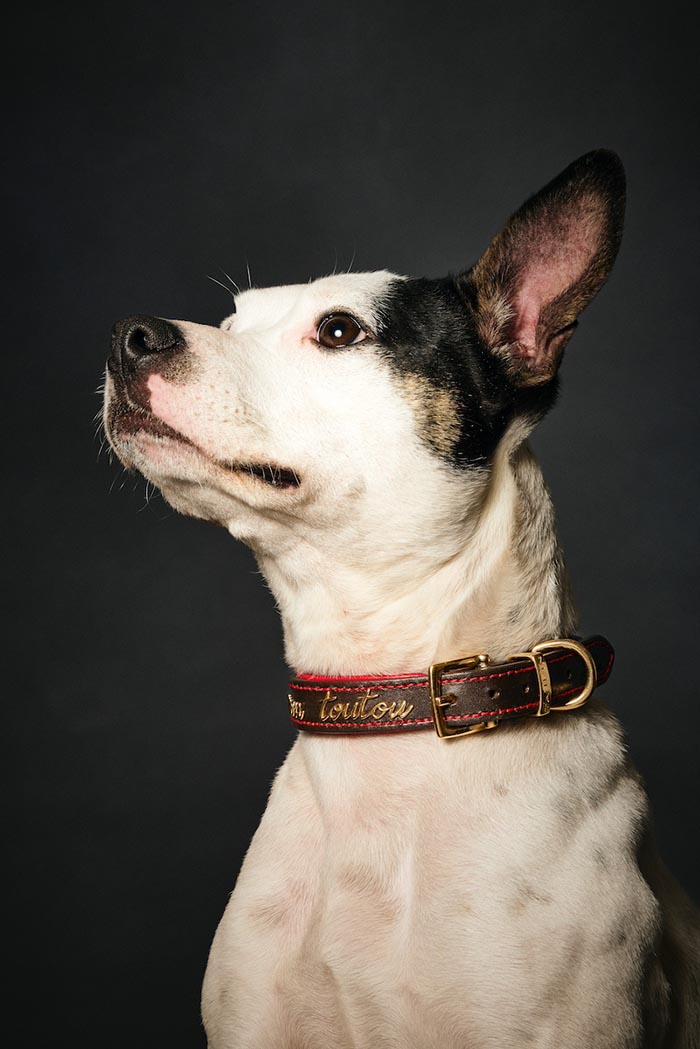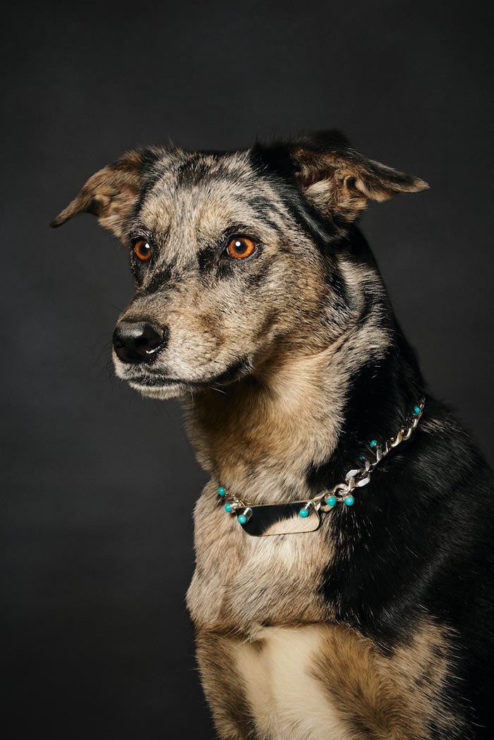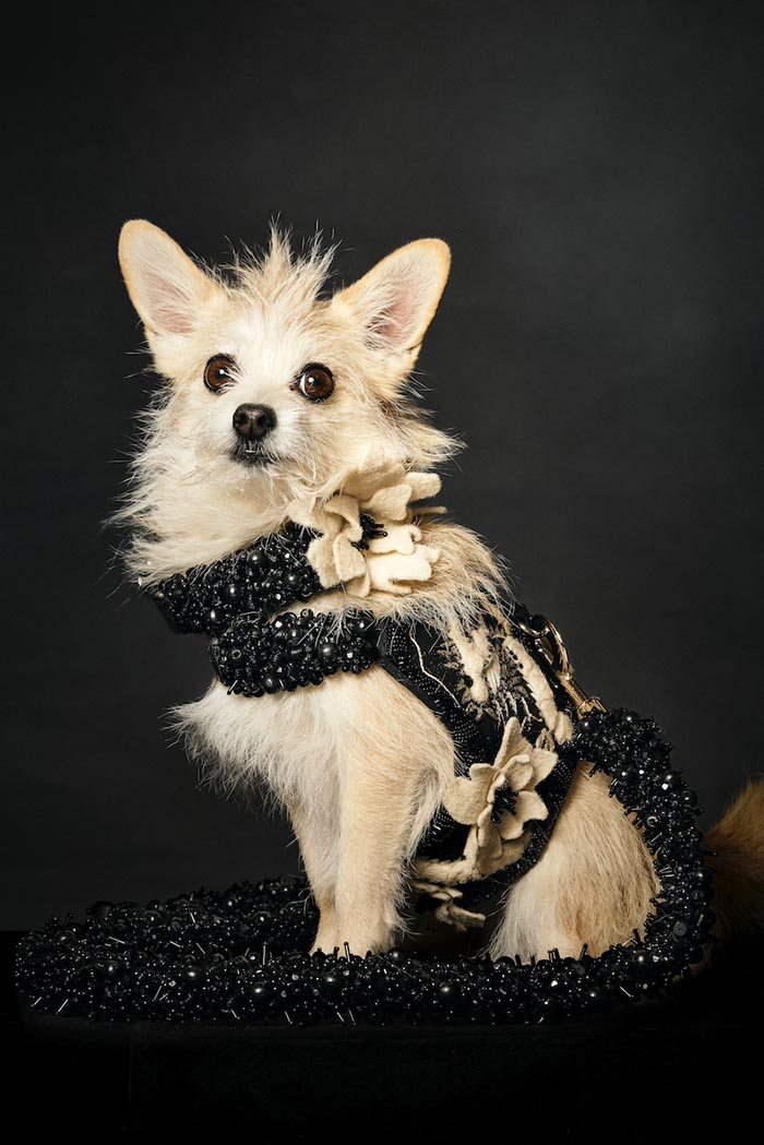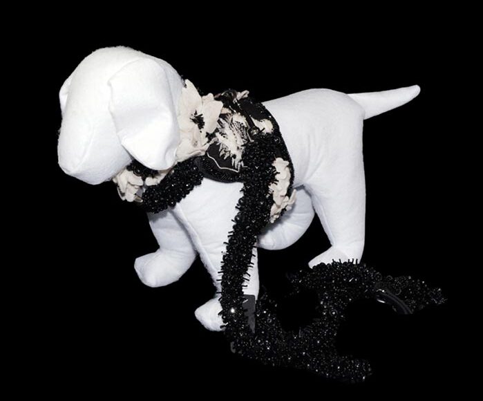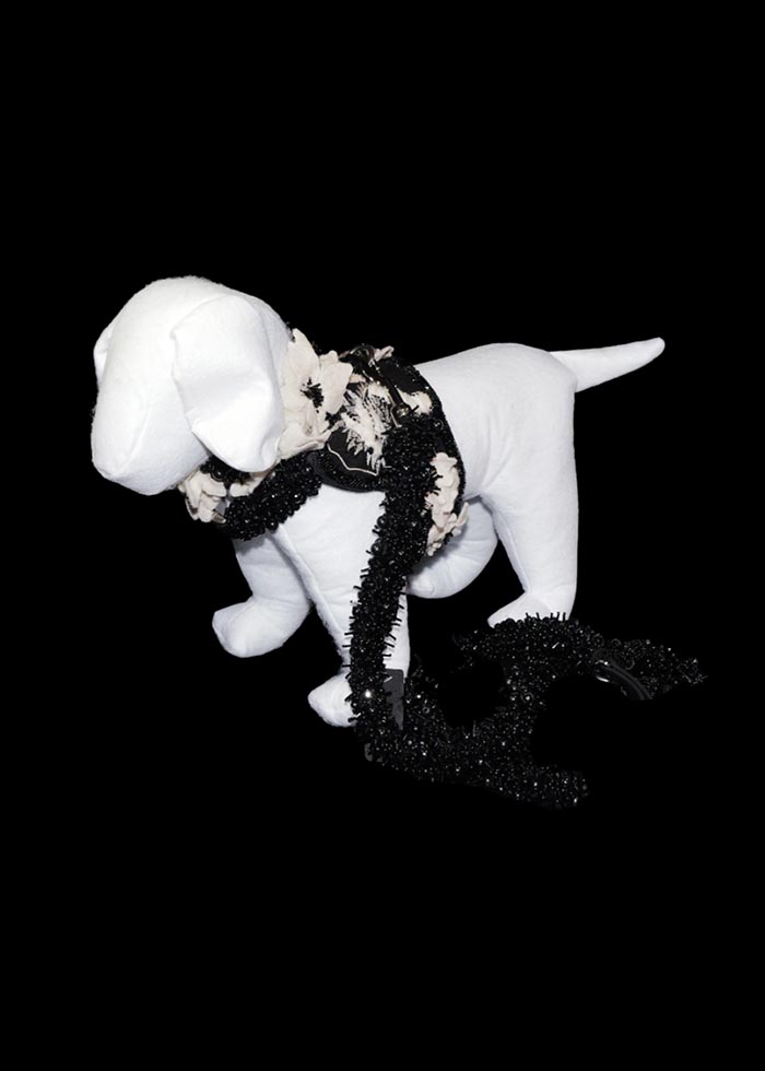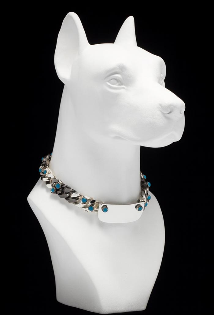 From the New York based house of Taffin, James de Givenchy presents a leather collar accented with 18k gold and engraved with “mon toutou,” the affectionate French phrase for “my puppy.” Stefania Pramma offers a hand crafted sterling silver chain collar adorned with turquoise cabochons and a customizable nameplate. Irene Neuwirth brings her whimsical and refined touch to a hand painted leather collar with a turquoise charm. Josie Natori contributes a hand beaded collar, harness and leash ensemble that required more than one hundred hours of meticulous work.