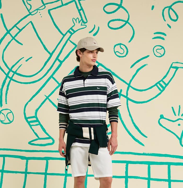 The collection embraces transitional fabrics such as indigo-dyed gabardine, denim, chenille, cotton, and linen, merging urban sophistication with sporty ease in a warm, earthy palette—navy blues, sand, and sage, punctuated by vivid mango and pomegranate red. A ’90s revival nods to preppy influences and carefree vibes, whisking us from Ivy League campuses to Hamptons beaches. Micro-jacquard motifs elevate knitwear; iconic stripes define mix-and-match shirting; sweatshirts feature tennis-inspired prints, while geometric patterns reimagine vintage wallpapers and illustrations.