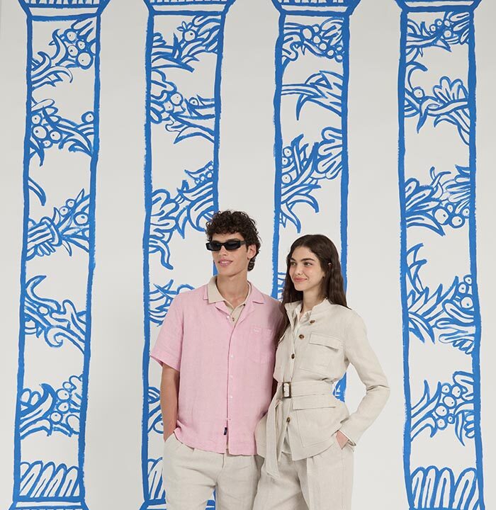 The Artigianalità a Colori capsule continues its partnership with local artisans and specialized workshops, crafting yarn-dyed linens and English gauze fabrics through premium, *100% Made-in-Italy* techniques.