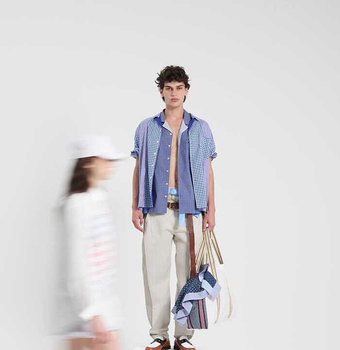 The quilted nylon vest is reconstructed with sleeves and pockets repurposed from striped poplin shirts. The field jacket is reworked with inserts from old trousers. A reversible jacket gets a fresh twist, pairing houndstooth with linen canvas embellished with star motifs and patch pockets. The re-shirt concept spans from the reissued Piazzetta shirt—crafted from three archival fabrics (monochrome, floral, and striped)—to fusing two designs into one, featuring micro-patterns or checks, accented by jacquard ribbons.