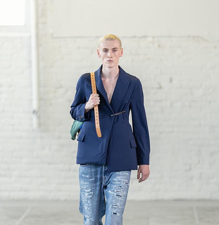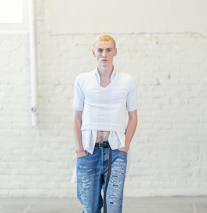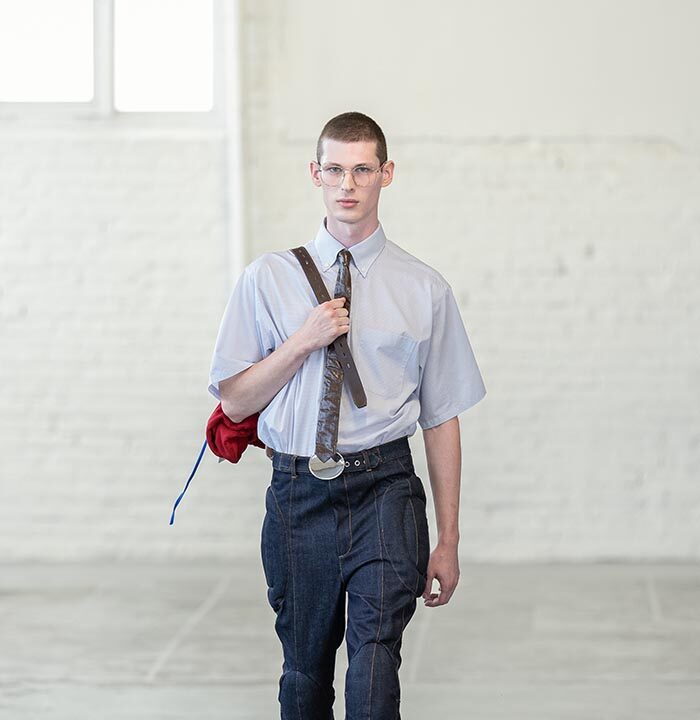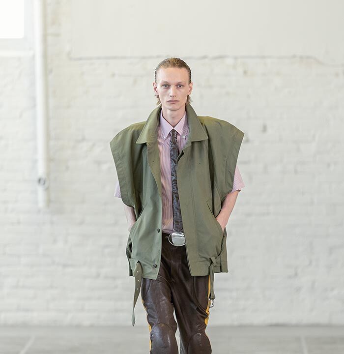 Four months ago, Hed Mayner began pushing his design practice towards something almost anti-construction. Slicing through the creative process, like he would a second-hand tailored jacket, he dived into the making of this collection with an intense velocity. This has left behind an august rawness and flirtatious potency.