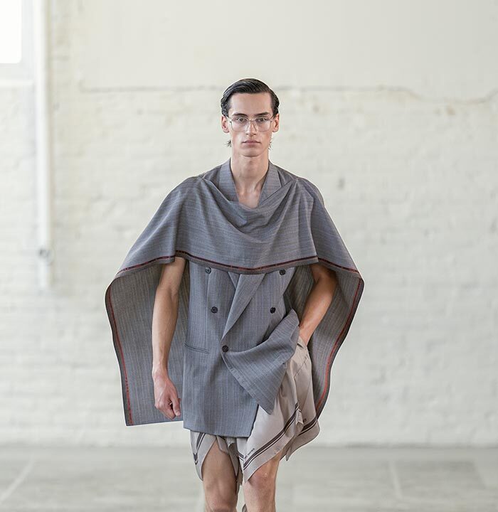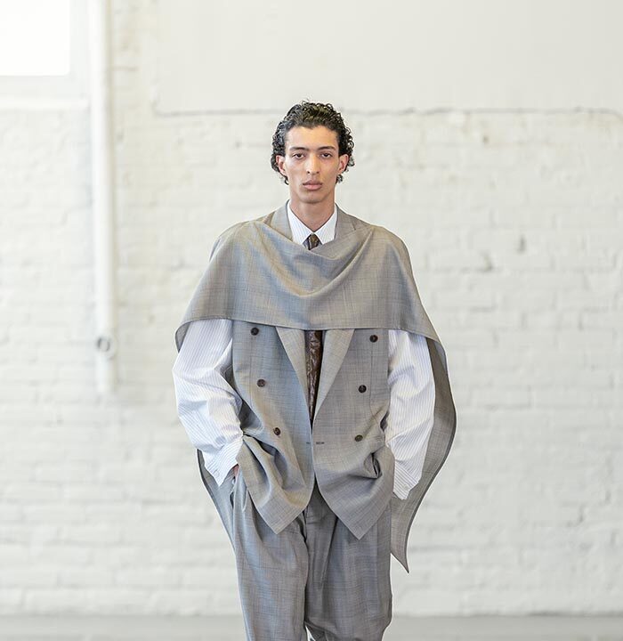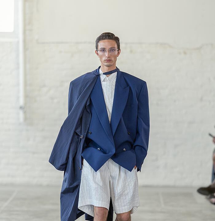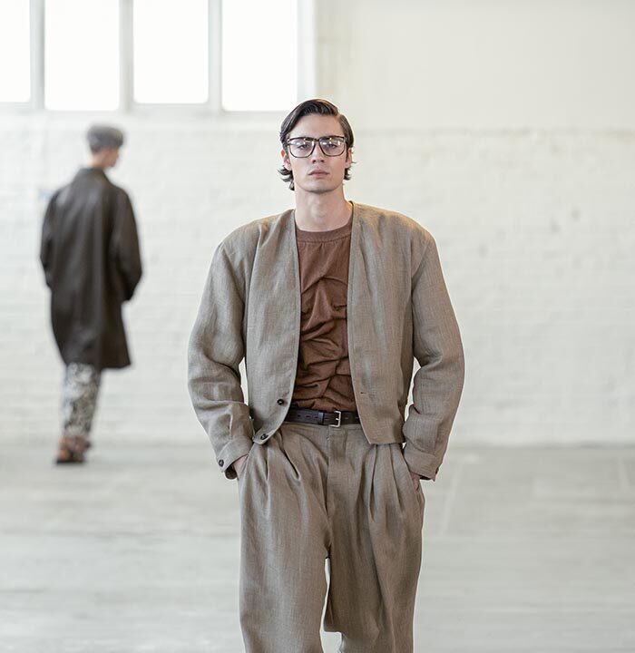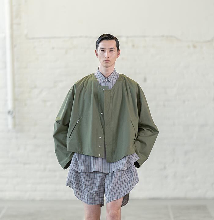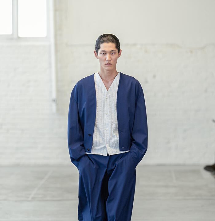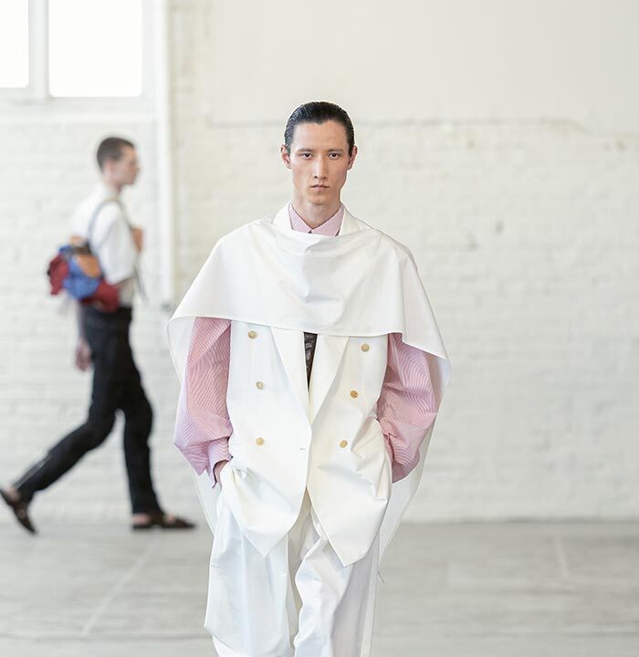 Handkerchief shorts and trousers feel as if they are descending from the body, floating—not sculptural. A removal of the shoulder from tailoring and shirting ushers in a collapsing of the fabric, which is used in its entirety. The feeling is one of a single piece of textile wrapped around the body from end-to-end.