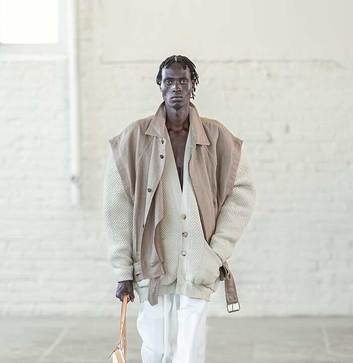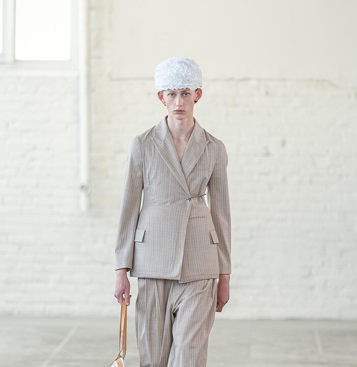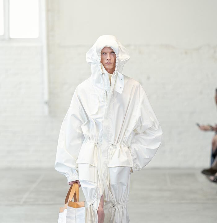 Clothes are collapsing, falling and going back onto the body. A hooded parka is elongated and ruched. A blazer in stretch fabric is fitted around foam, pinched closed with a safety pin, underplaying the grandeur of formal tailoring. Knitwear is point-stitched