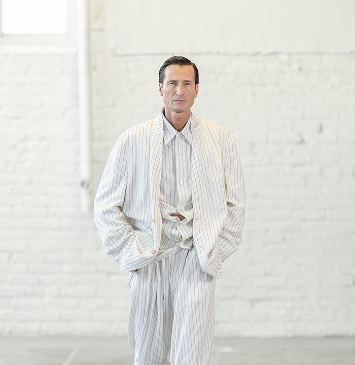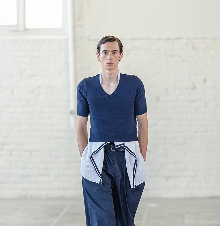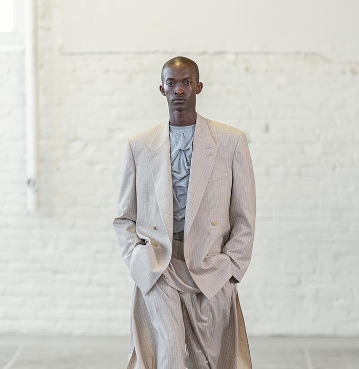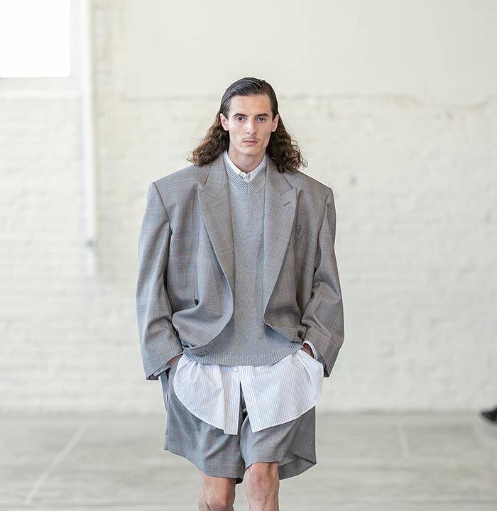 Fluidity is an essential gesture: a drop, a swing, a hang that is cut into the clothes. Across all of the collection, Mayner worked on the idea of emptying the pieces of their structure. Their fit ripples around the torso and down the leg.