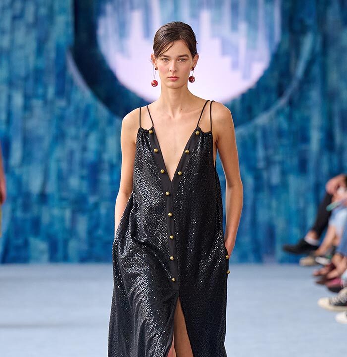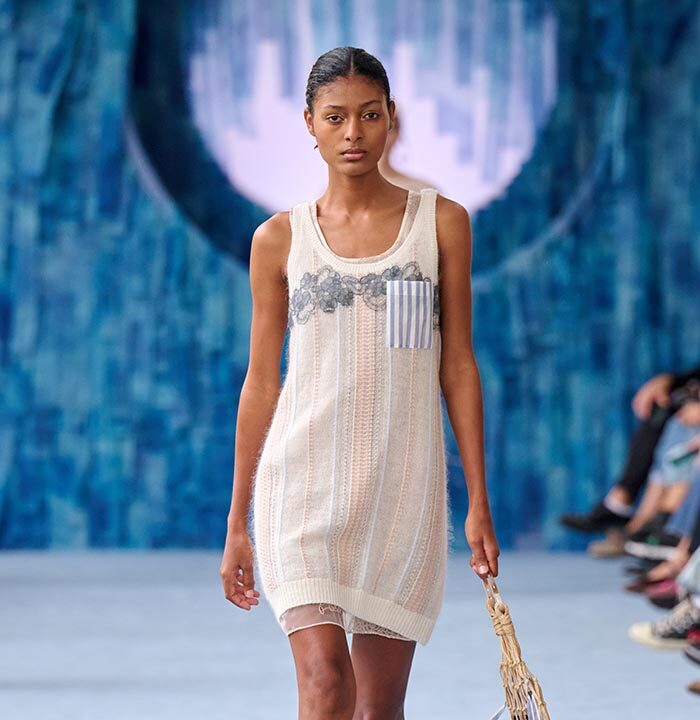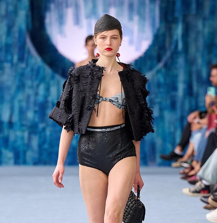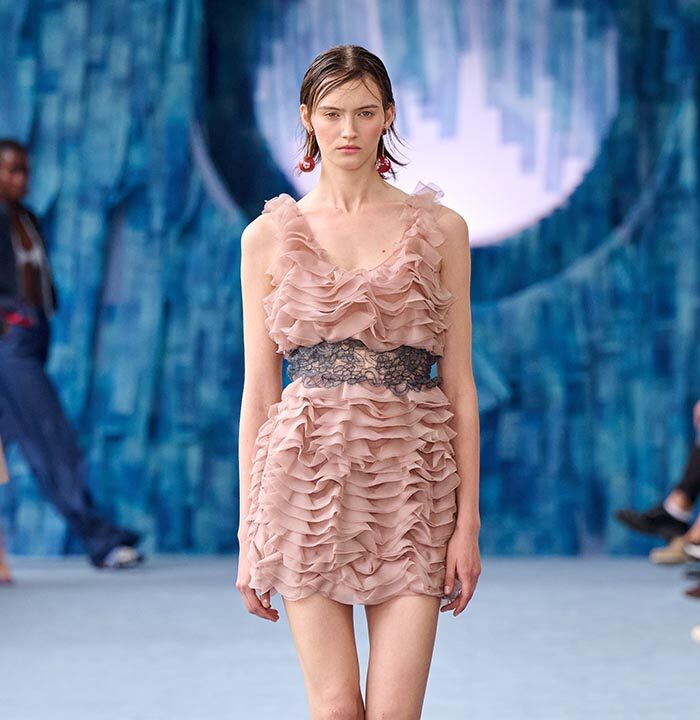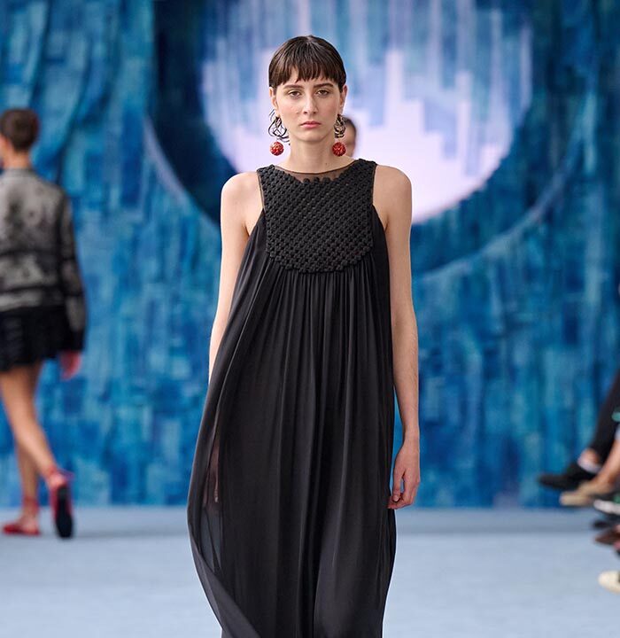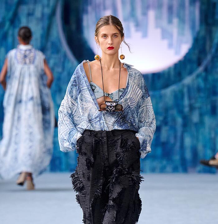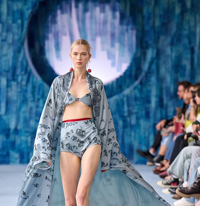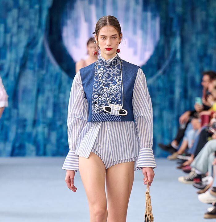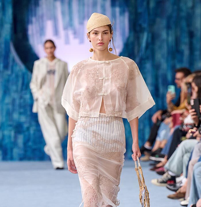 Similarly, with the SS25 collection HUI orchestrates present and past in a powerful and dynamic feminine dialogue, enriched by her harmonic vision in which the softness of her idea of haute couture merges with the rigor of Italian-style design to achieve an impactful collision capable of contaminating universes seemingly at opposites. The result is a style in motion in which the simplicity and cleanliness of Western ancestry are mirrored in the subtle delicacy of Eastern culture. Starting from the favorite chromatic base, blue, which refers to the vastness of the sea and the sky that is echoed, in reflection, by the depth and wisdom of women. A fashion “to plough the waves and seek the sun” that features women dressed in the gentle softness of silk and wrapped in the comfortable warmth of cotton, shining spokesmen of beauty and character.