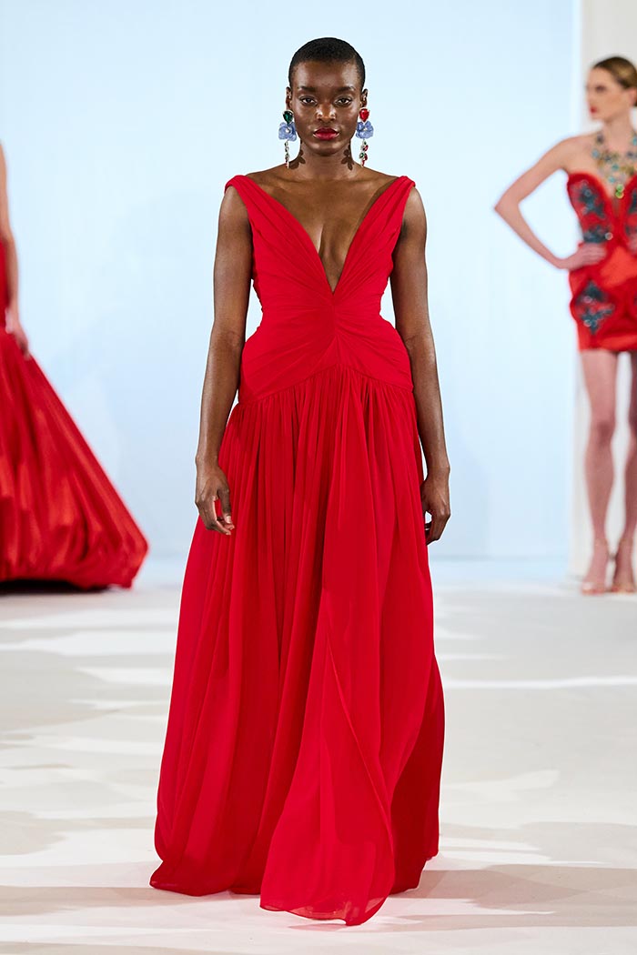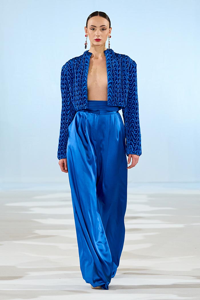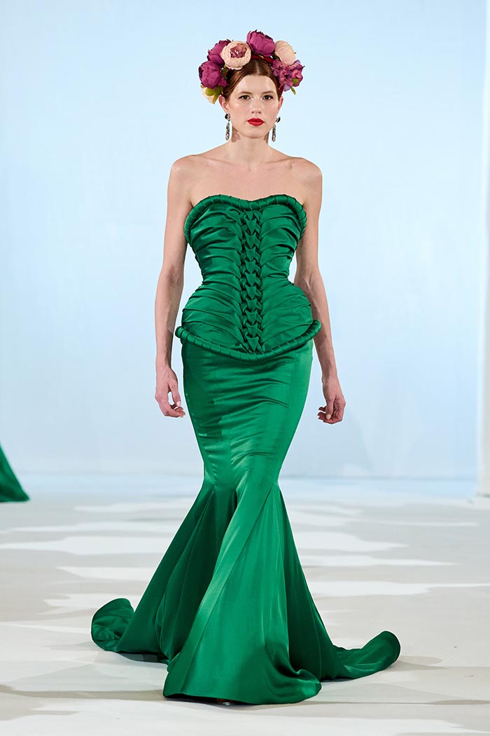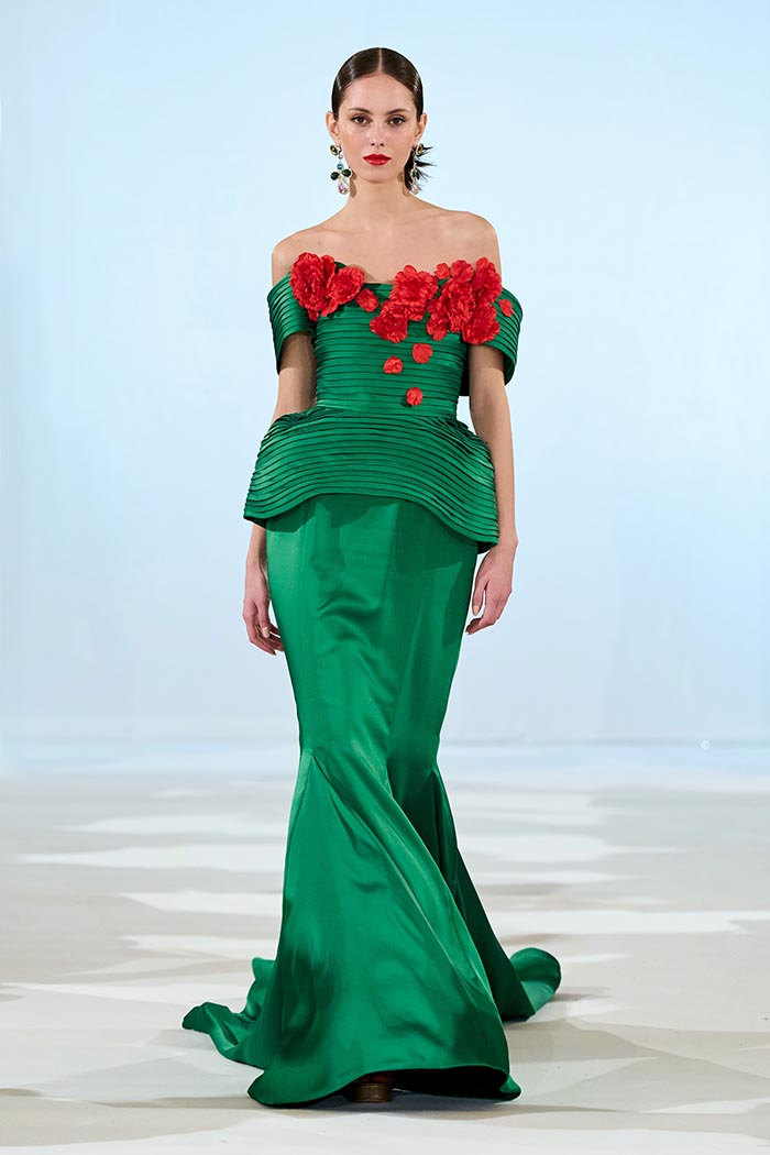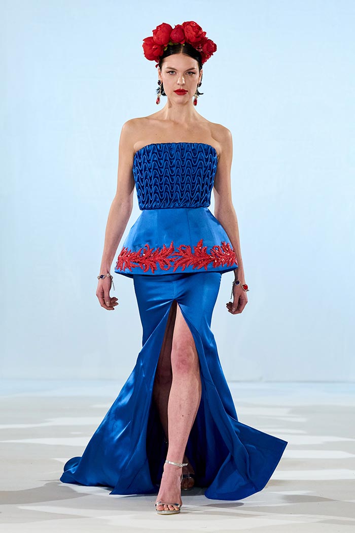 Spanish references unfold with subtle intensity — in the sculptural drape, the dynamic flow of lines, and allusions to flamenco, Mediterranean light, and trencadís mosaics. The color palette moves from ivory and green to deep red and dramatic black, accented by marine blue and muted gold, echoing the tones of Barcelona at sunset, as well as the paintings of Frida Kahlo, through their vivid and joyful hues.