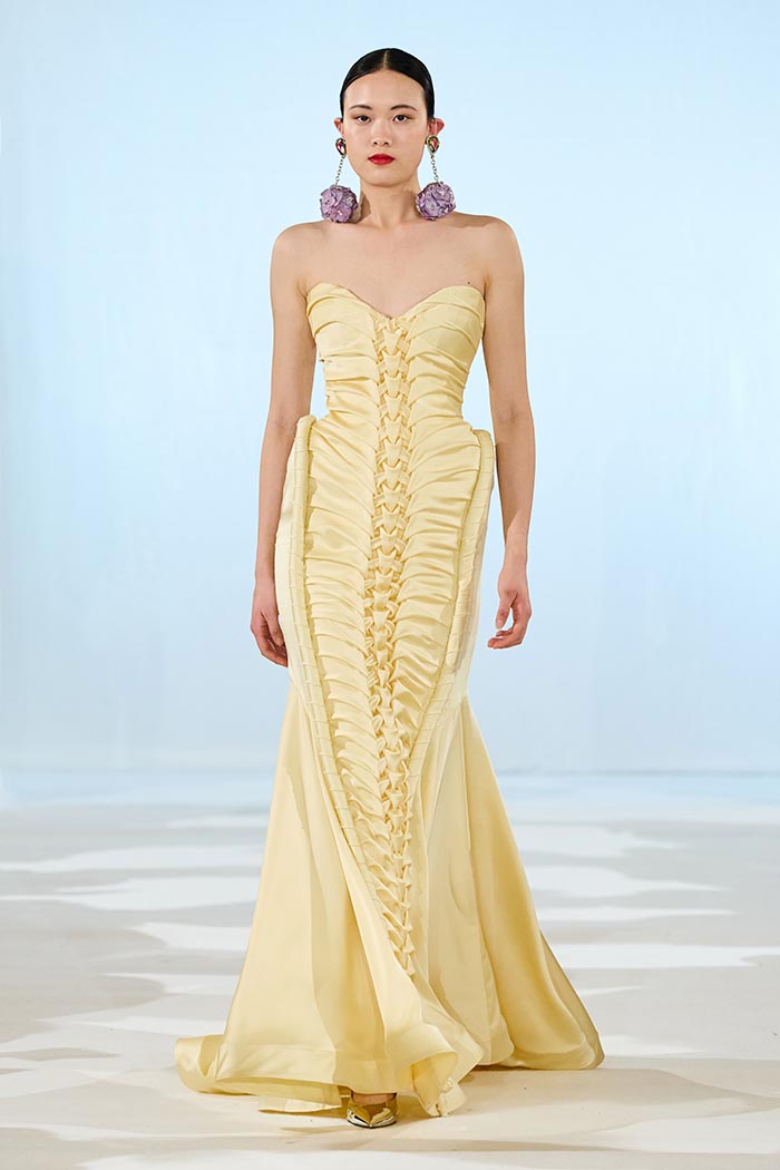 Reinterpreting the language of Catalan Modernism, the collection explores fluidity, asymmetry, and organic forms. Silhouettes appear instinctive rather than constructed, shaped by movement, air, and light. Each piece functions as a sculptural statement — couture conceived as living architecture.