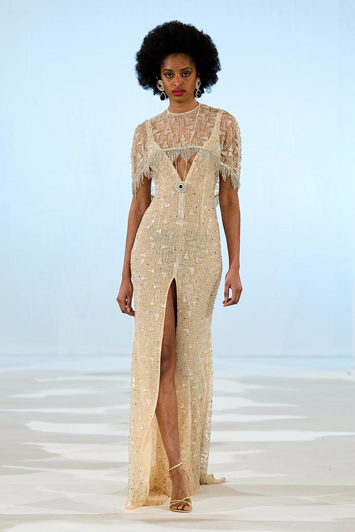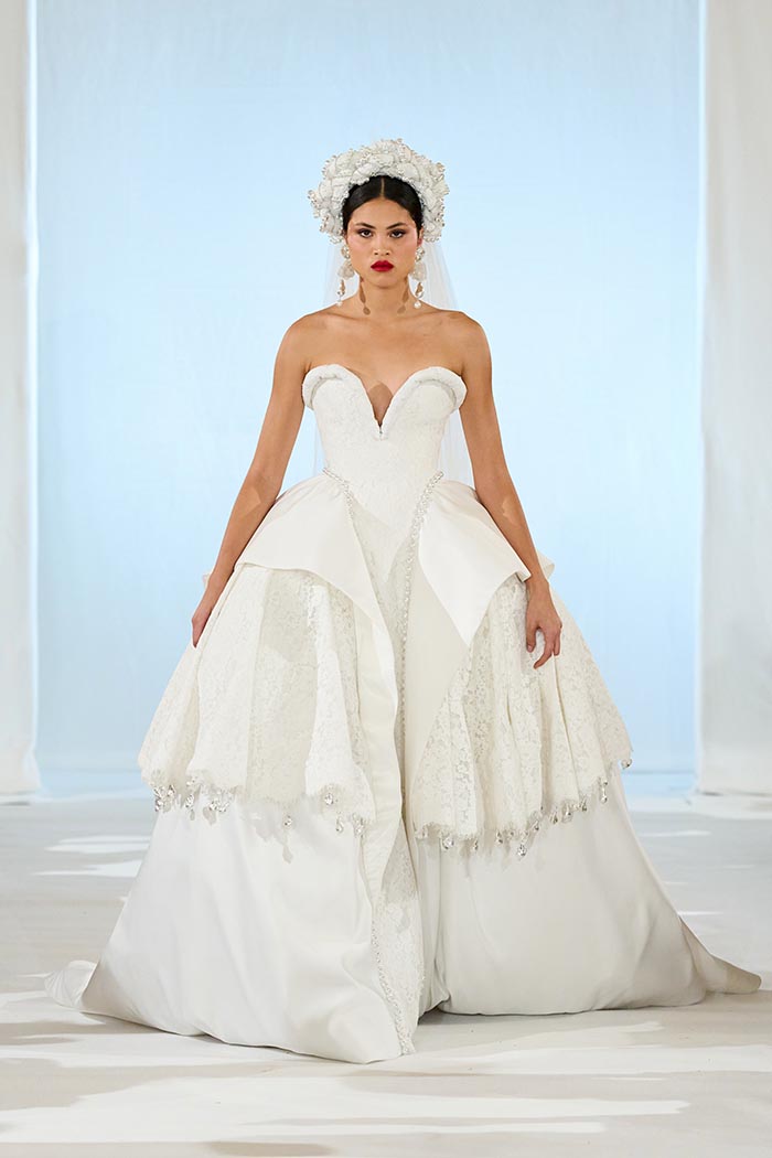 The influence of the Sagrada Família emerges through transparency and luminosity. Layers of chiffon, organza, and lace create a stained-glass effect that drifts across the body, while intricate hand embroidery introduces rhythm, texture, and a sense of continuity.