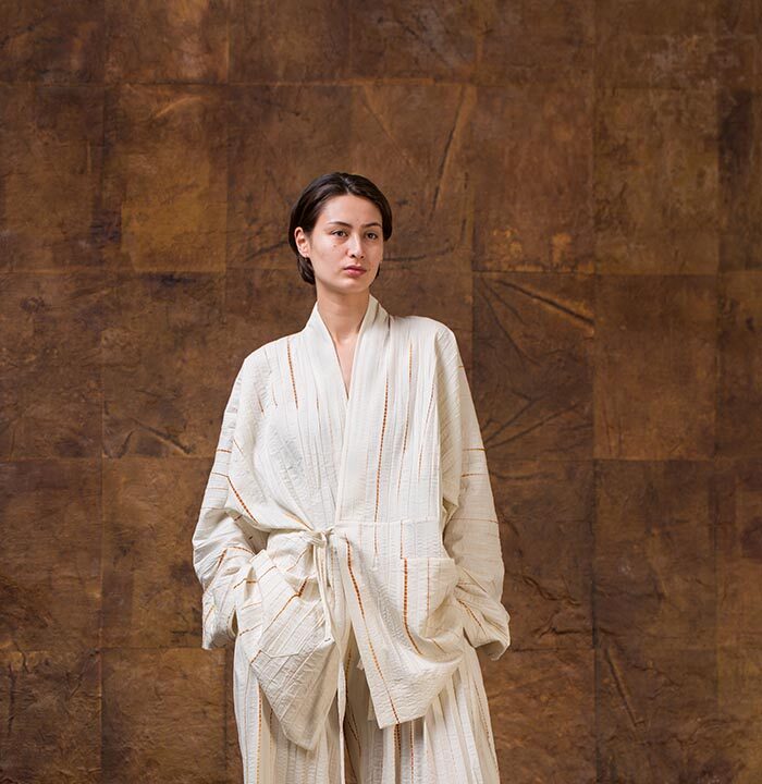 For the finale, Jan-Jan wanted to surprise his audience with the 24 models lined up in front of the ancient frescos on the walls of the graceful Santa Maria Novella cloister, matching and blending the color palette of the silhouettes, merging the ancient and the contemporary.