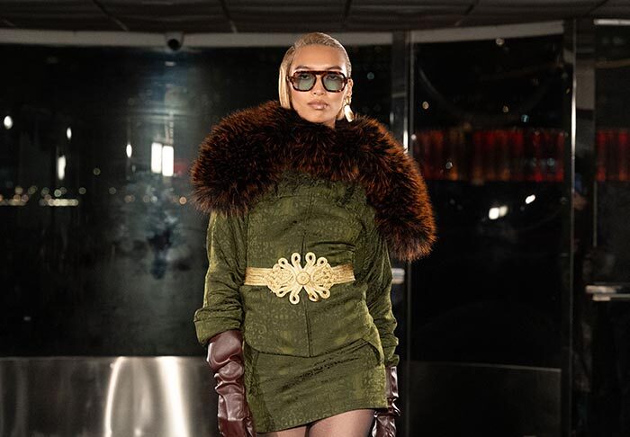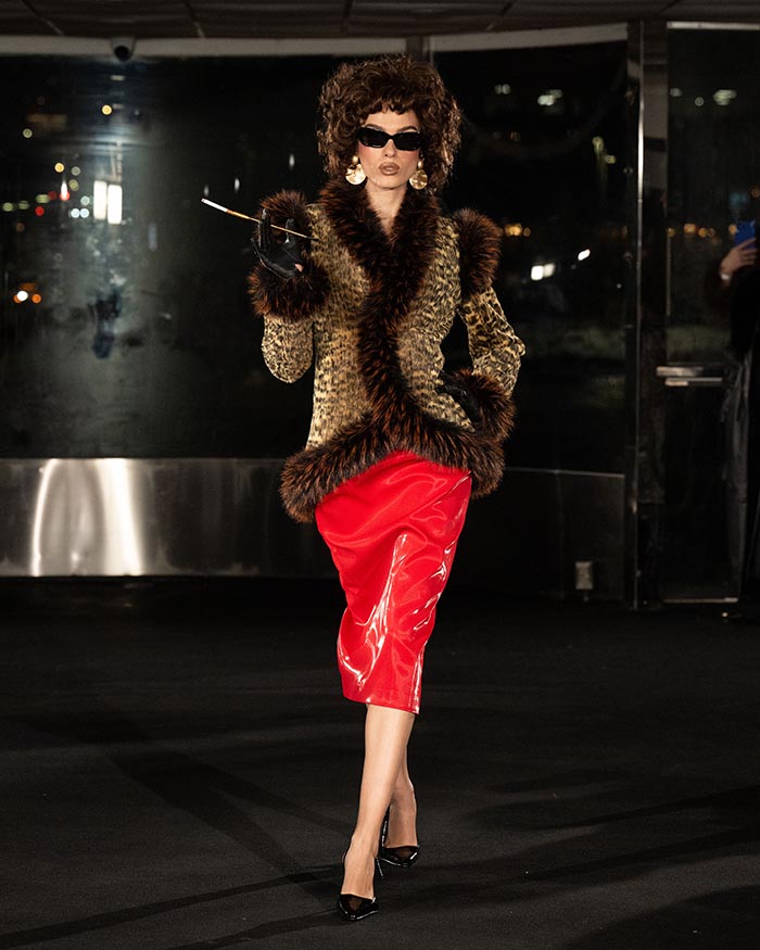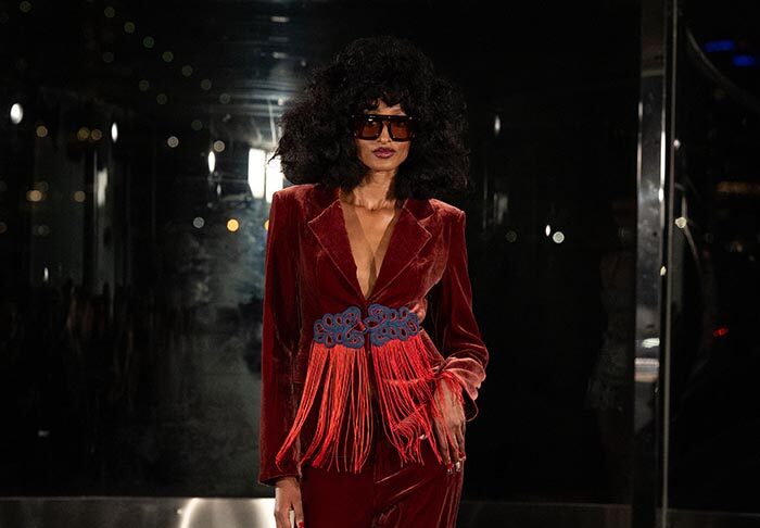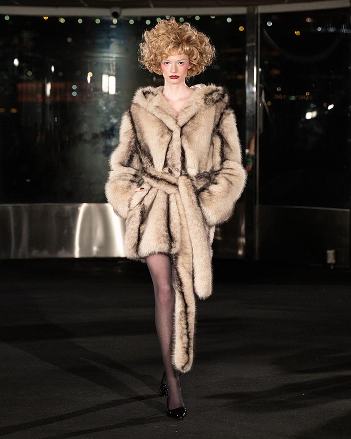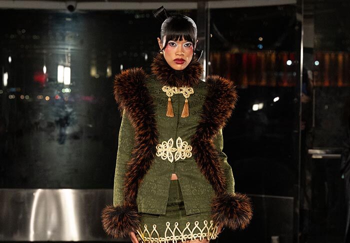 Inspired by the migratory history of Mongolia, the collection draws on a culture shaped by continual movement across vast and often unforgiving terrain, where knowledge, craft, and identity traveled far beyond their origins. Shui translated this lineage through a material language centered on transformation. Early silhouettes appeared insulated and protective, constructed in thick velvet, felt, suede, leather, and faux fur in warm tonal palettes. As the show progressed, they gave way to more opulent expressions rendered in gold and silver metallic finishes, saturated reds and greens, jewel toned silks, animal prints, and luminous surfaces accented with oversized metal jewelry and beaded detailing.