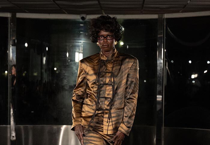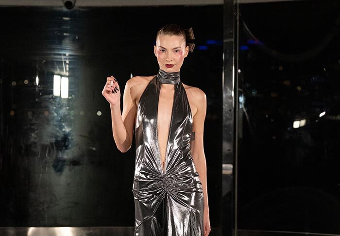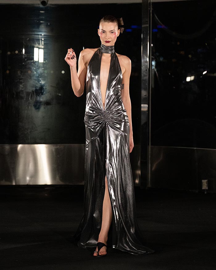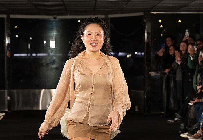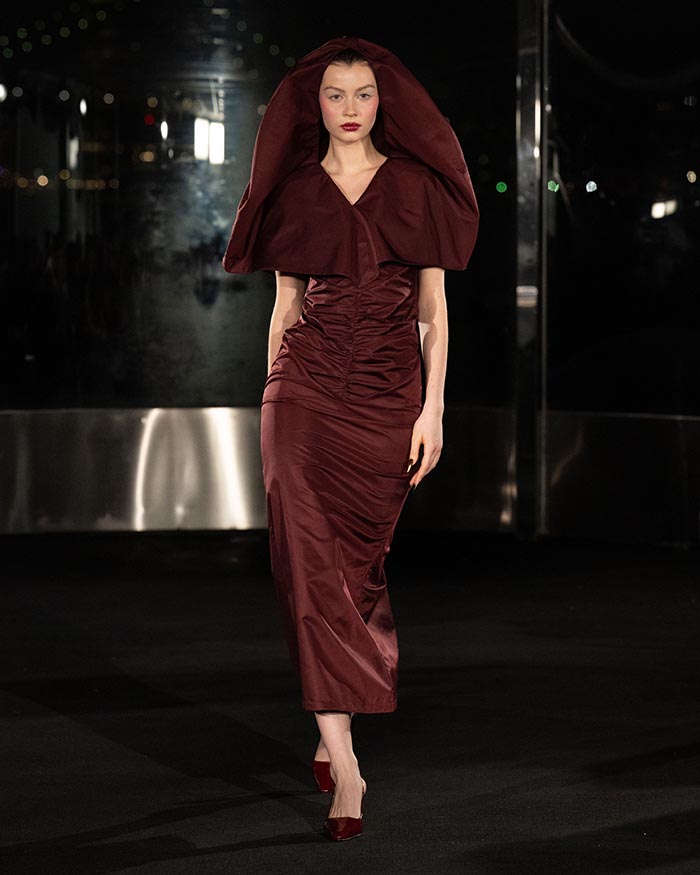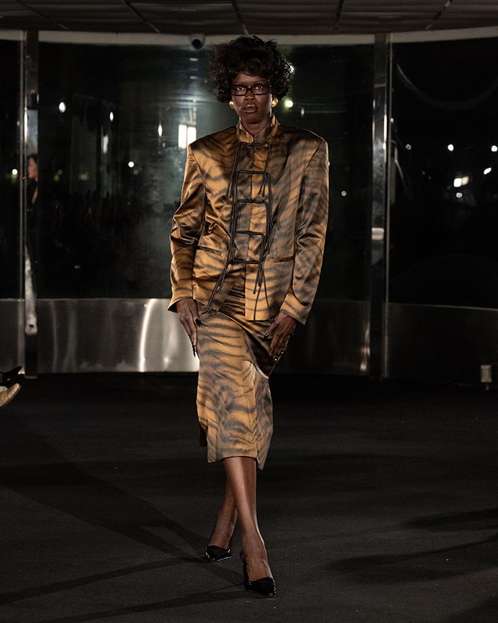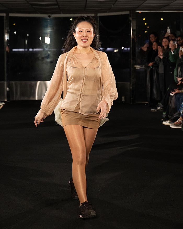 Movement remained central to the staging. The vessel itself became a contemporary counterpart to the horse, a symbol of mobility through which the garments unfolded in real time. As models walked, a live guzheng performance by Nico Huzella resonated across the space, its layered strings creating a rhythmic undercurrent that mirrored the collection’s themes of continuity and transformation. This was followed by “Angel” by Massive Attack, whose atmospheric bassline shifted the mood from meditative to cinematic as the show progressed. Attendees experienced the show from within this shifting environment, not as distant spectators, but as participants moving alongside it. The setting reinforced a central idea: progress does not require fixed ground. It is ongoing, fluid, and in constant motion. This spirit extended to the runway casting as well. Long recognized for championing representation, Shui brought together a diverse range of bodies, identities, and lived experiences this season, reinforcing her vision of femininity as multifaceted, inclusive, and constantly evolving.