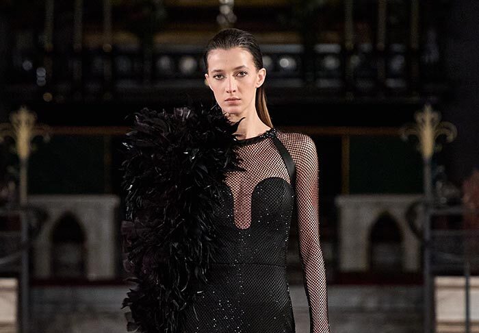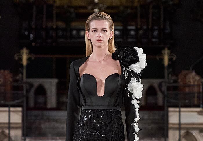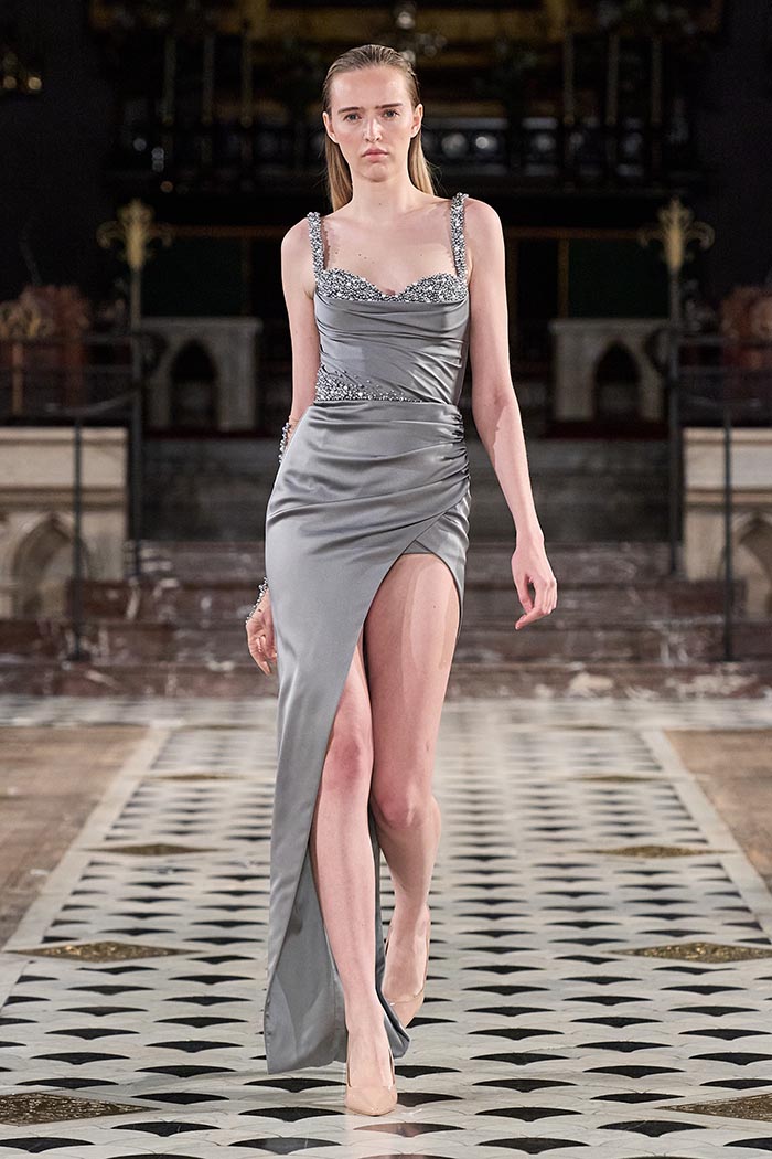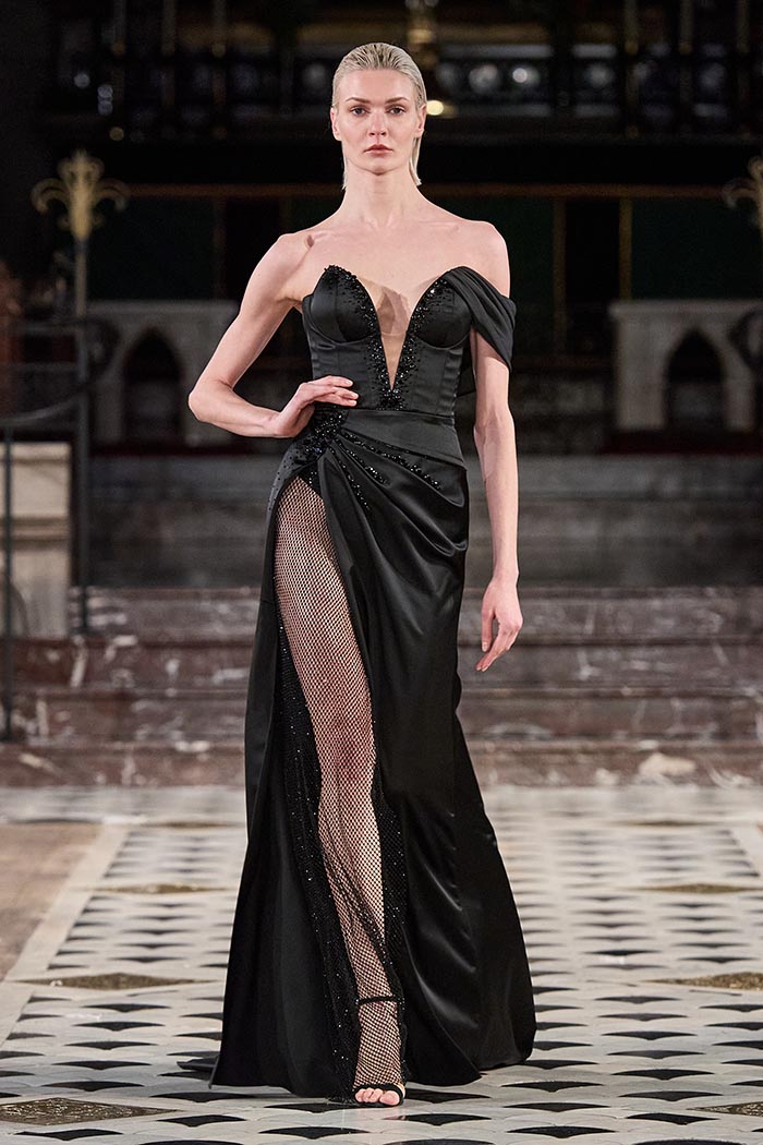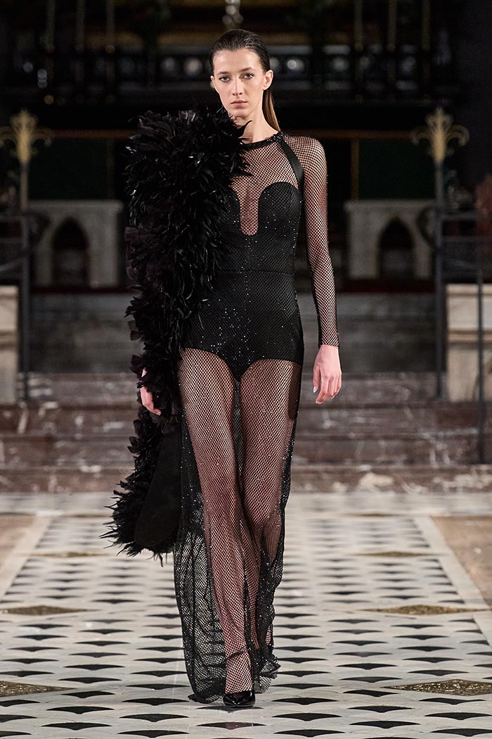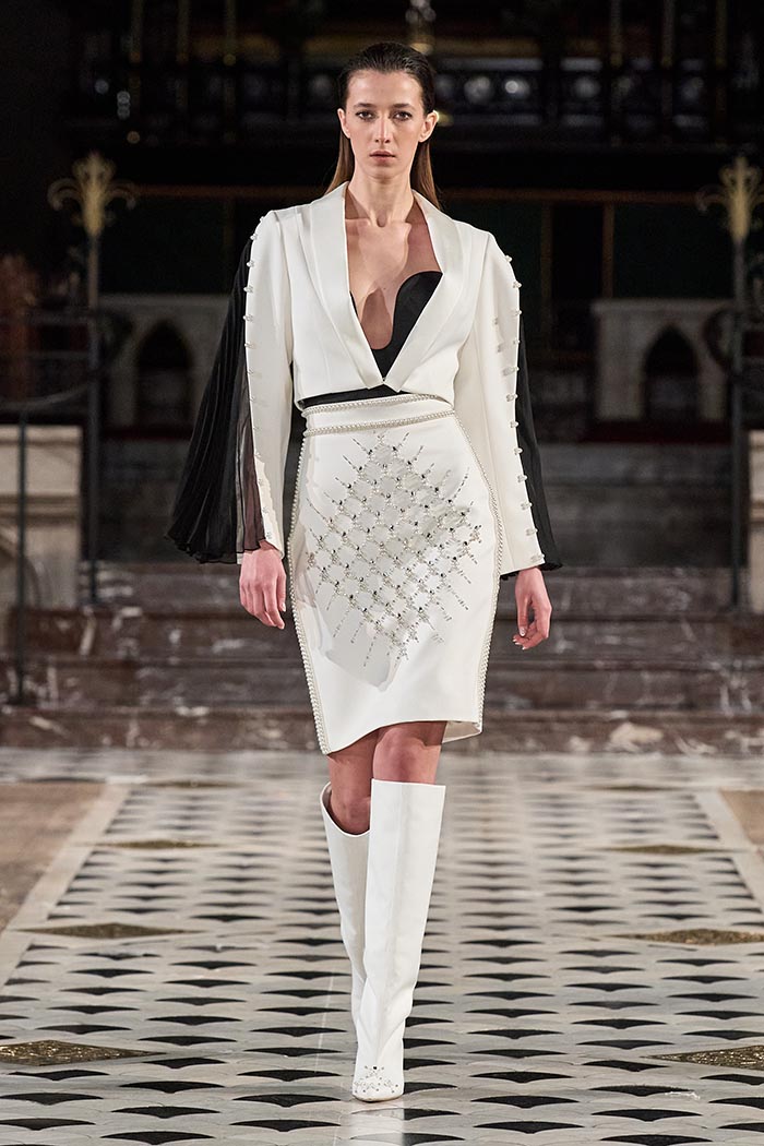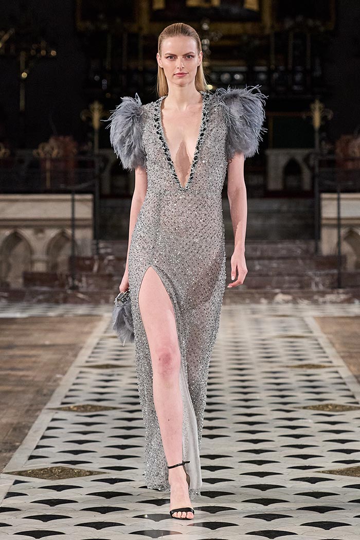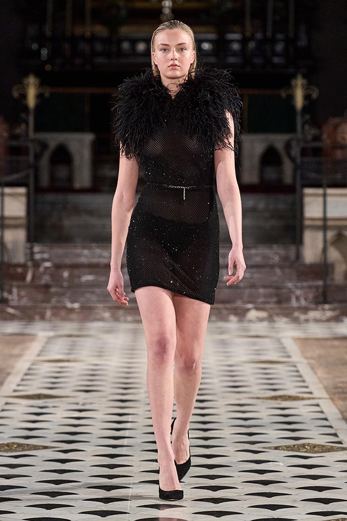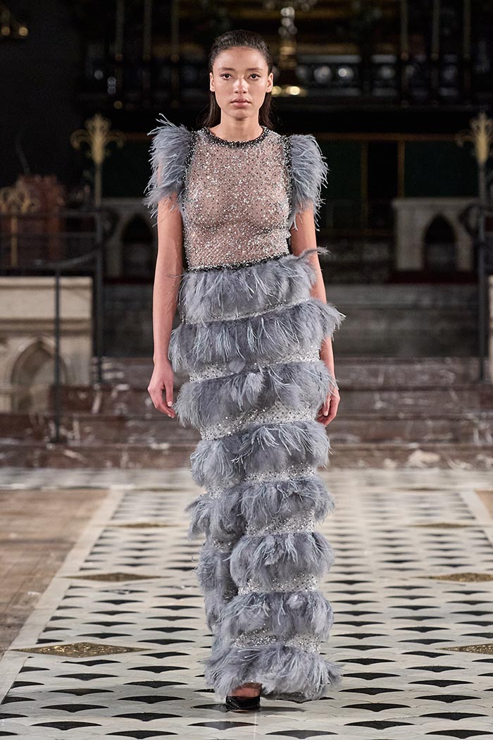 The collection consists of 20 models. The beginning of the collection are black and white models of a cocktail set supplemented with hand-made organza flowers, a tuxedo and a black and white set with hand-sewn pearl patterns. Models of grey, crystal dresses supplemented with ostrich and swan feathers.