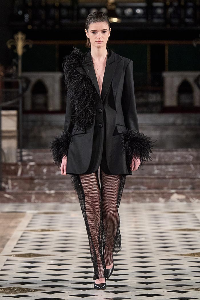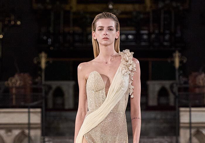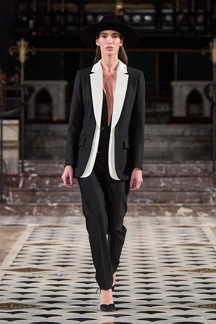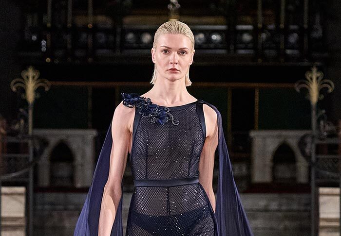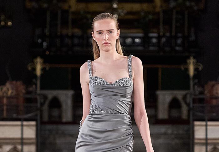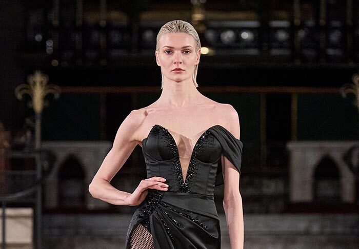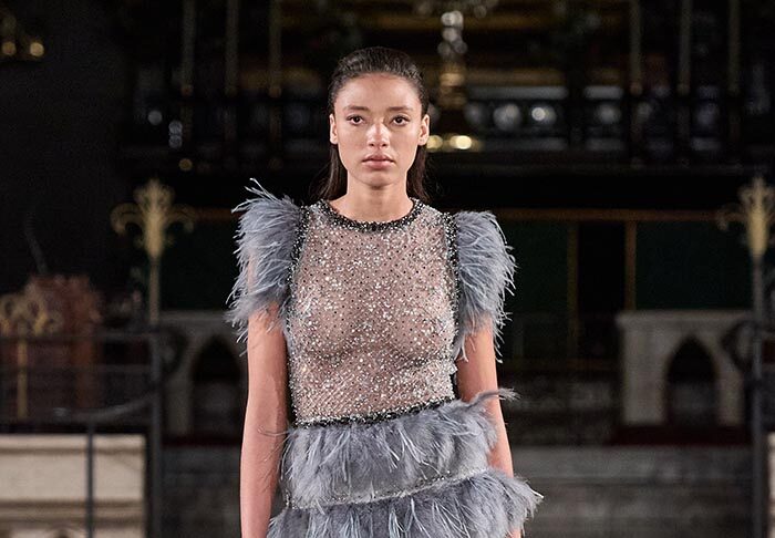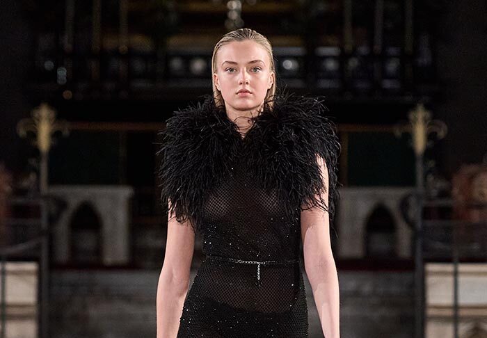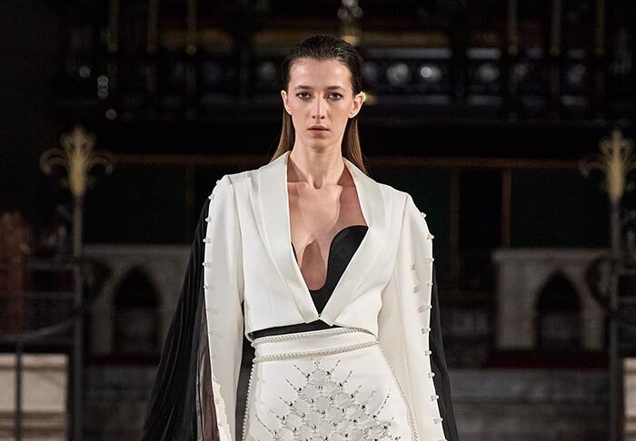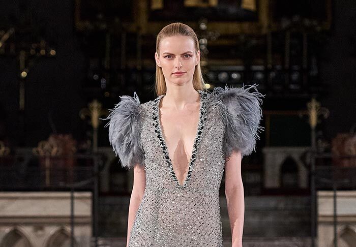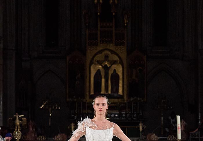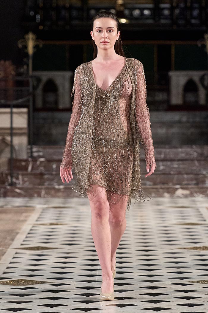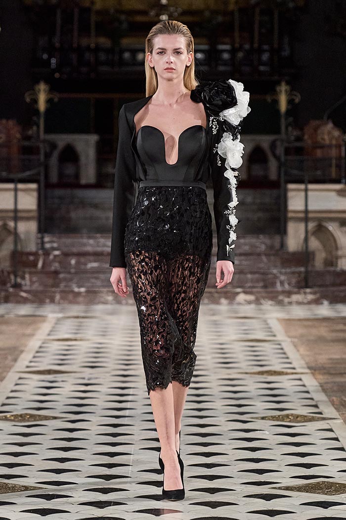 The collection consists of 20 models. The beginning of the collection are black and white models of a cocktail set supplemented with hand-made organza flowers, a tuxedo and a black and white set with hand-sewn pearl patterns. Models of grey, crystal dresses supplemented with ostrich and swan feathers.
