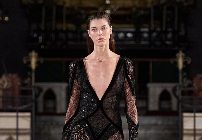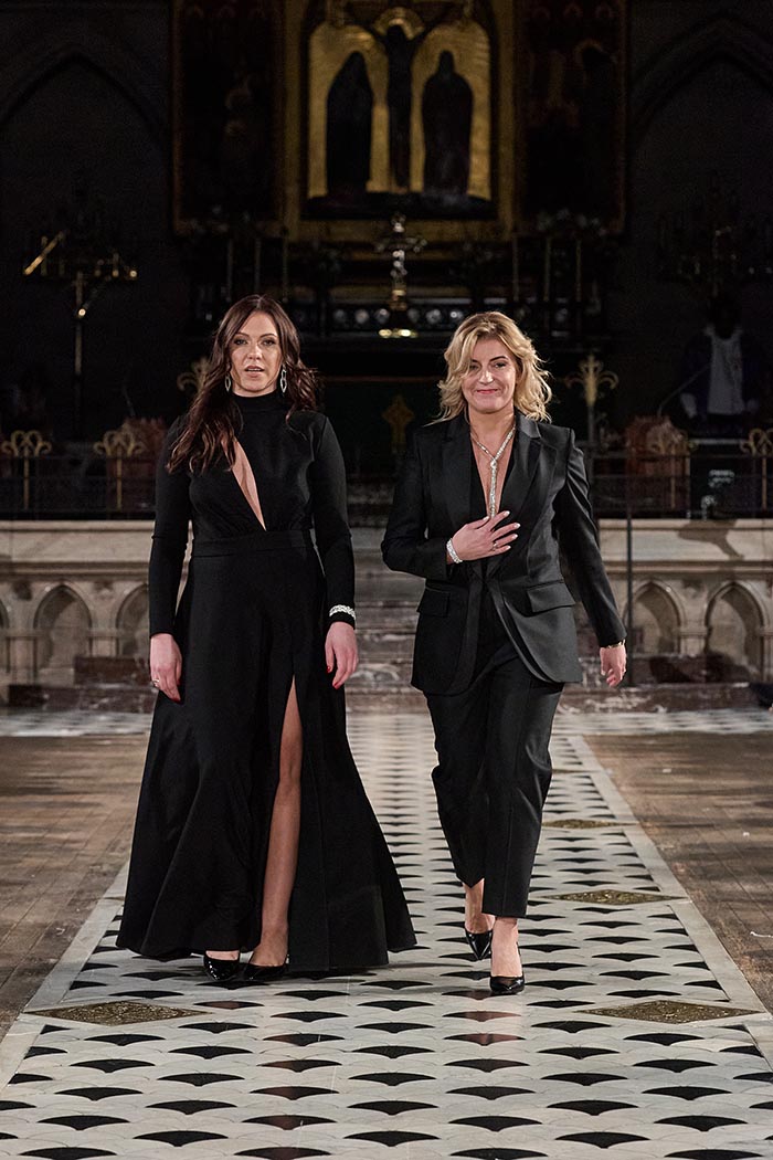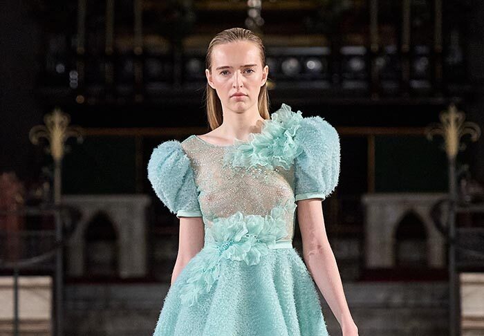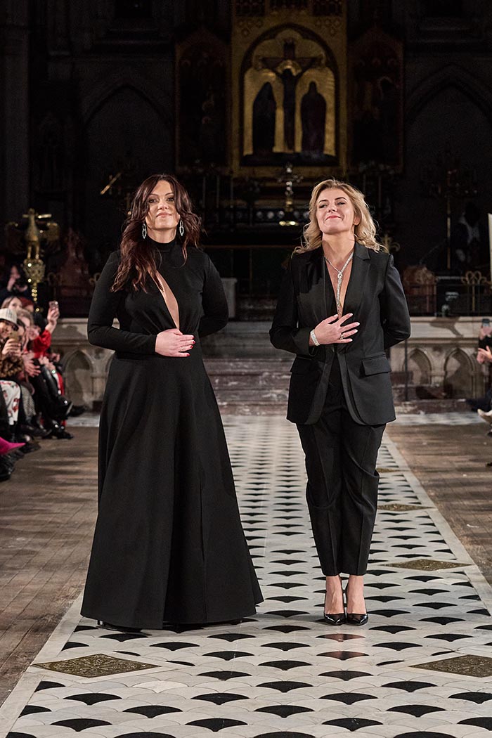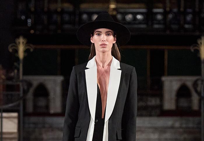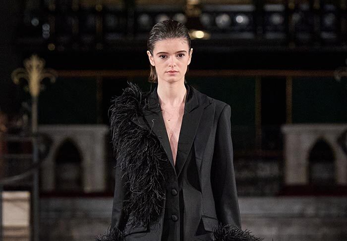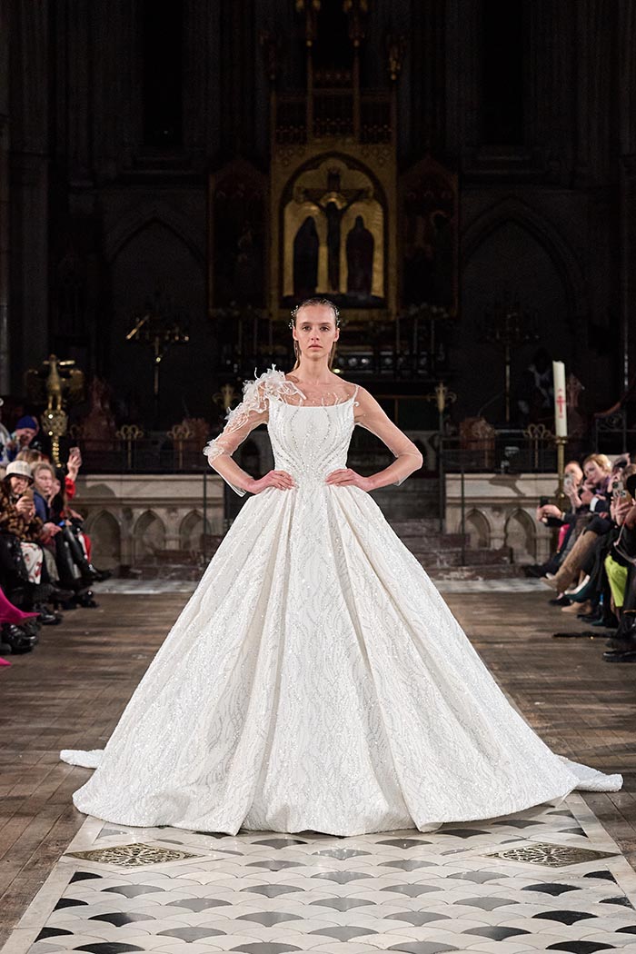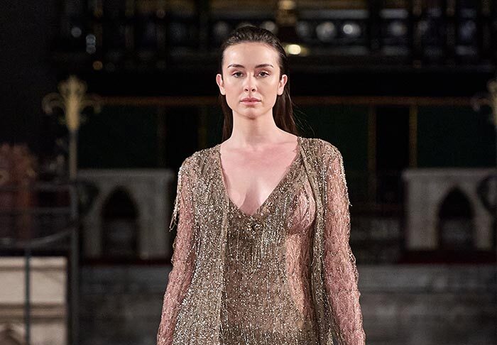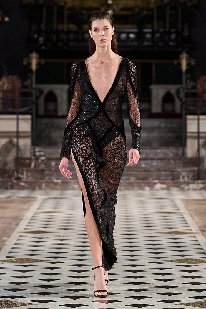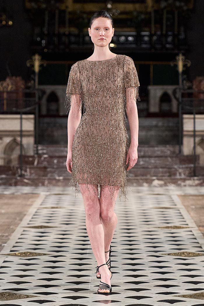 The collection consists of 20 models. The beginning of the collection are black and white models of a cocktail set supplemented with hand-made organza flowers, a tuxedo and a black and white set with hand-sewn pearl patterns. Models of grey, crystal dresses supplemented with ostrich and swan feathers.
